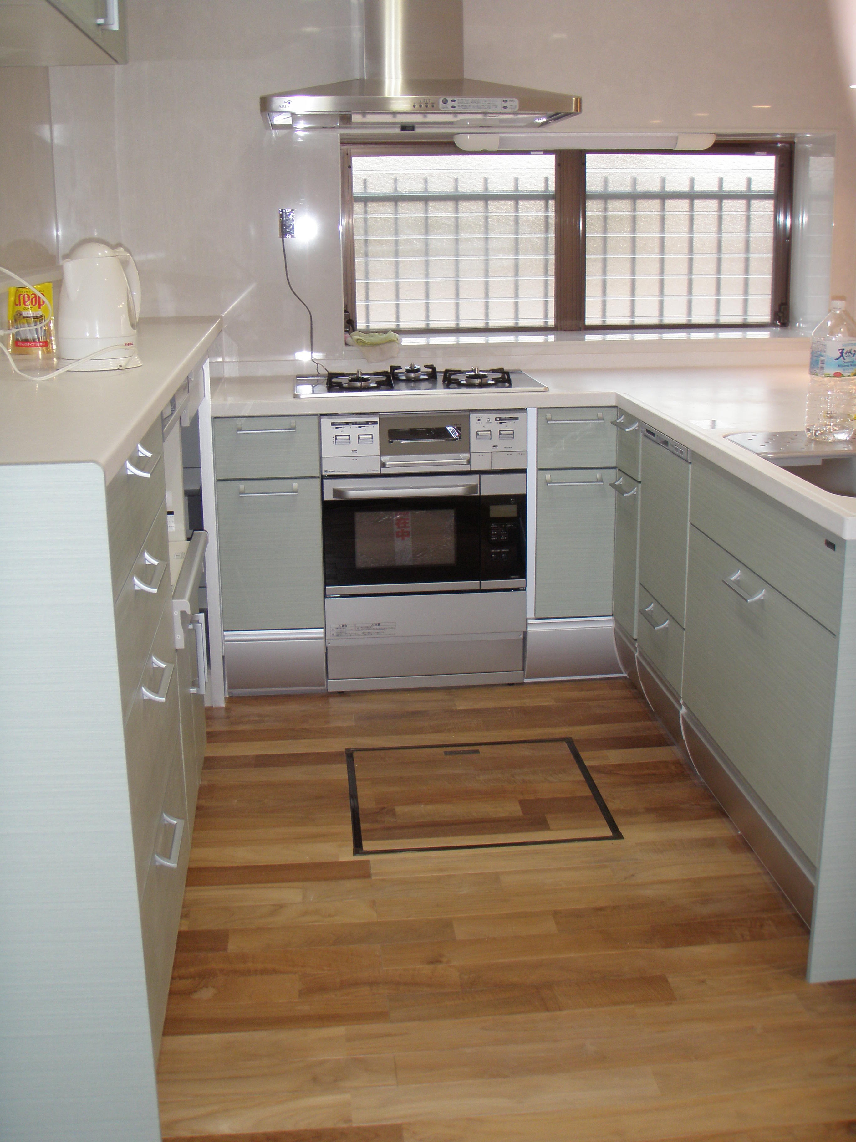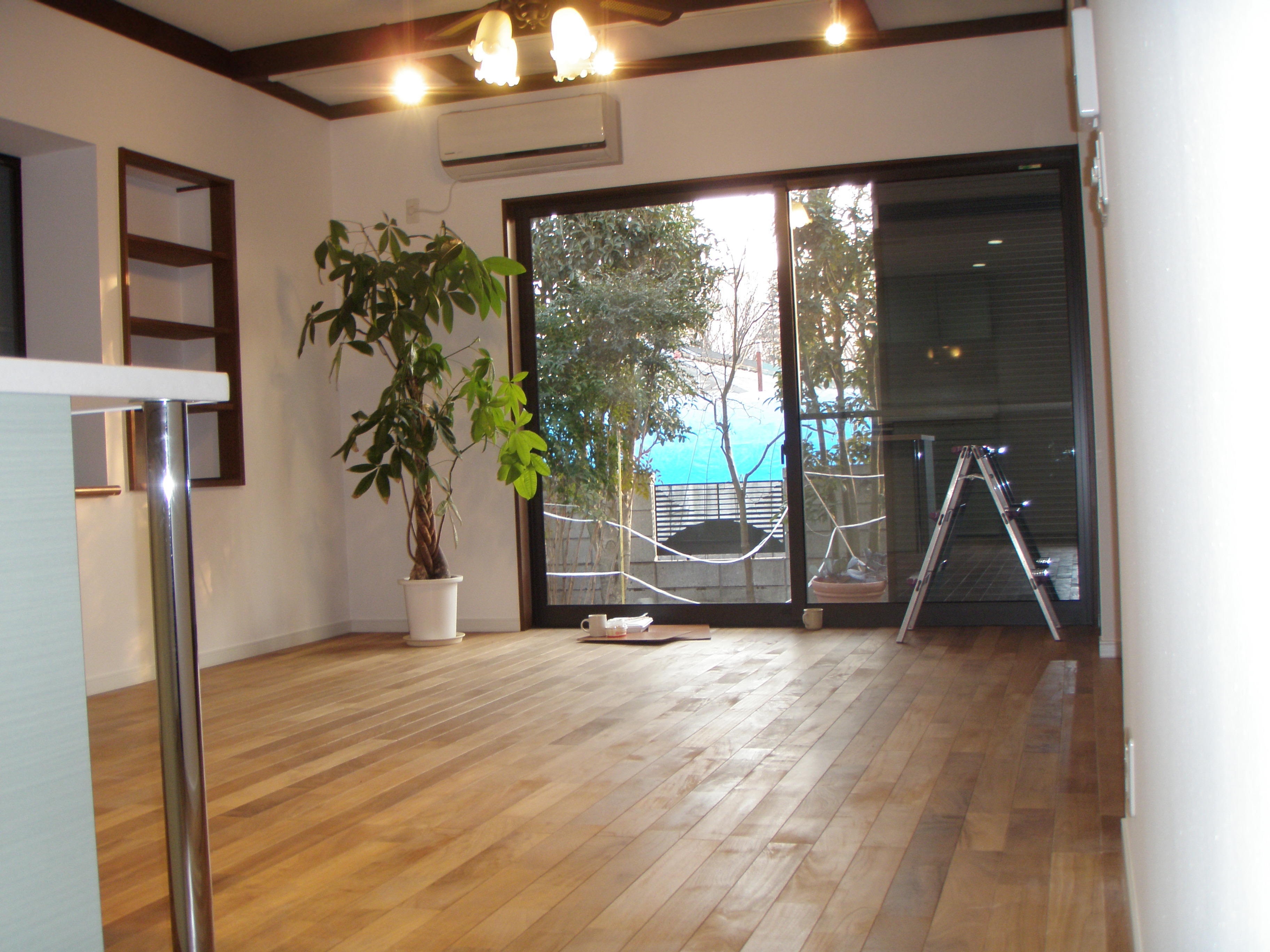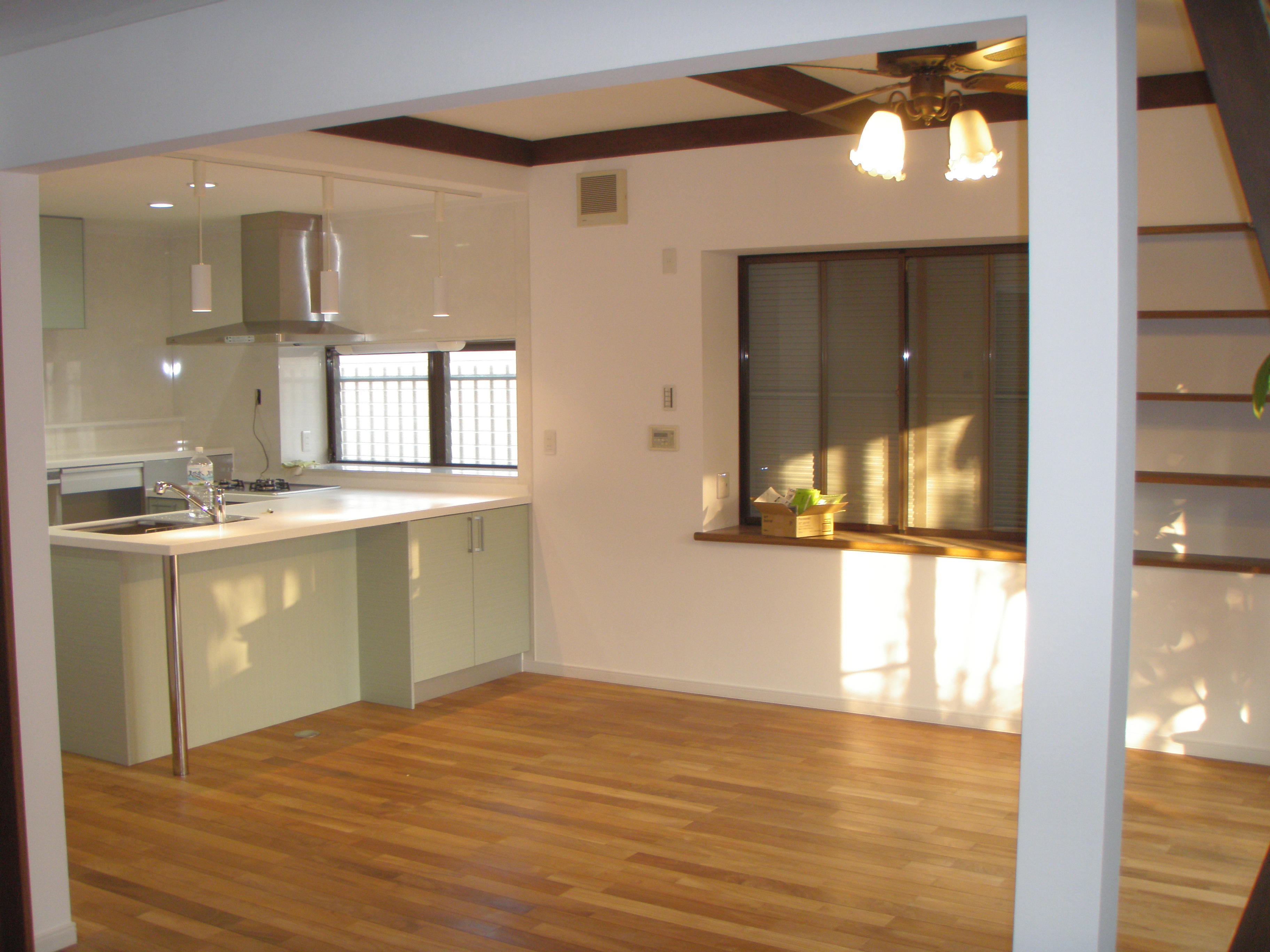 リビングダイニングも合わせてリフォームさせていただきました。無垢床フローリングで暖かな印象、天井の梁も少し表しにしたので、天井高が以前よりも高くなり、広々とした空間になりました。