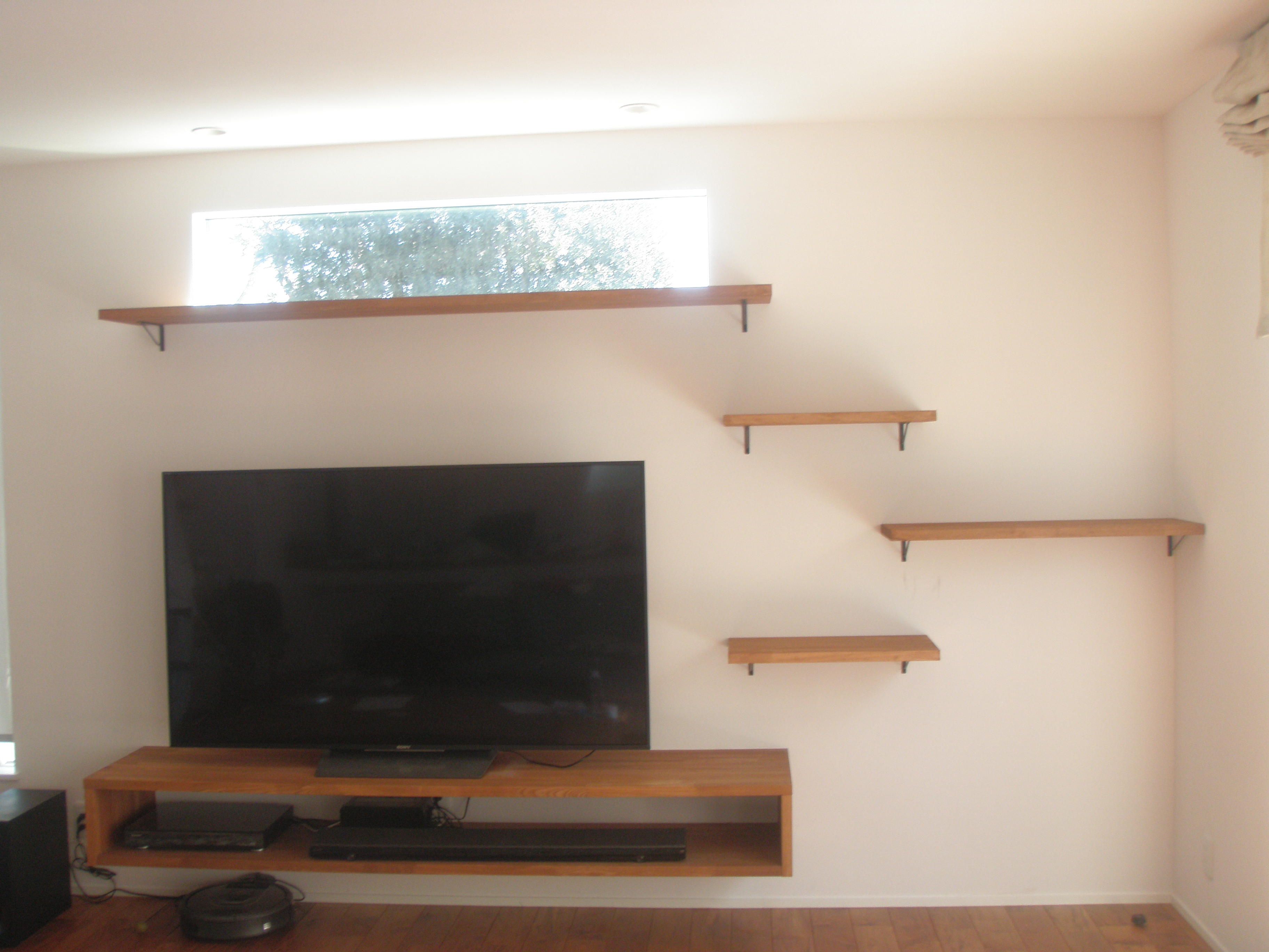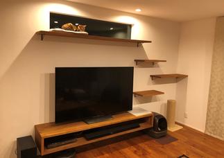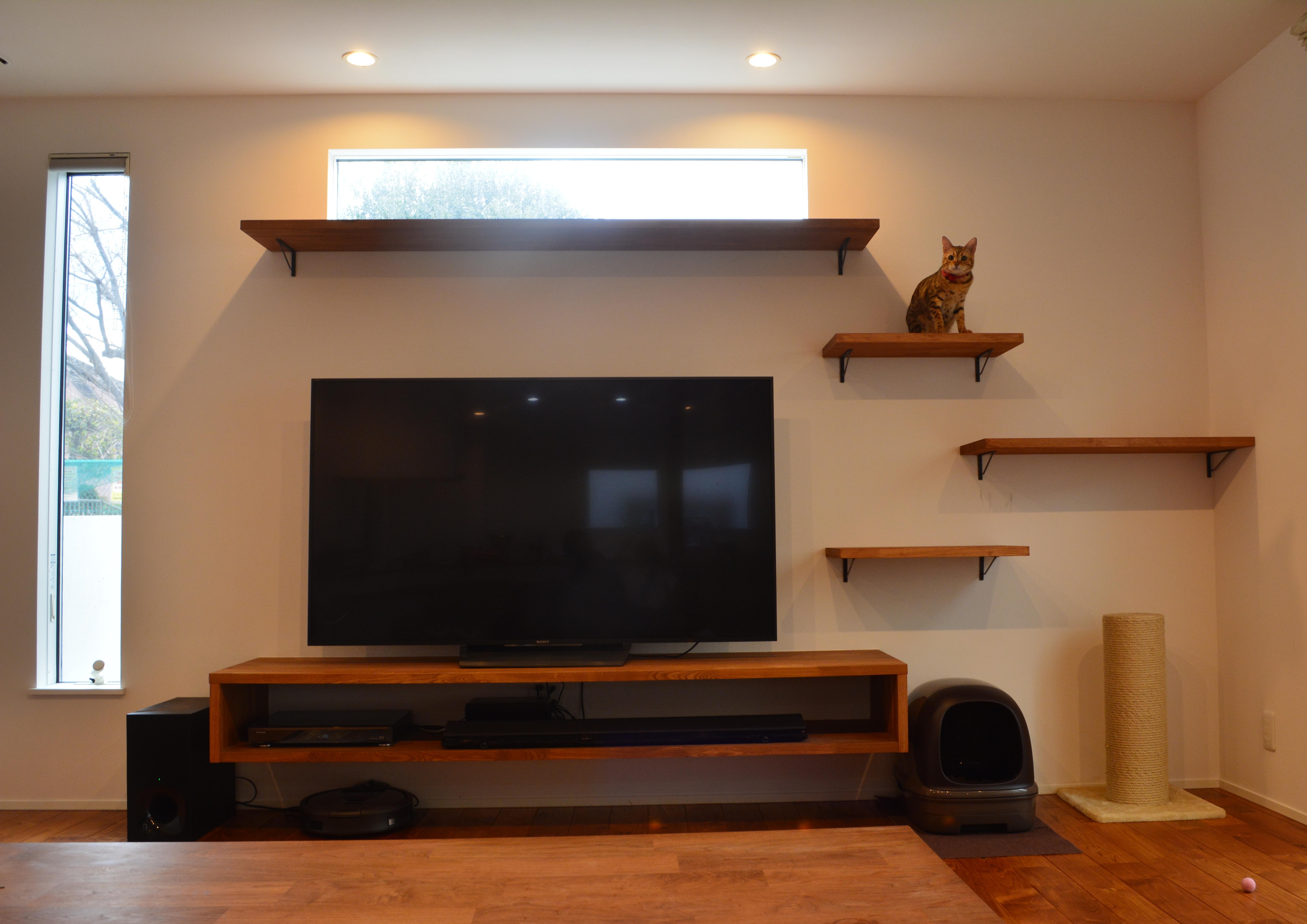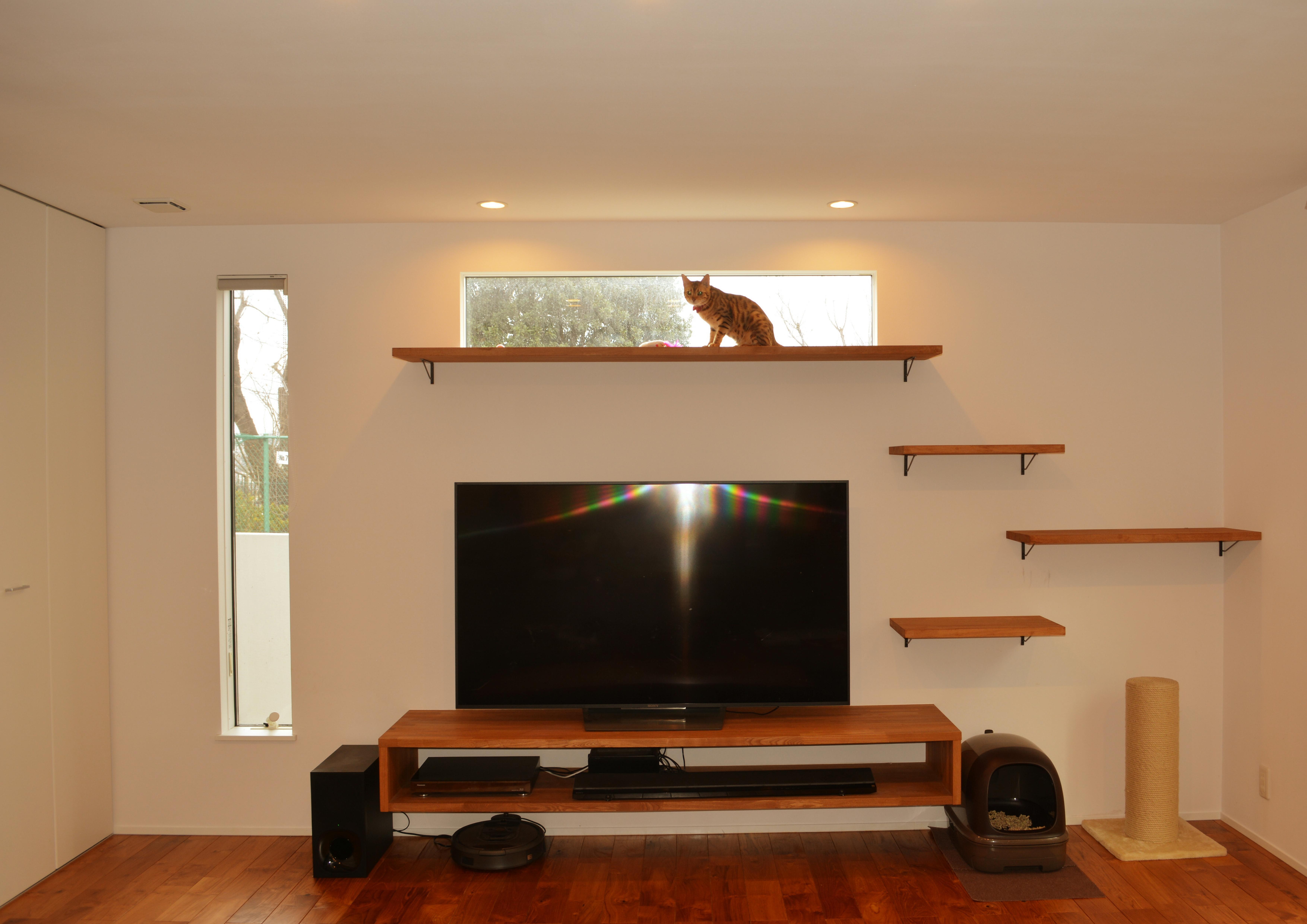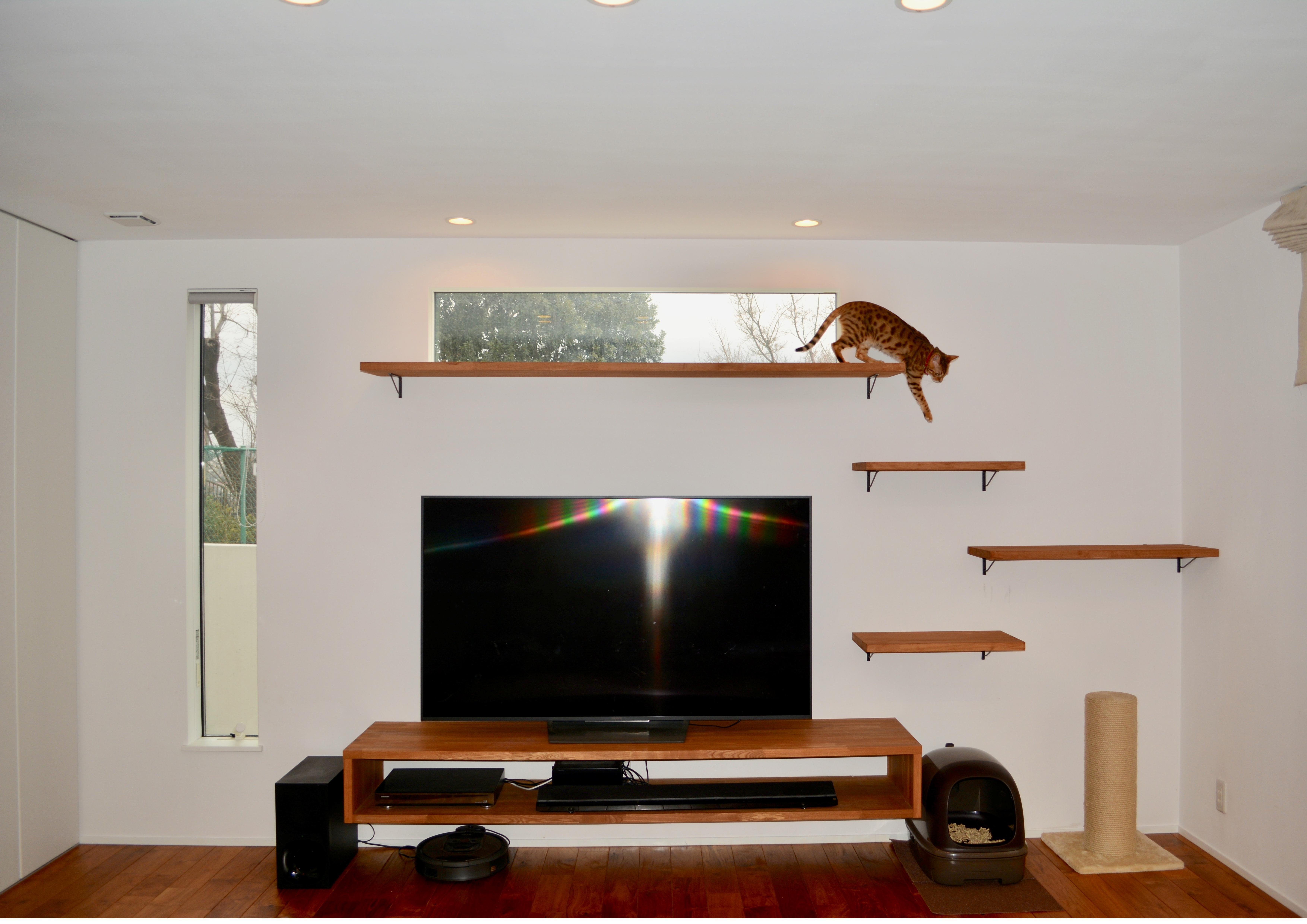 市販のキャットタワーを使っていたそうですが、だいぶ傷んでしまった為、壁を利用して何とかできないかと相談をいただきました。棚板としてよく使っている集成材の板とアイアンのブラケットを壁に取付け、キャットウォークにしてみたところ、お客様に(もちろん猫のすーちゃんにも)大変喜んでいただきました。