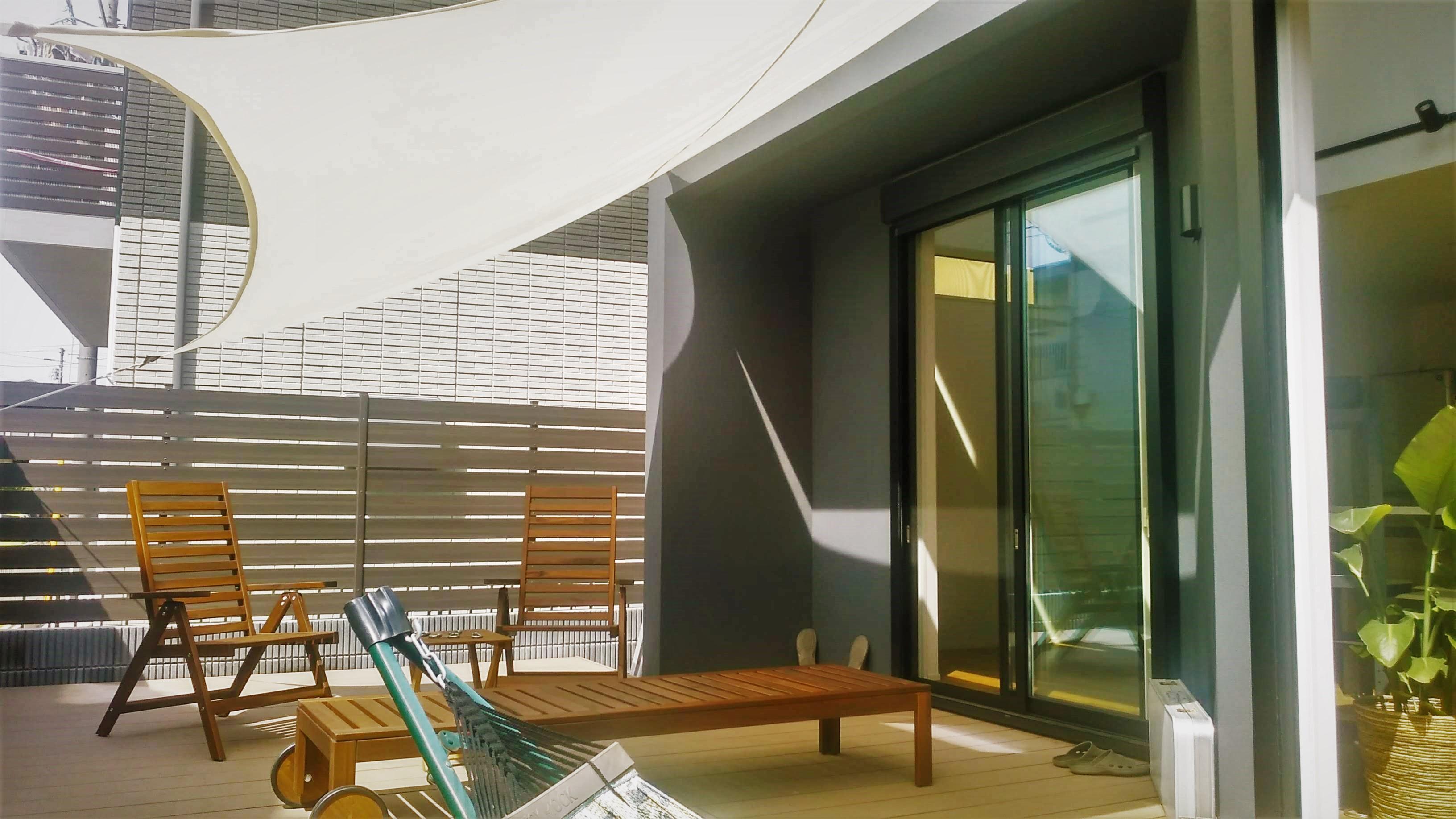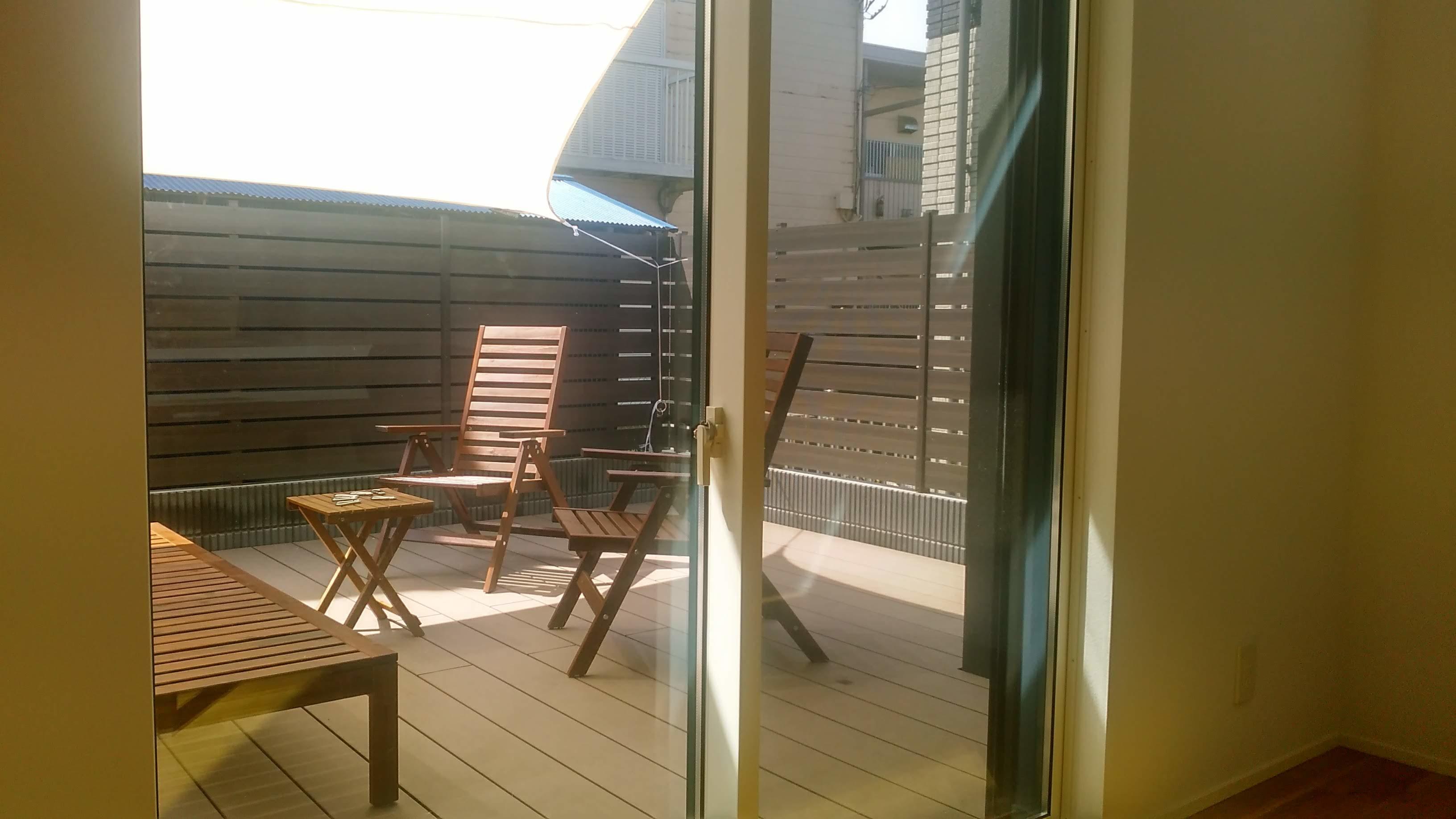 ステキなお家とデッキができましたが、近隣の風景と日射が気になり・・・、シェードの取付けをご提案させていただきました。実際につけてみたら、ねらい通りで、視線も熱さも気にならなくなり、とってもいい感じになりました。
