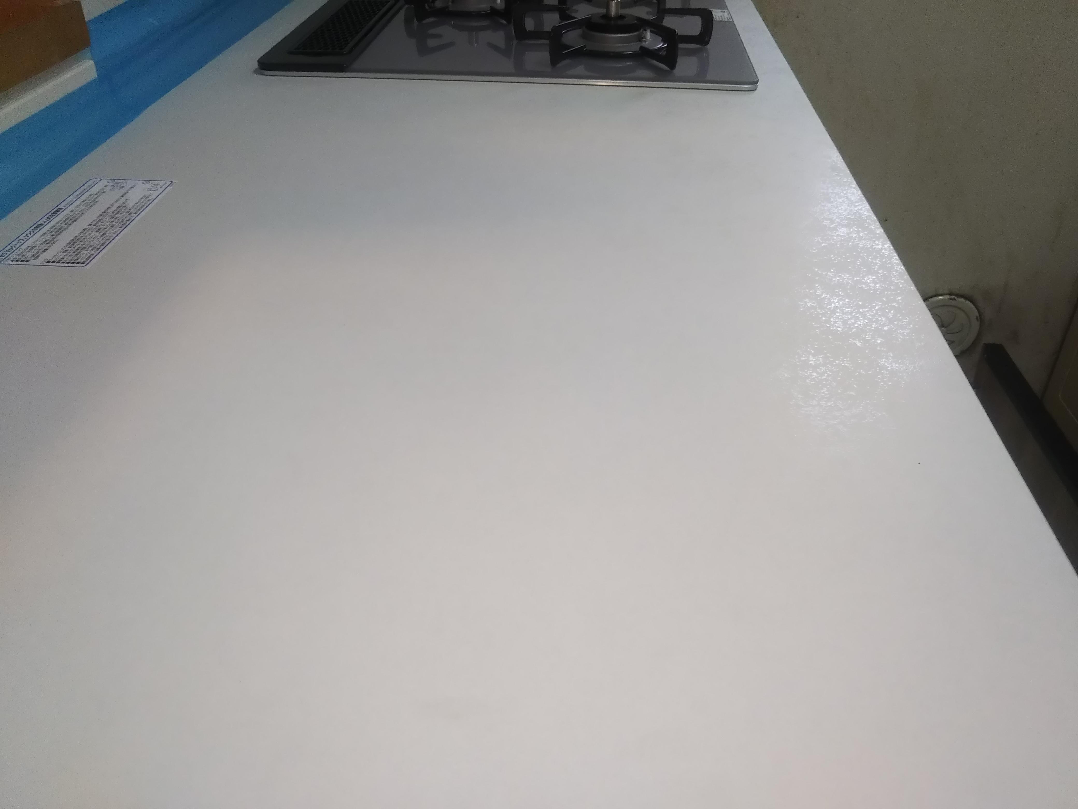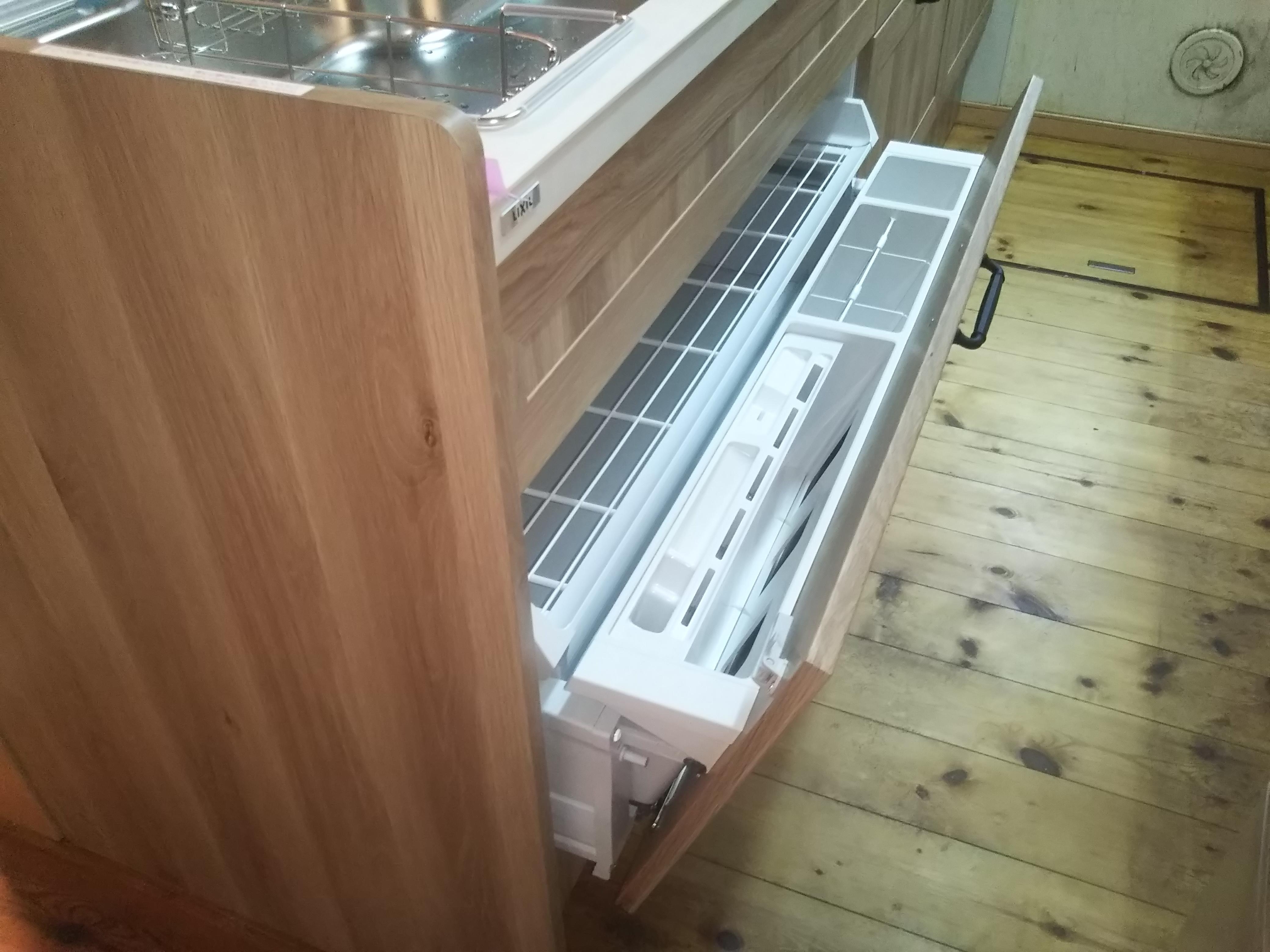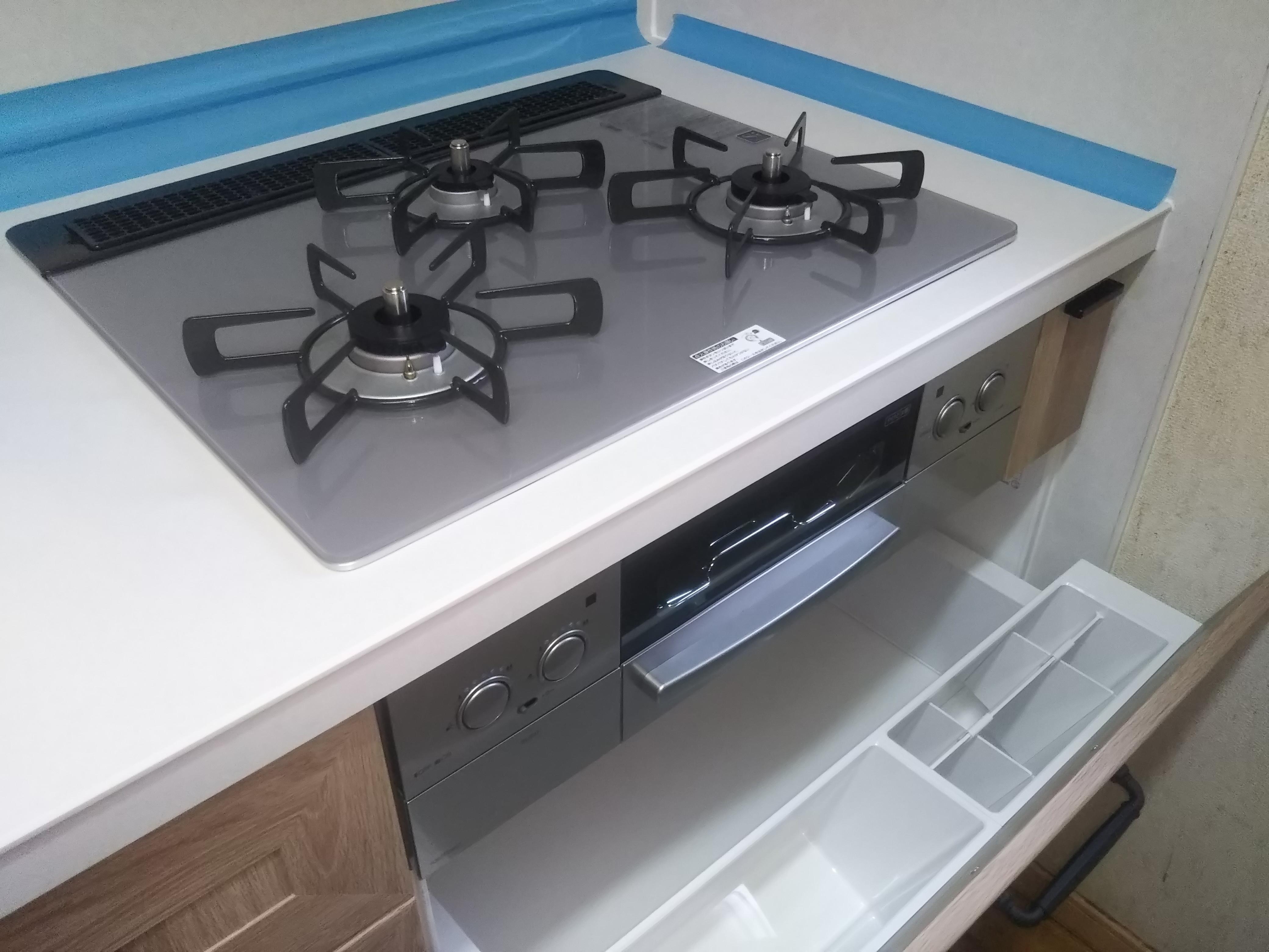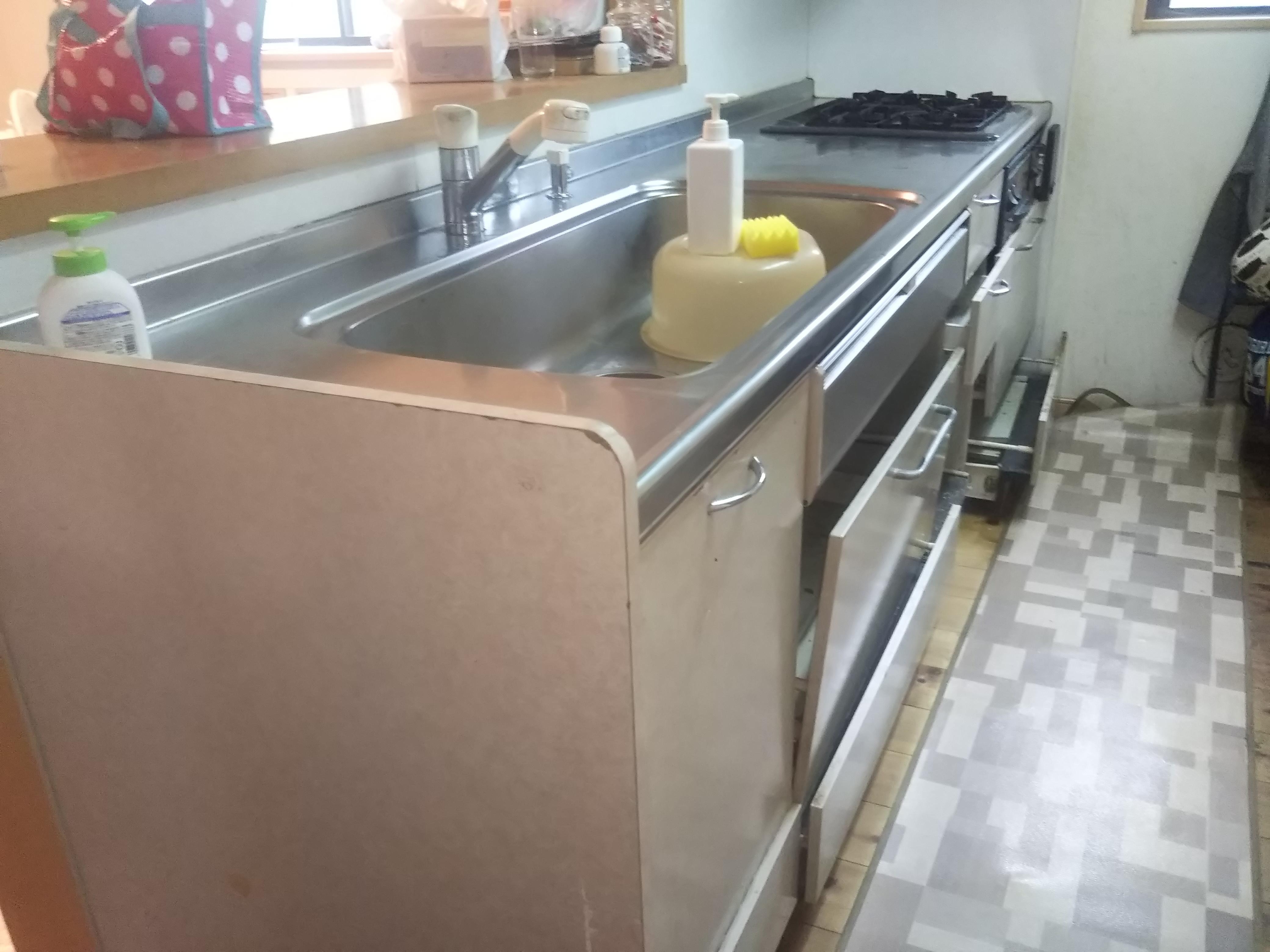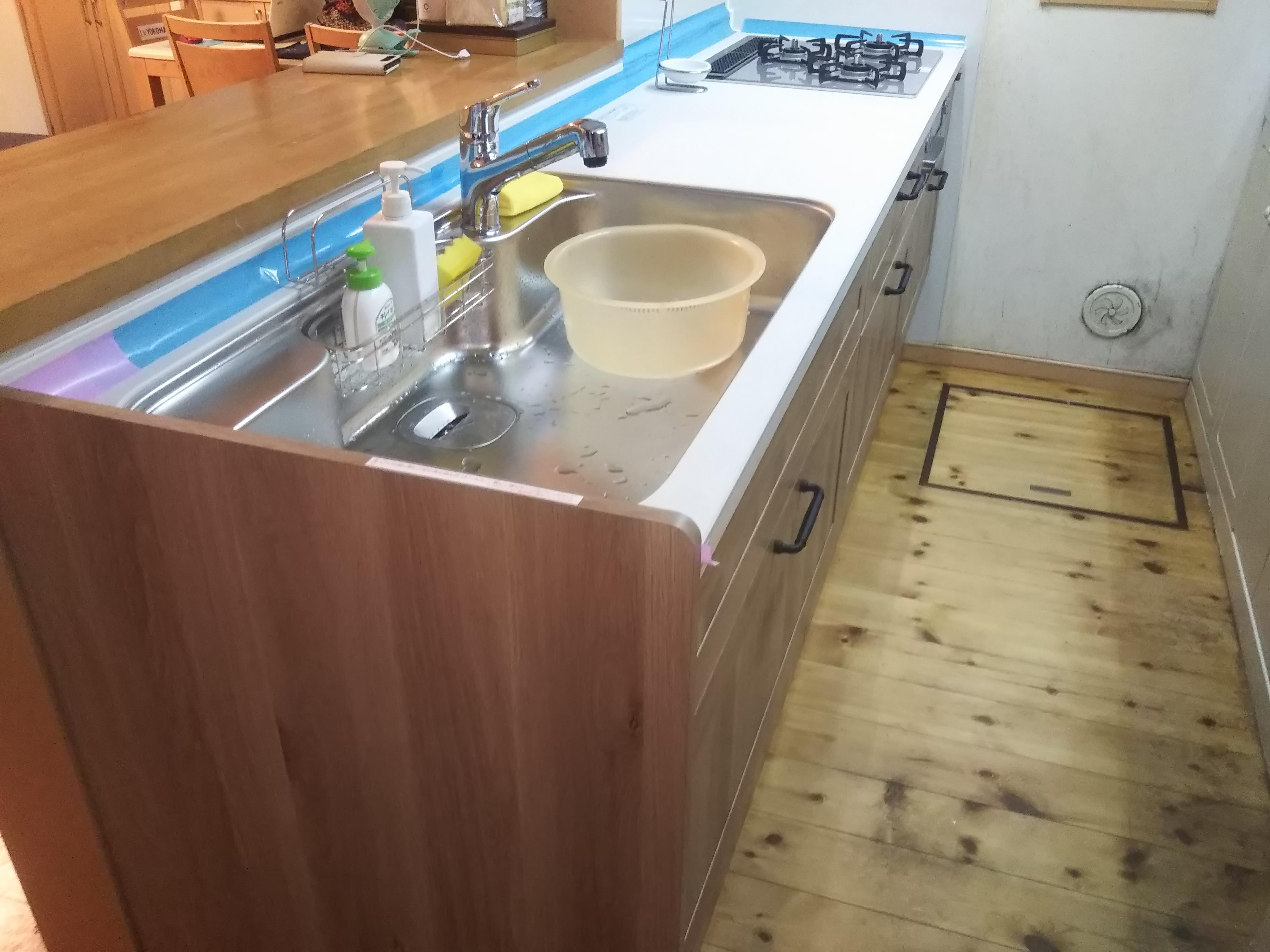 10数年使用していたキッチンのスライド収納部が壊れたので、キッチンを最新の物に交換しました。キッチンの高さも90cmにしたことで、家事をするときに旦那様も「楽になった。」とお喜びでした。 補足:青いテープはシーリングの養生です。翌日に撤去しました。