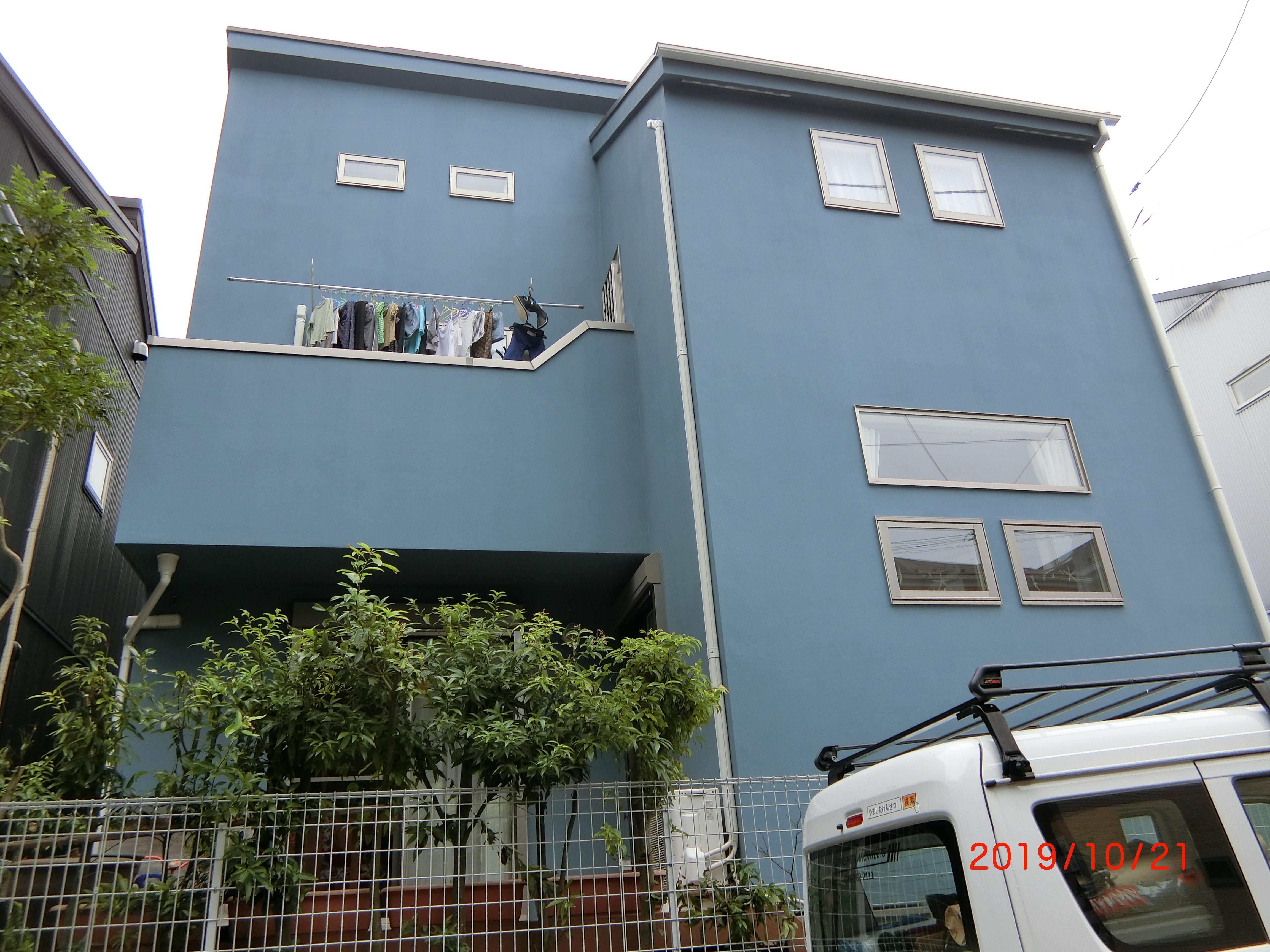 10年のメンテナンスを機に気分を変えたいとご要望があり、 既存の白から思い切ってブルーグレーを選ばれました。 汚れが目立ちにくくなり、印象もシックで落ち着いた雰囲気へと変わりました。
