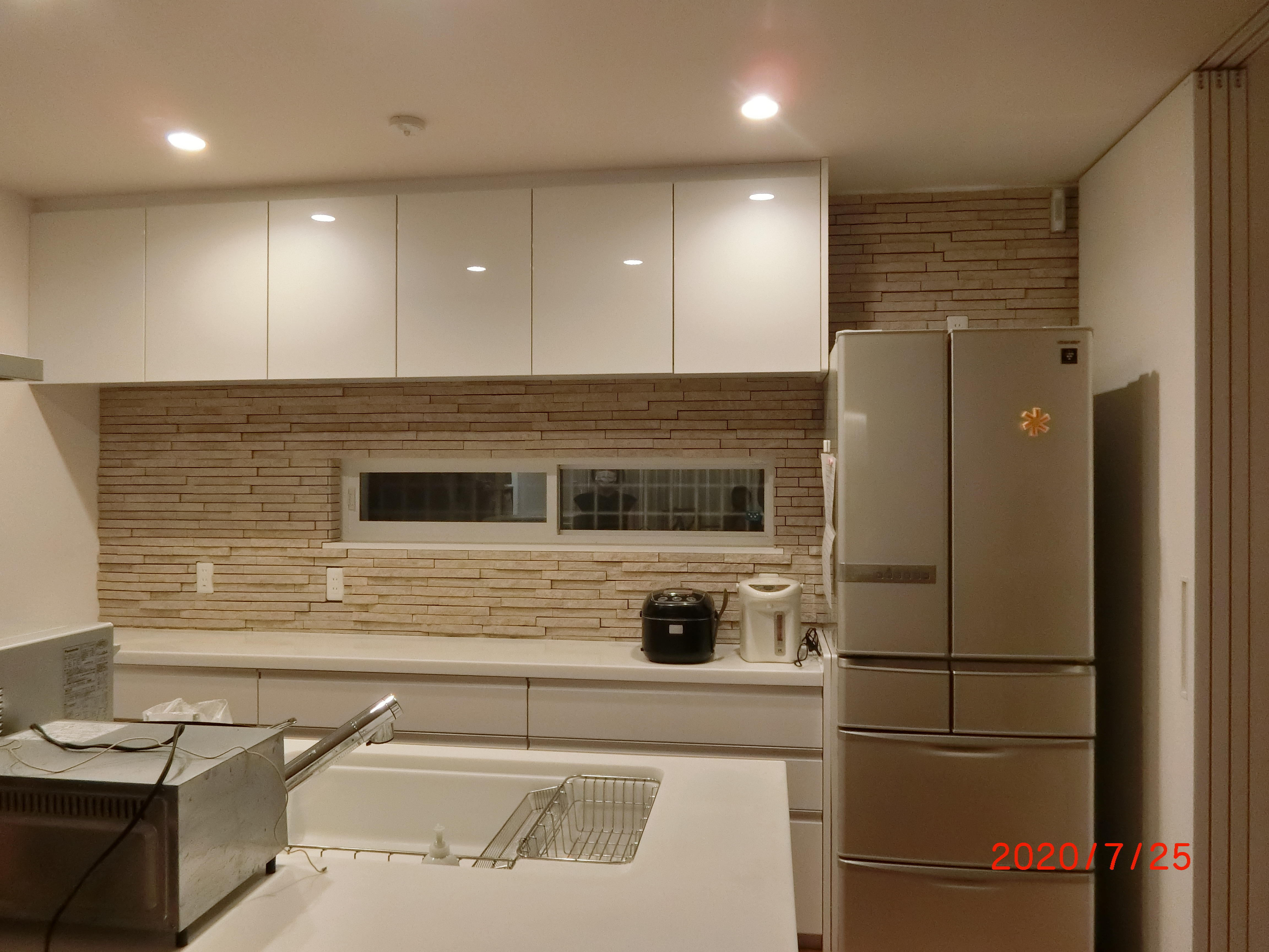 もともと白で統一されすっきりとした印象のキッチンですが、 背面に天然石タイルを貼り、雰囲気を変えたいとのご要望でした。 温かみのあるベージュで空間が広く見え、また立体的で奥行きのある仕上がりとなっています。 重厚感と高級感を兼ねそろえた雰囲気へと生まれ変わりました。