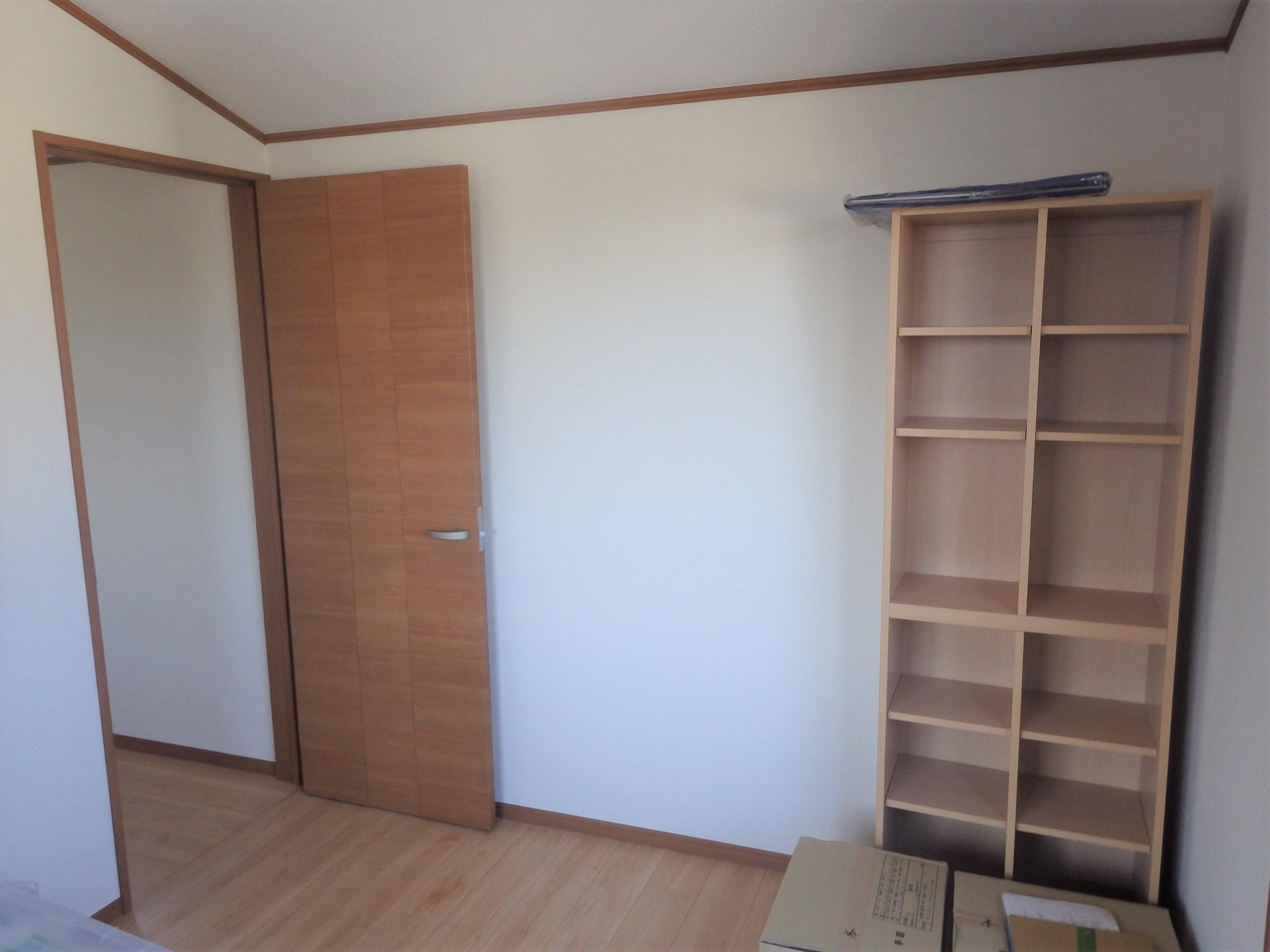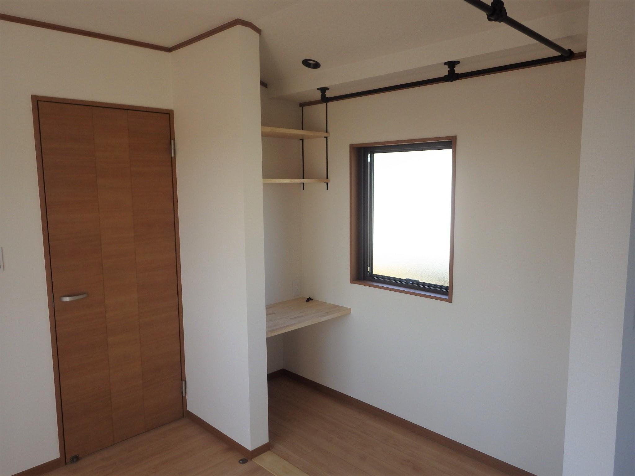 廊下のスペースと合わせて、2部屋の間仕切り壁を可能な範囲で取り払い、オープンタイプのウォークインクローゼットとパソコンデスクを追加しました。