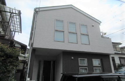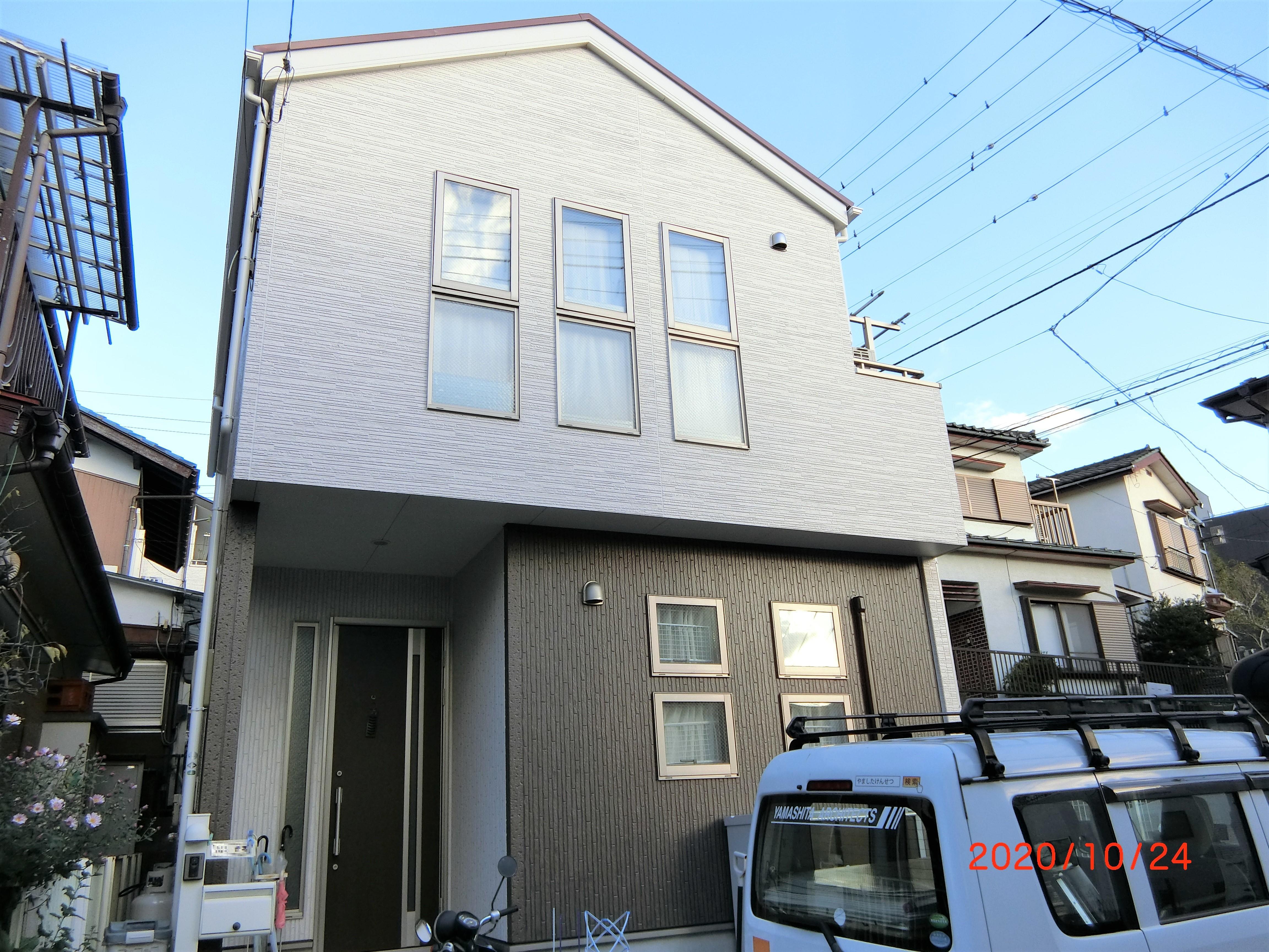 既存の2トーンカラーを活かすため、外壁塗装はクリヤー色で行いました。 全体に艶があり、新築時の美しい外観が蘇りました。 屋根は赤みのブラウンで塗装し、上品さがあり、外壁とも調和しています。 外壁のクリヤー色には顔料が含まれていないので、チョーキング現象が起こりにくいというメリットがあります。