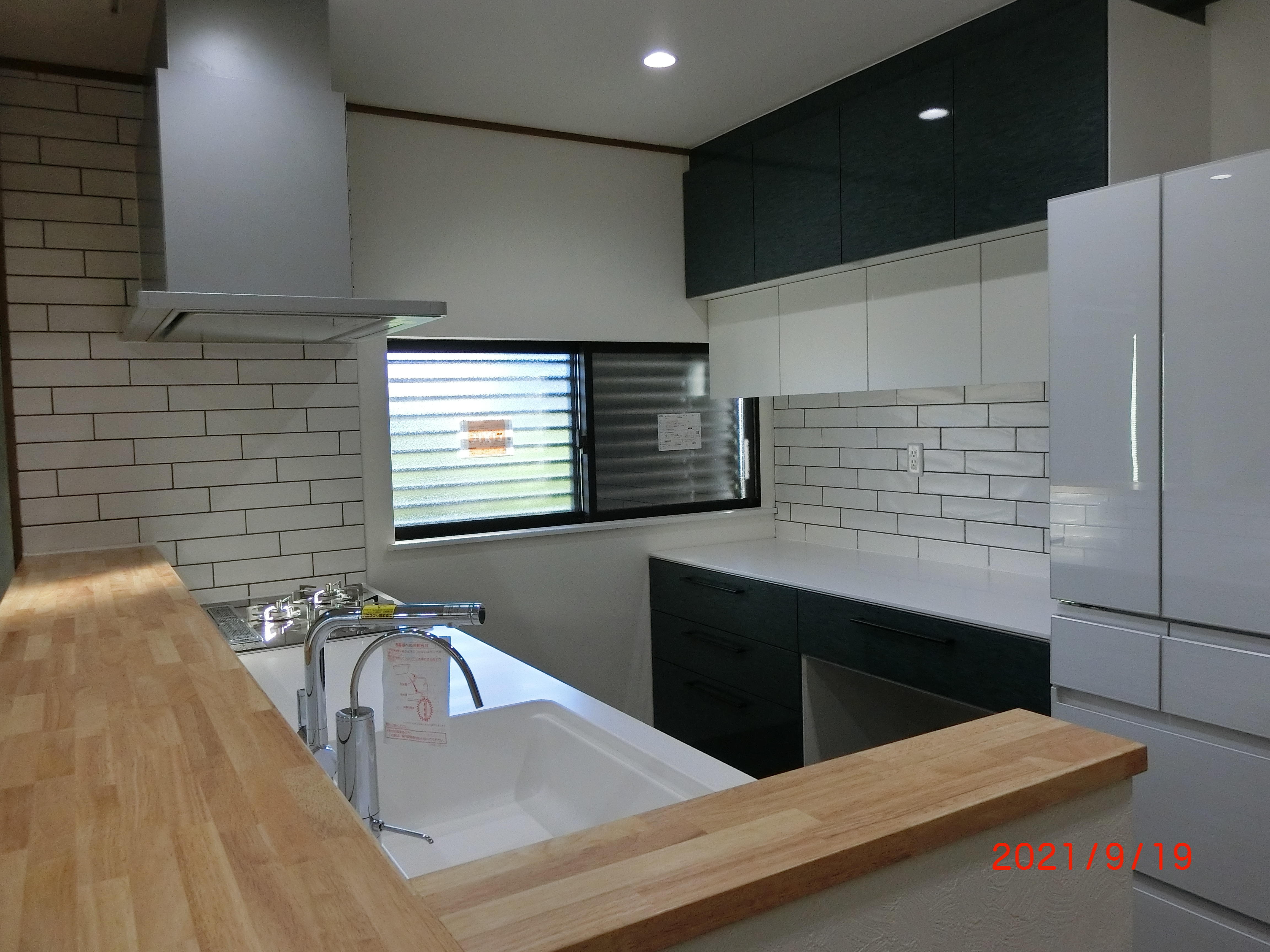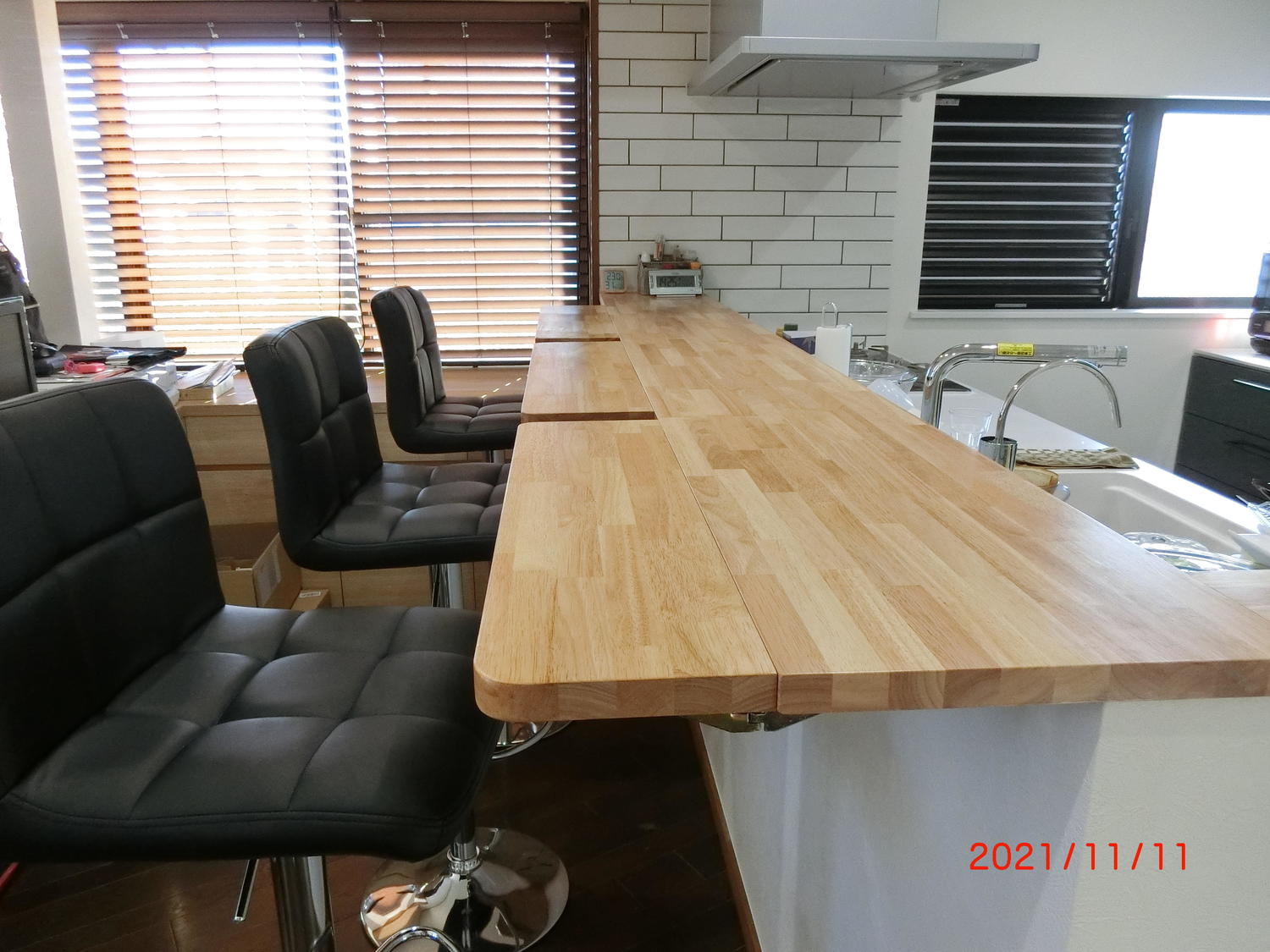 オープンキッチンは複数人で立っても余裕の広さで、バーカウンターのような造作カウンターで必要に応じて天板を広げられるようにし、食器を並べても書類を広げても十分な大きさです。