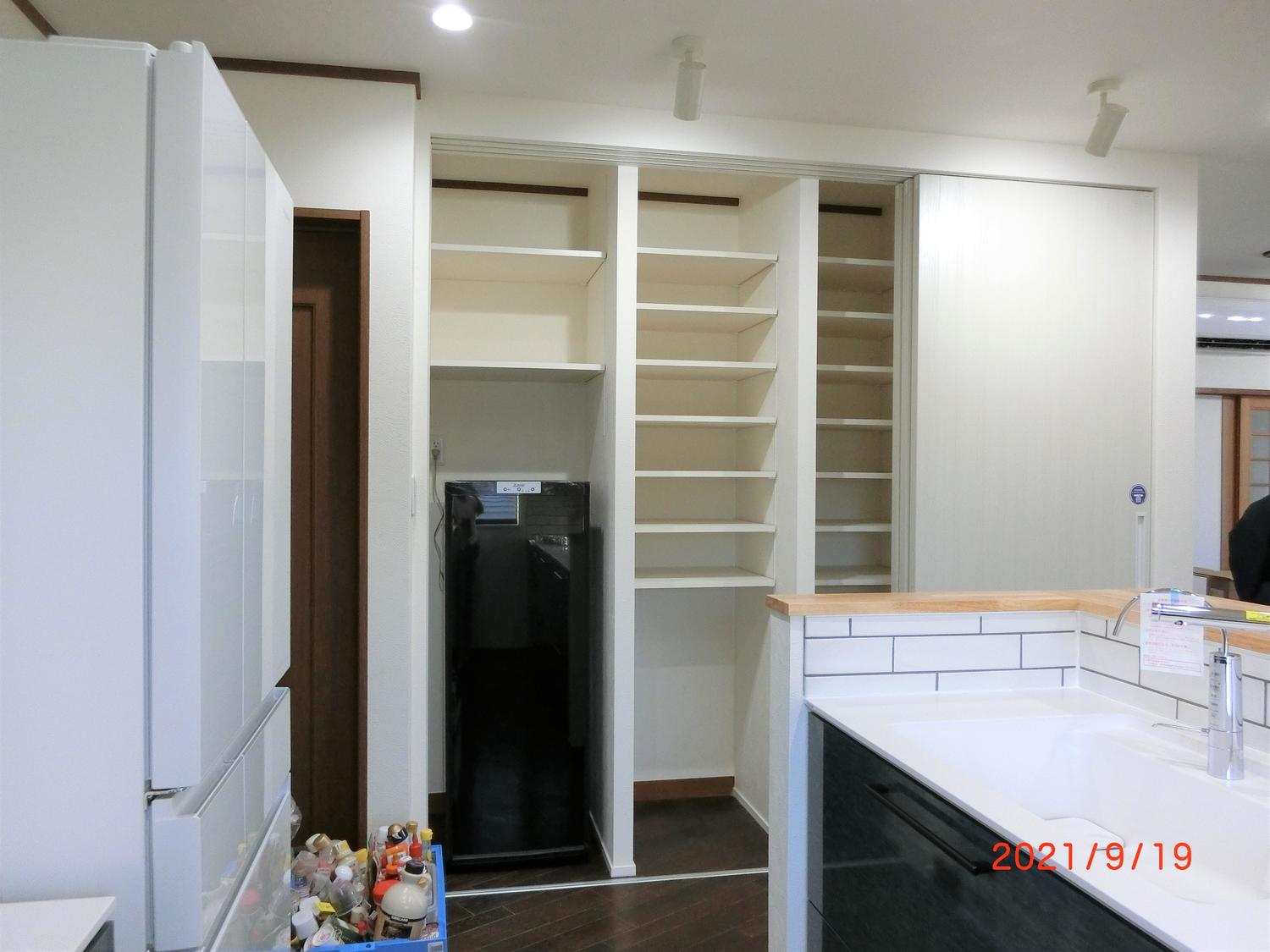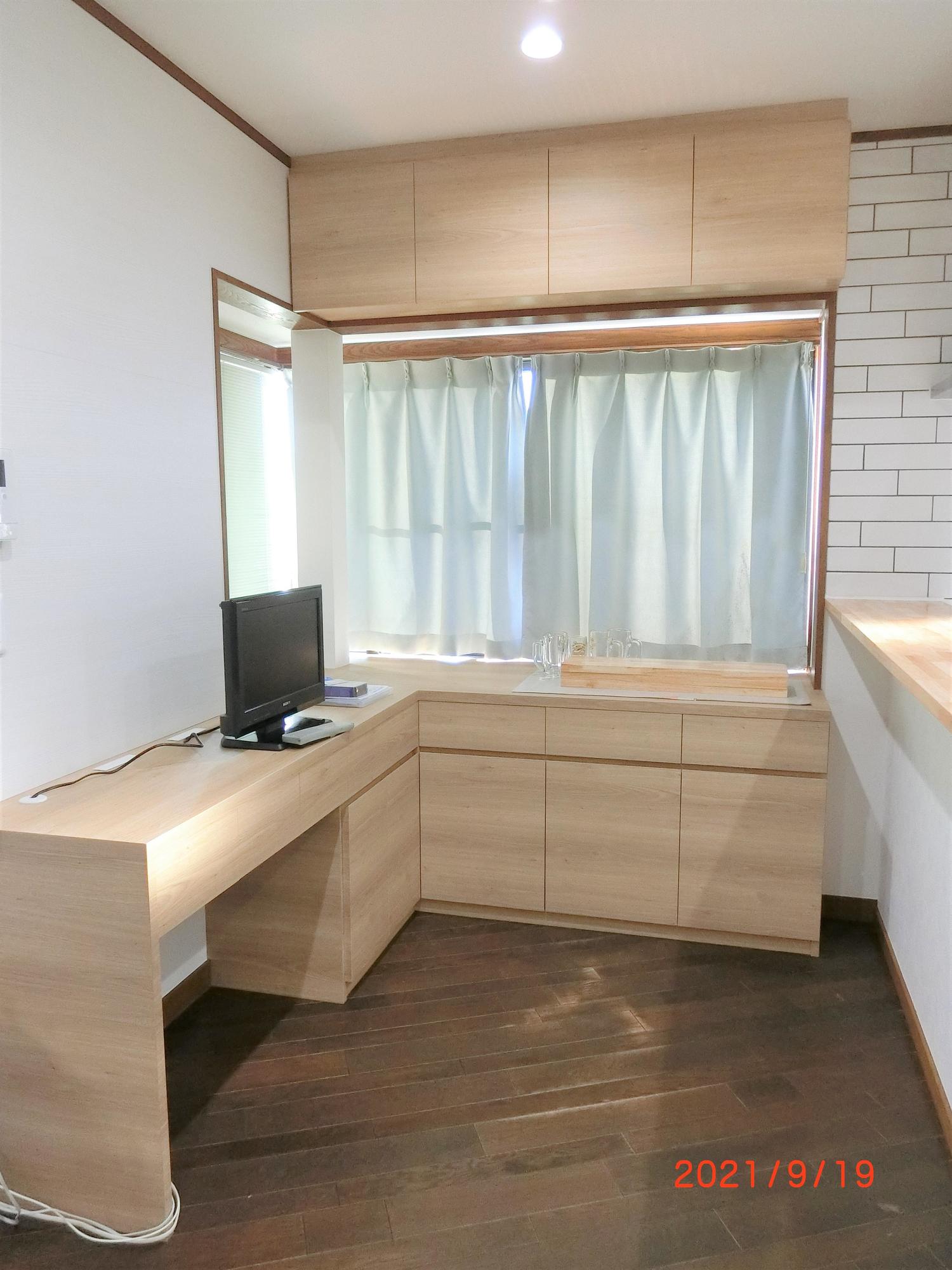 大きめのパントリーと出窓周りに造作家具を設置し、全ての小物を収納できるようにしたので、あちこちに散らばっていた物も全てスッキリ収まりました。