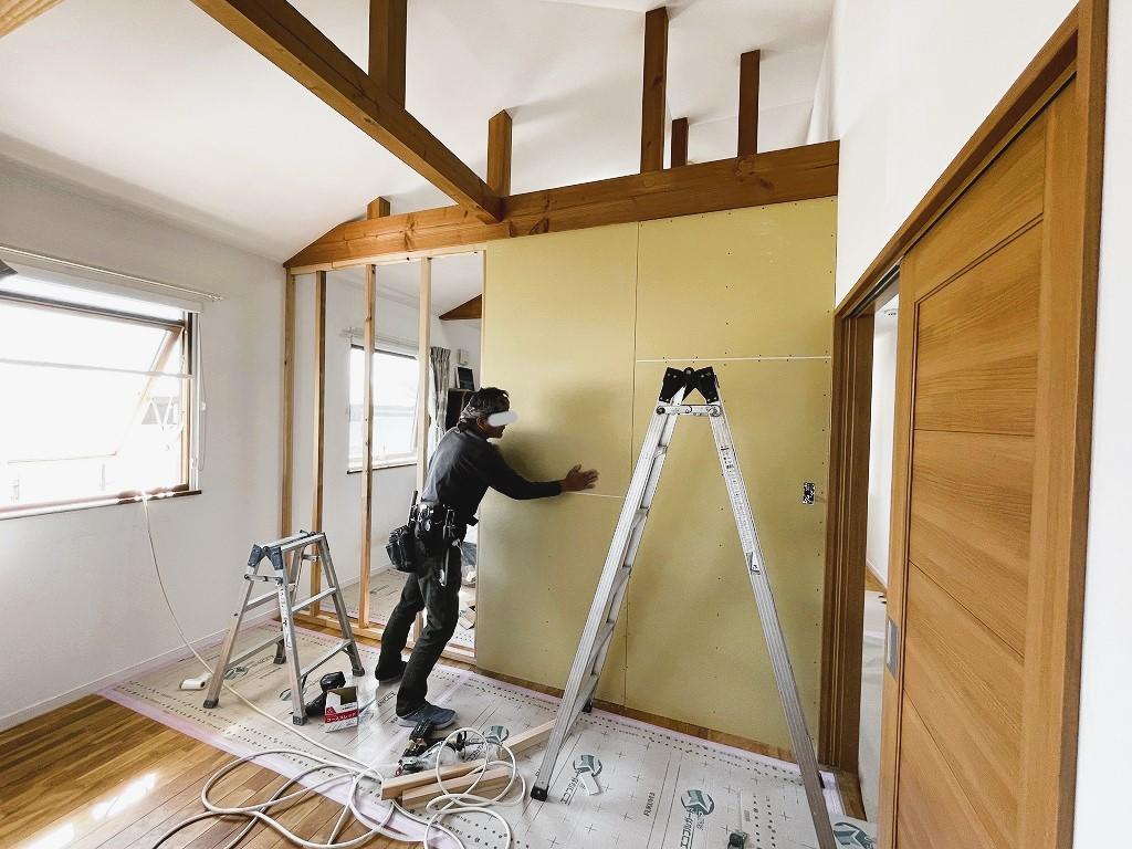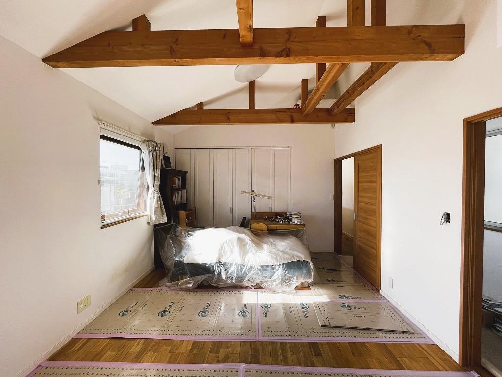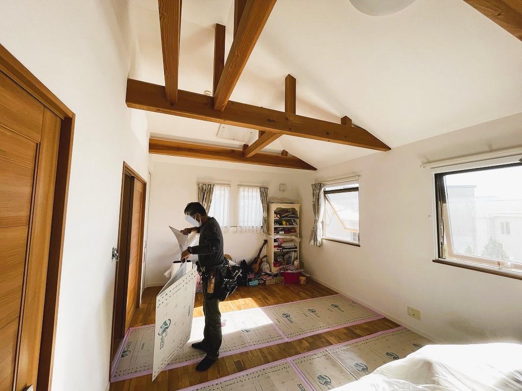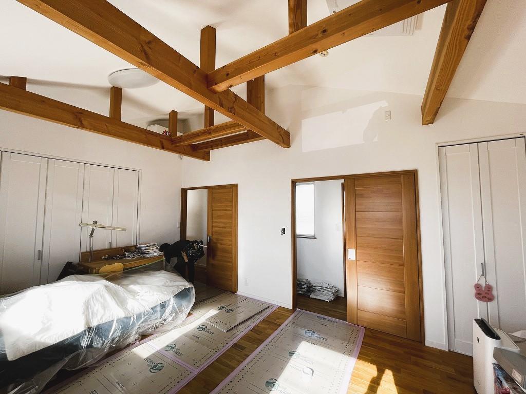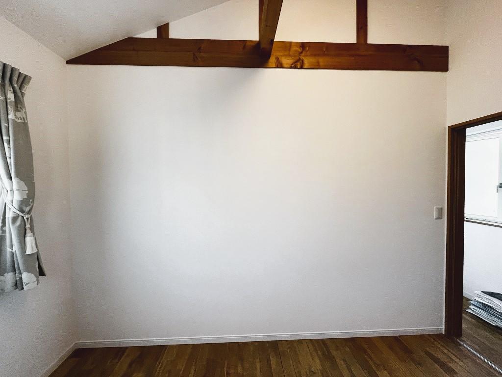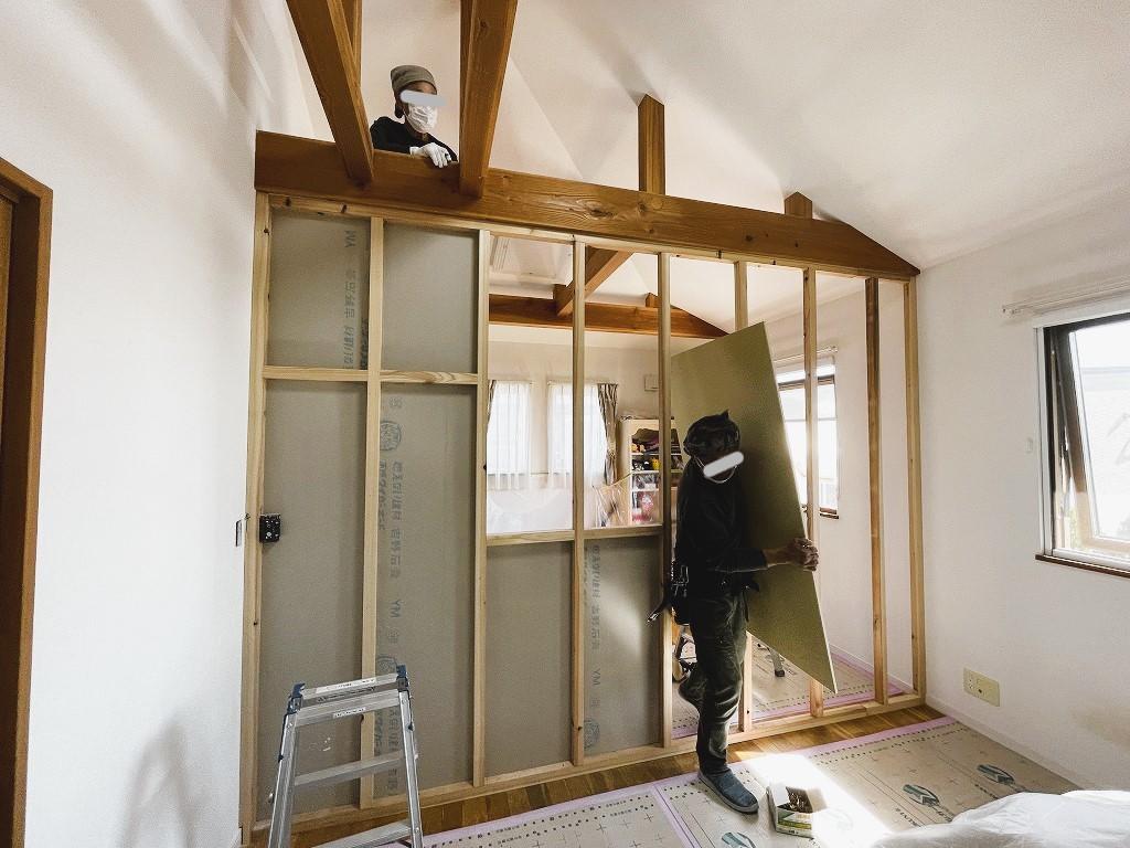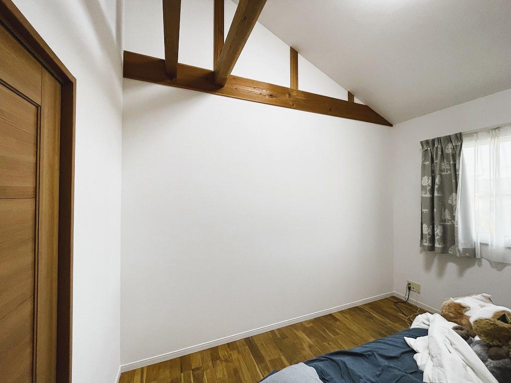 お子様の成長に伴い、洋室の間仕切り壁を新設しました。 吹き抜け小屋組みの木を活かして見せるように仕上げています。