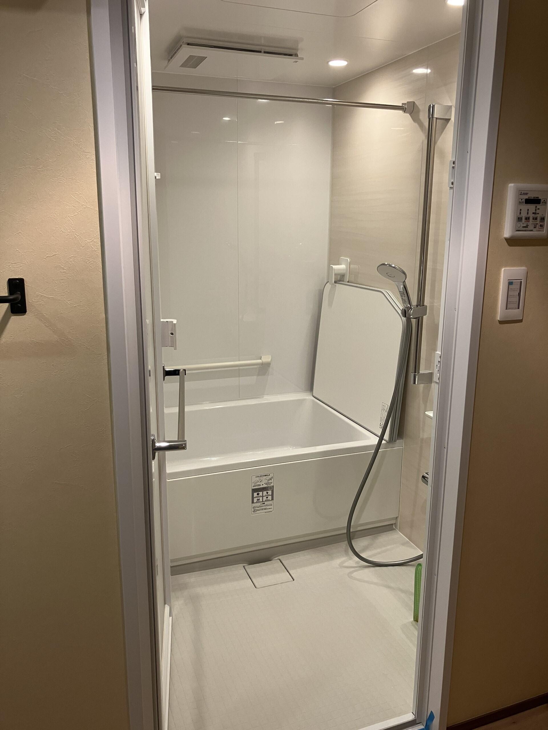お風呂の換気扇の音が気になってきており、シャワーなどまだまだ使える部分はあるものの、いずれは交換が必要になるのを見越してのリフォーム工事です。狭い空間の為、できるだけ圧迫感の出ない色味を選んでおります。