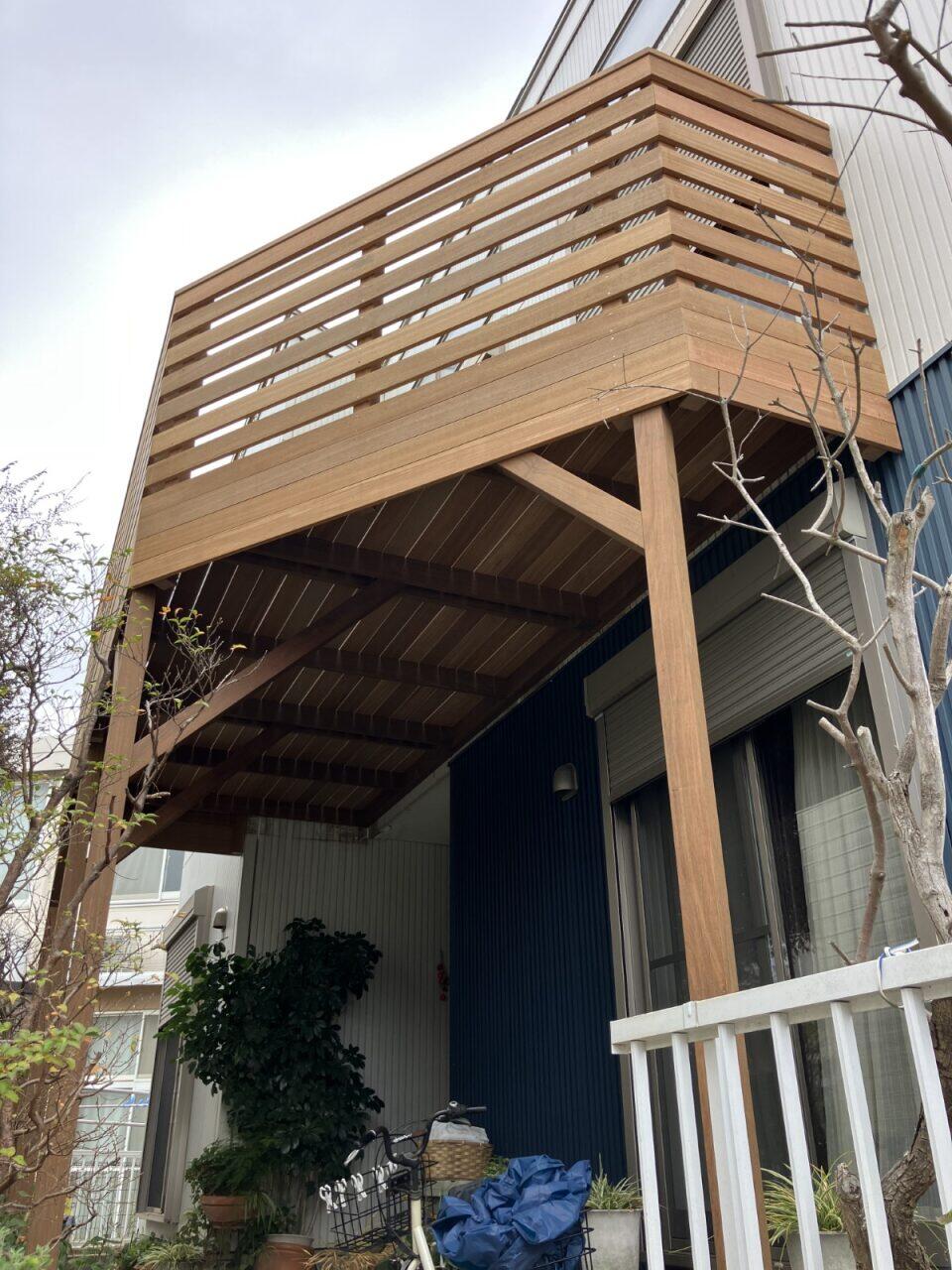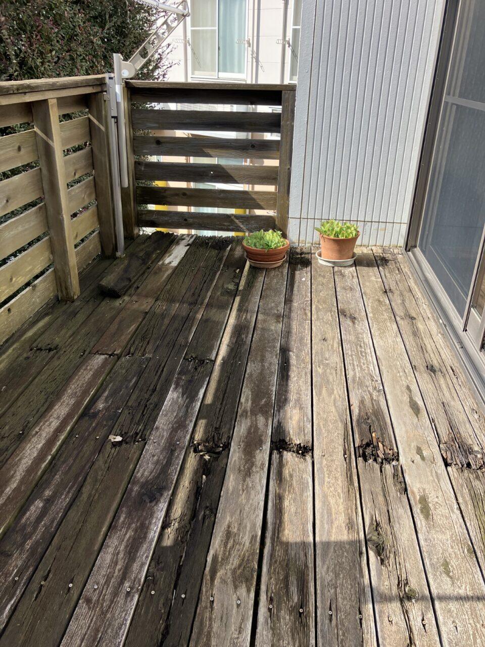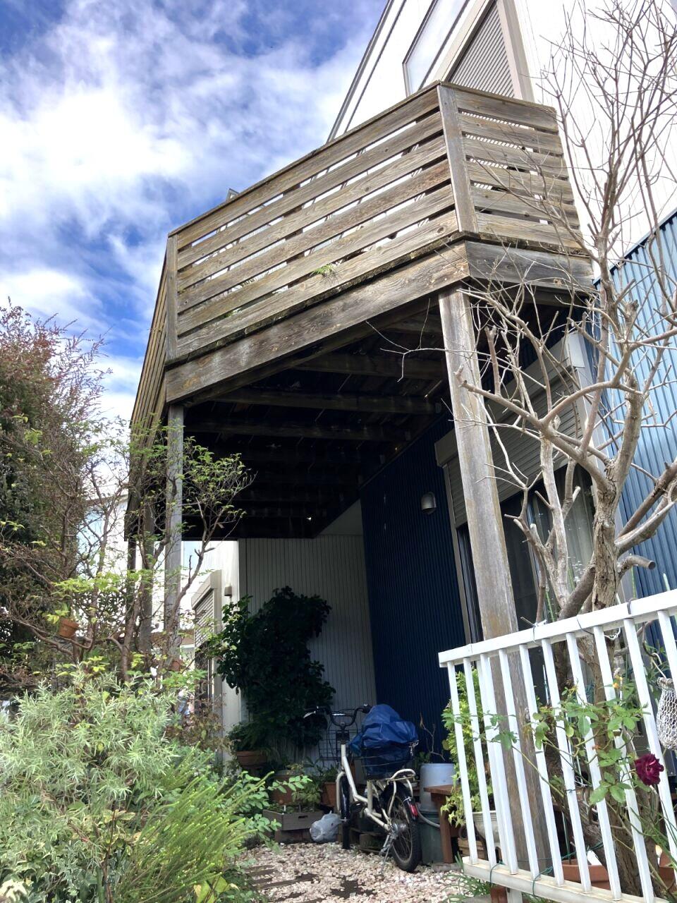 レッドシダー材のウッドデッキがボロボロになってしまった為、今度は丈夫で長持ちする材料に交換を希望されました。 無塗装でも20年以上はもつといわれている、イペ材とセランガンバツ材のハイブリッドなデッキ材で新たに作らせていただき、今後は安心してデッキで洗濯物を干したり、息抜きしたりできるようになりました。