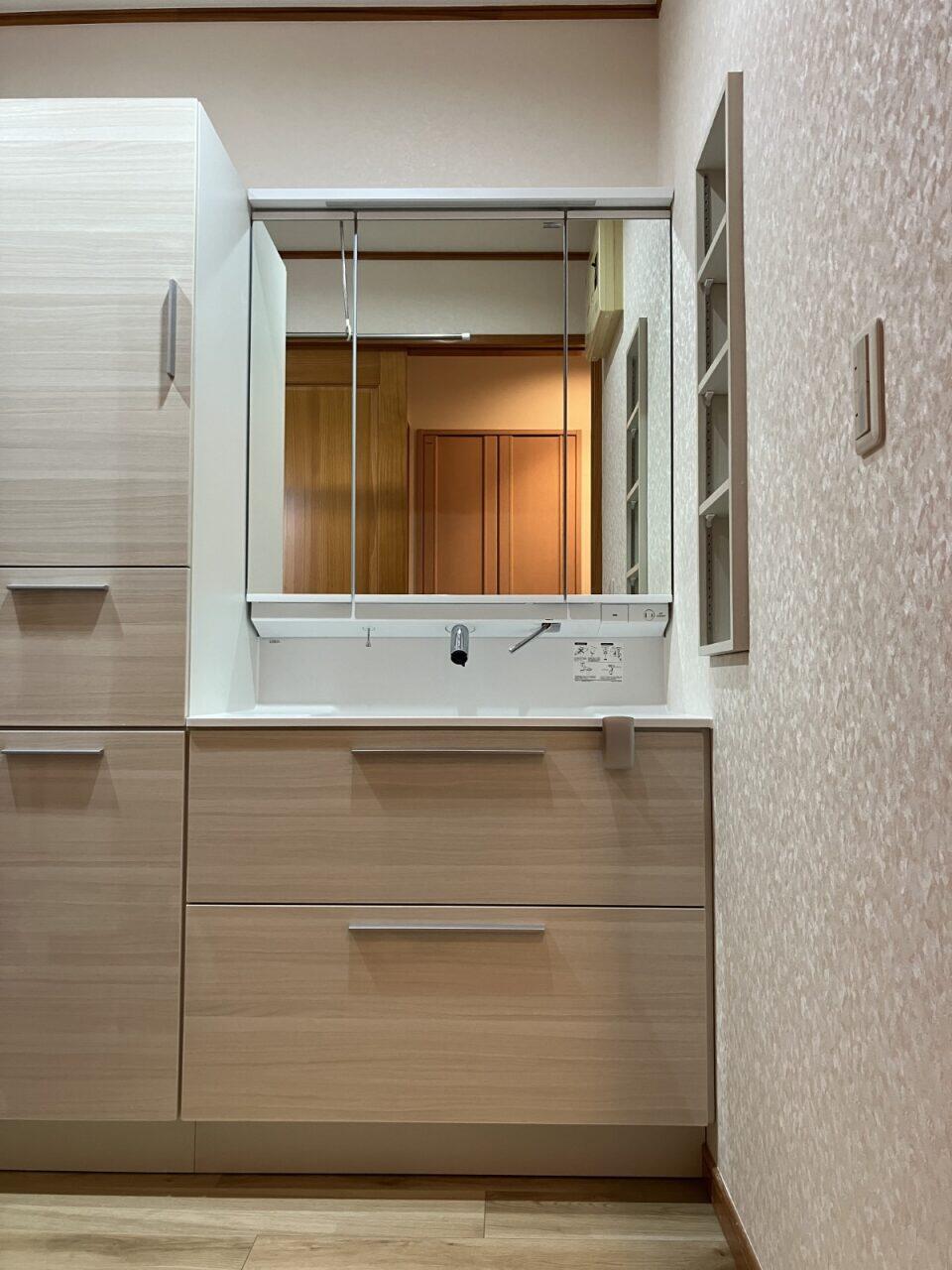 洗面化粧台は、足元を浮かせたフロートデザインにより、空間に圧迫感を与えずモダンで開放的な印象を演出できるのが魅力です。また、横のトールキャビネットからカウンター下まで木目調で統一されており、高い収納力を確保しながらもインテリアとしての美しさを両立させています。