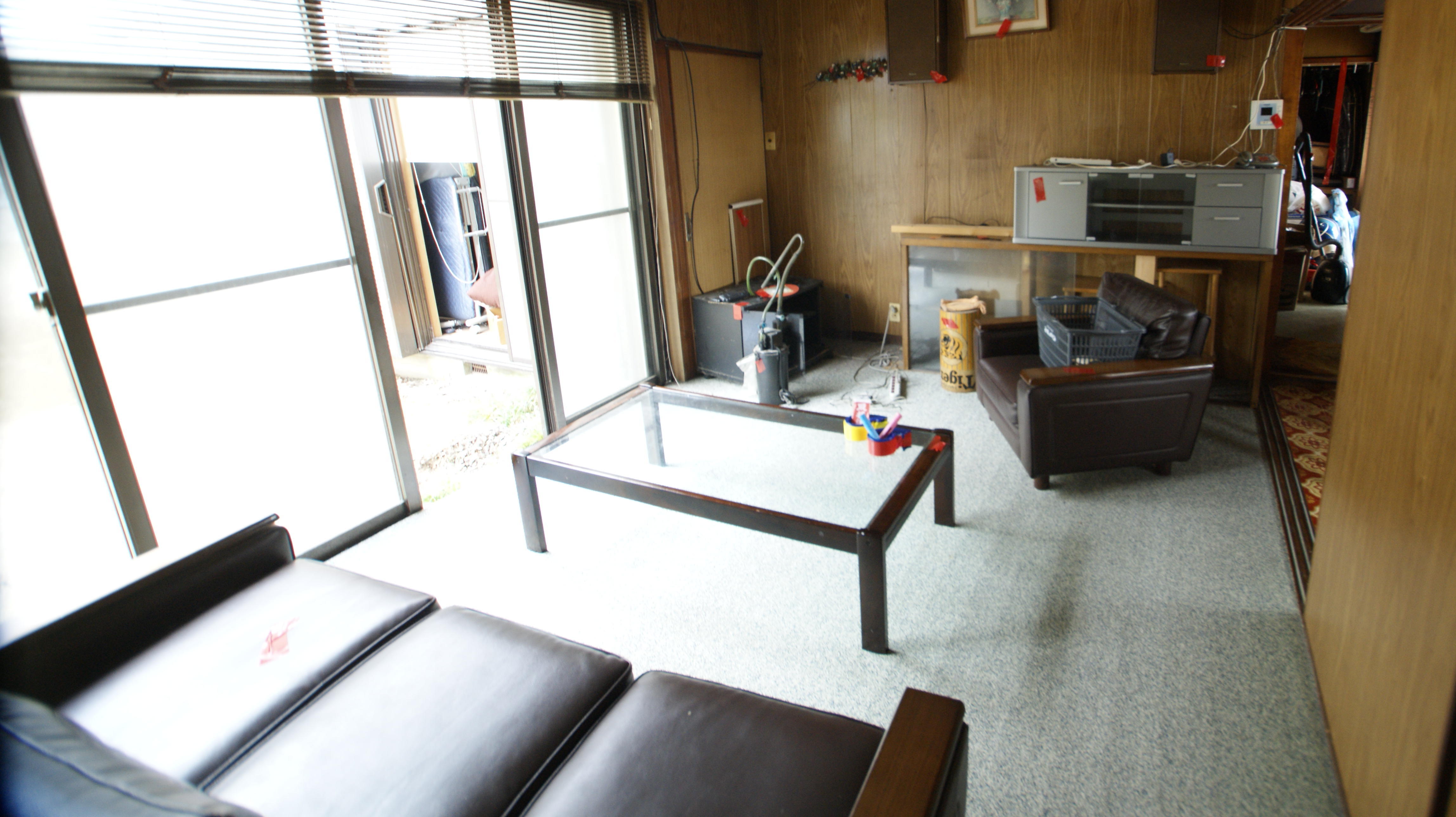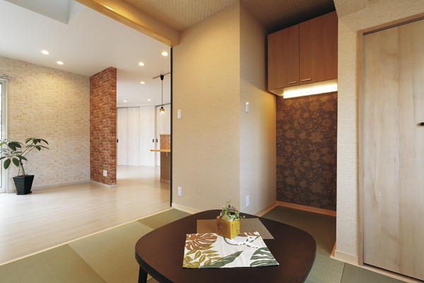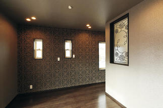 1階のダイニング横の和室には掘りごたつが設けています。正面にはシックな壁紙を貼り、照明を設置してモダンな床の間にプランしました。食事の後、ゆったりと過ごせるスペースです。