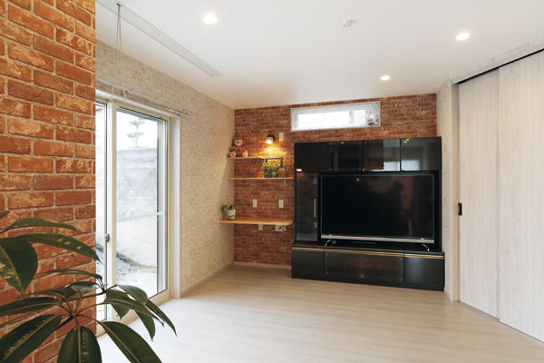 光がたっぷり入るリビング。近隣の視線を遮りつつ光を取り込めるよう、高い位置にも窓を設けました。ブリック調のクロス、白い収納扉やフローリングでシンプルで温かみのある空間に。右手には大きなウォークインクロゼット、TVボード左には飾り棚をプランしました。壁のブラケットライトもアクセントに