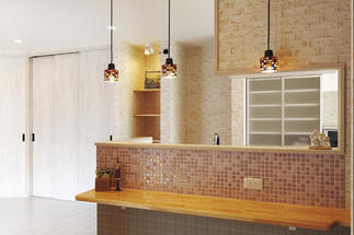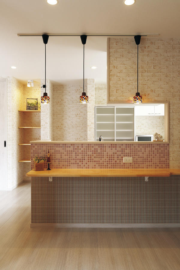 施主様こだわりのキッチン。ここに立つとリビングやダイニング、玄関ホールの様子も見えます。ピンク色を基調にキラキラ光るモザイクタイルをカウンターに貼り、小ぶりのペンダントライトを3灯吊りました。緩やかなアールが美しいカウンターは大工さんの造作。白いフローリングと調和したかわいい空間になっています
