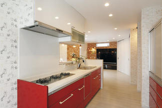 真っ赤なキッチン。吊り戸棚は白い面材をセレクトして、色彩のバランスをとっています。カップボードにたっぷりの収納ができます。