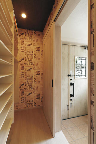 玄関横のシューズクローク。ここの壁紙もお洒落なものをチョイス。白い棚、白い玄関扉、白いフローリングに壁紙がアクセントになっています。玄関との間には引き戸を設け、来客には見えない工夫もしています