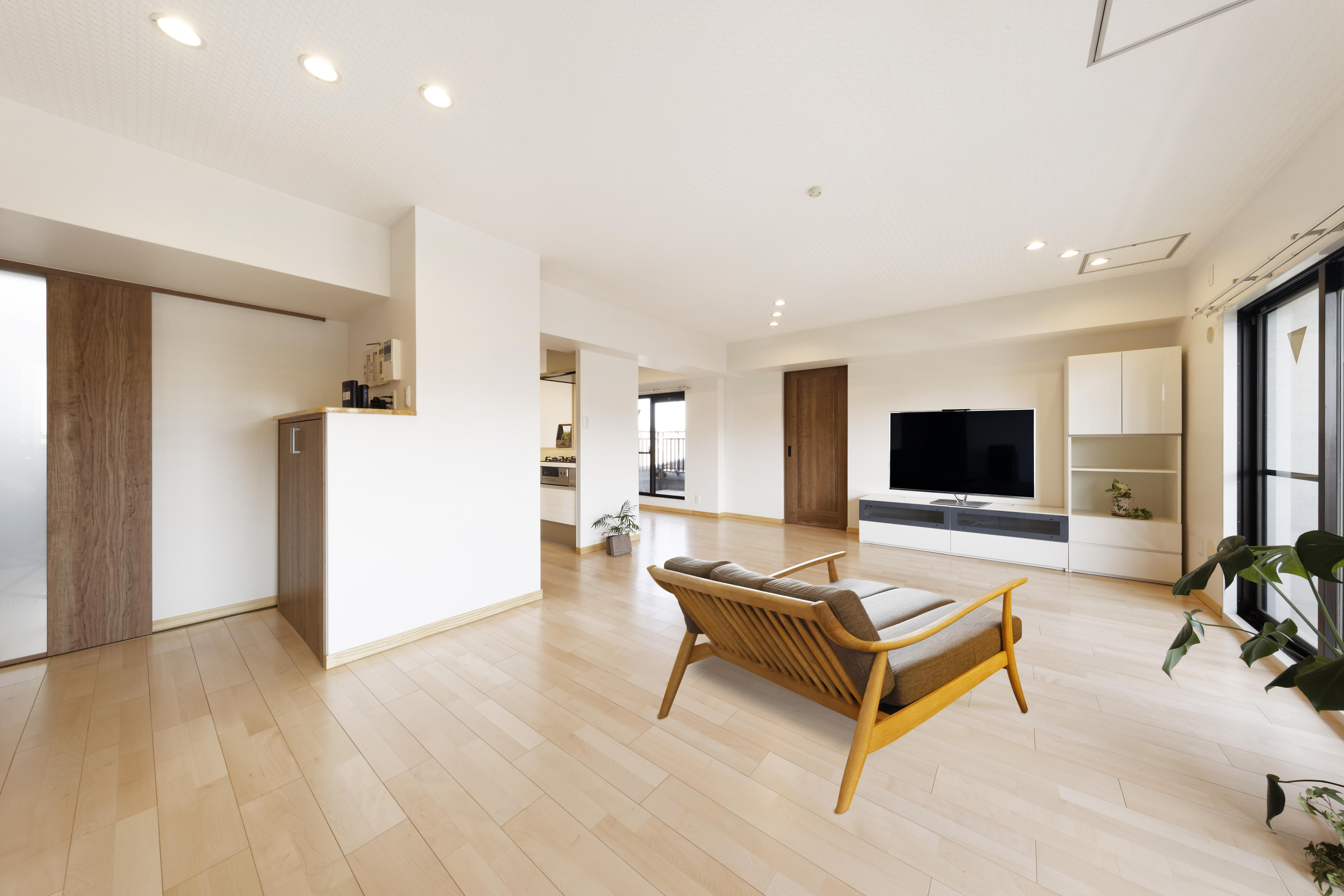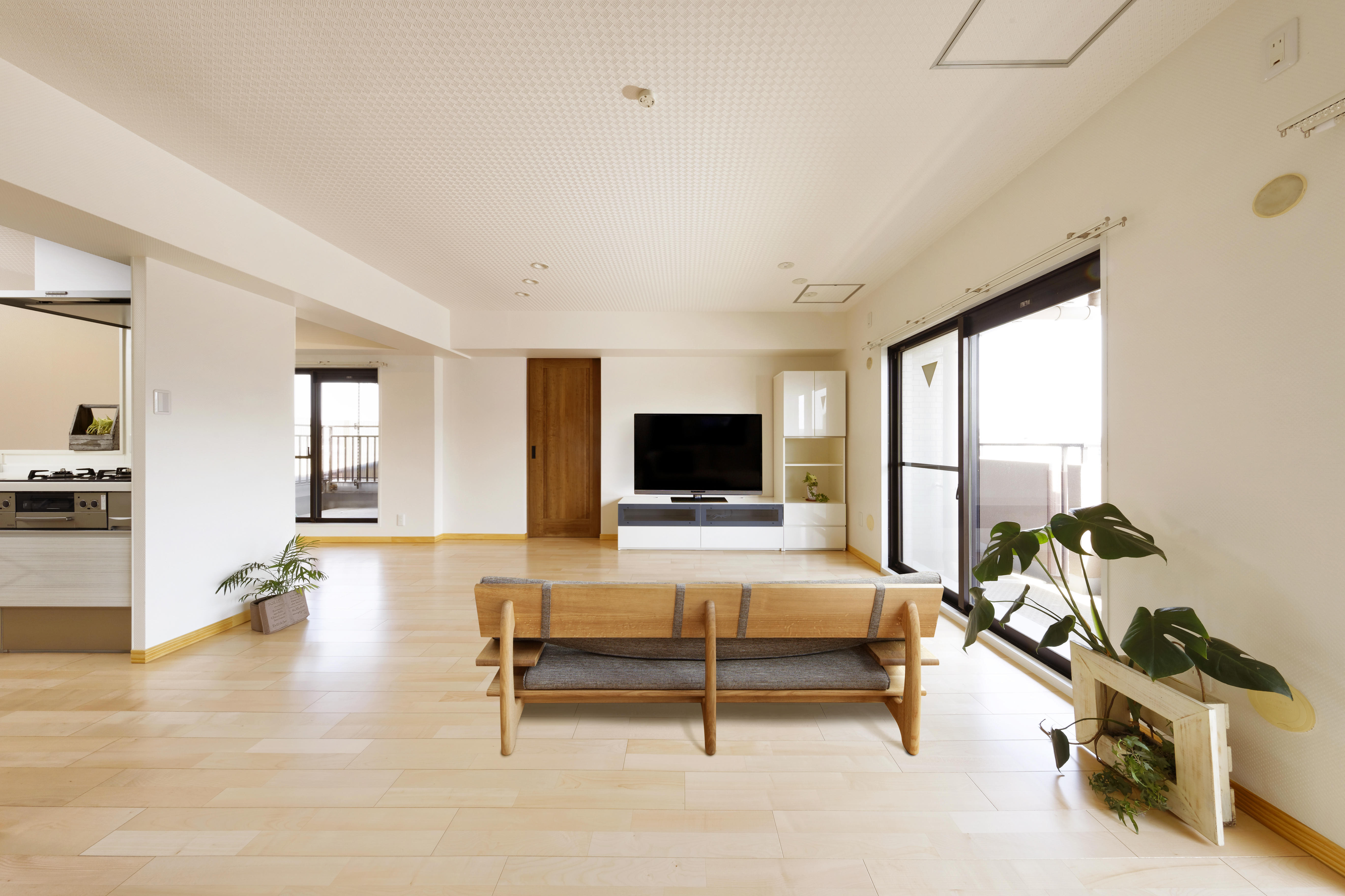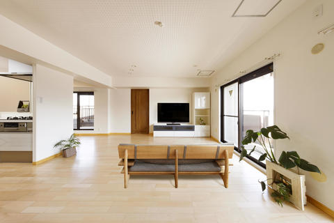 大きなサッシからたっぷりと光と風が入る23畳の大空間のLDK。左手奥にもバルコニーがあり、視線が抜け、より伸びやかさを感じるスペースになってます。左の扉近くのカウンターは使いやすい高さにプランし、下部は収納スペースになっています。