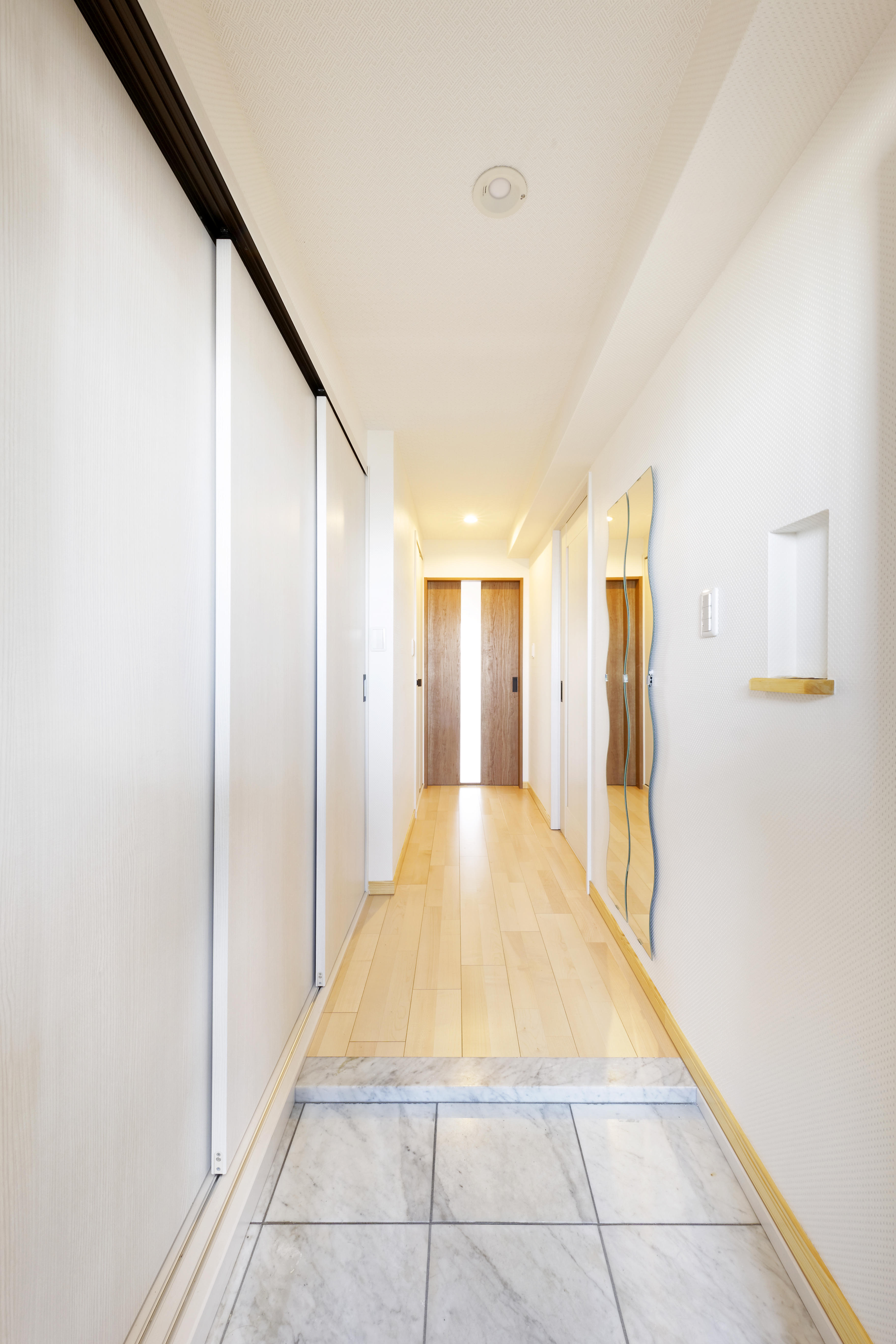 明るい玄関スペース。大理石の土間は既存のものを活かしました。左手には三枚扉の大きな玄関収納をプランニング。お子さんの成長とともに増えてくるバギーやアウトドアグッズなどもたっぷり収納できます。