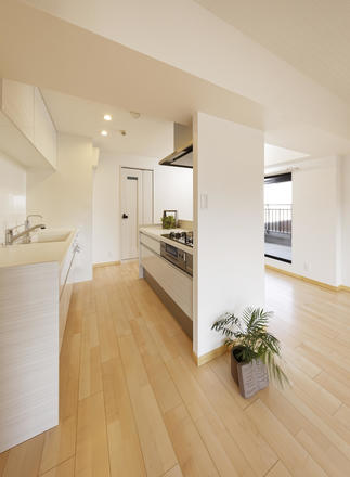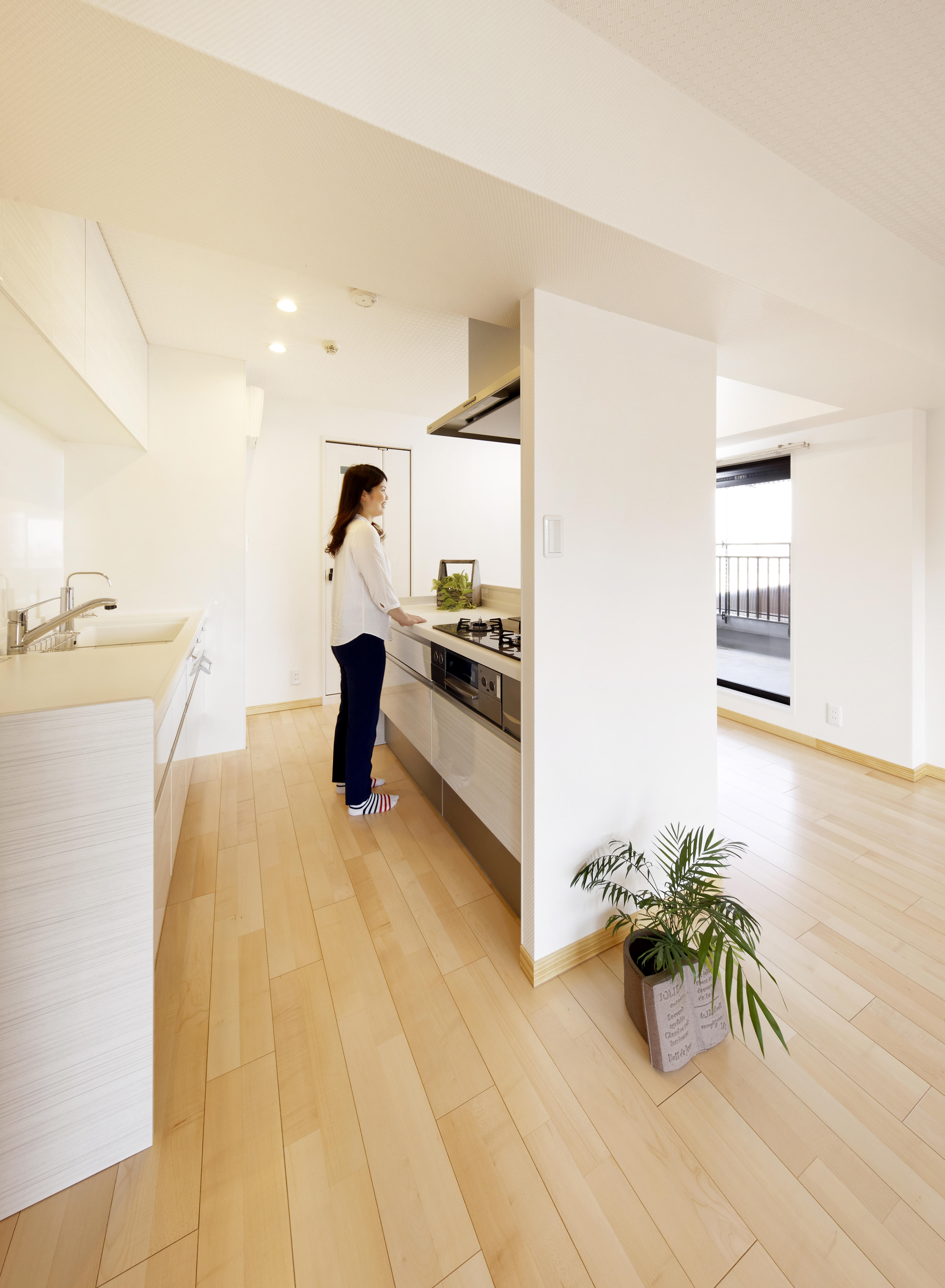 以前はL型だったキッチンをII型に変えてプランニング。コンロ側のカウンターに立つと、バルコニーからの眺望を楽しむことができ、開放感たっぷり。動線も良く、調理がテキパキとはかどる。真っ白なキッチンで爽やかに