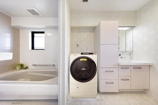 レイアウトを変えて、優しいカラーの心地よいバス空間を実現しました。1坪タイプのシステムバス、洗面スペースには収納もたっぷりと。左手にも棚を設けている。キッチンからの動線も良くなりました。