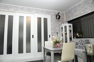 もともと店舗として使用していたスペースを有効活用レンガ調のクロスを貼り、床には2色のフロアタイルを配置。リビングとは違ったカジュアルな印象を演出。ご友人からのプレゼントや、ご家族と撮った写真を飾ったり、施主様の優しい人柄が現れる空間になりました。