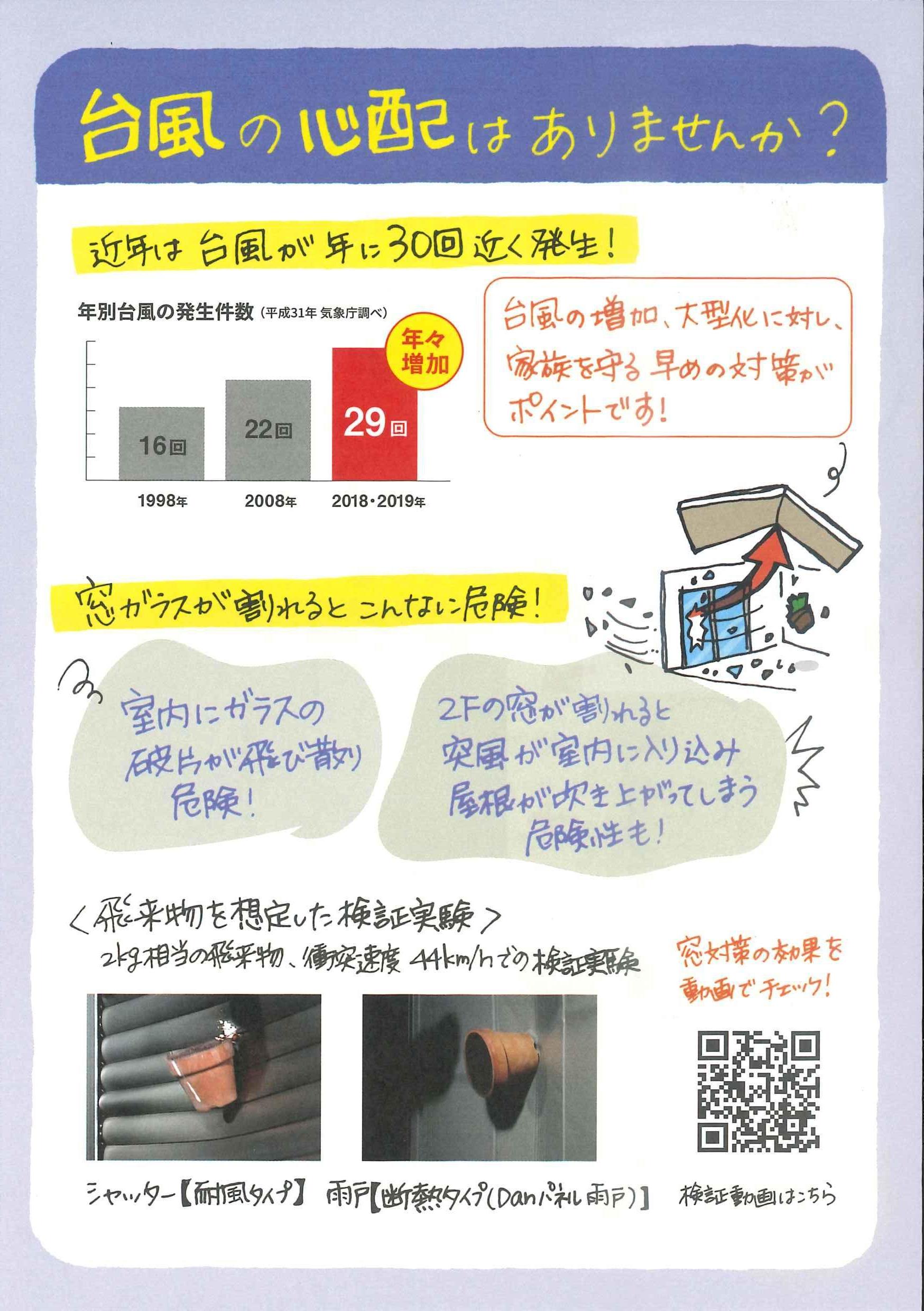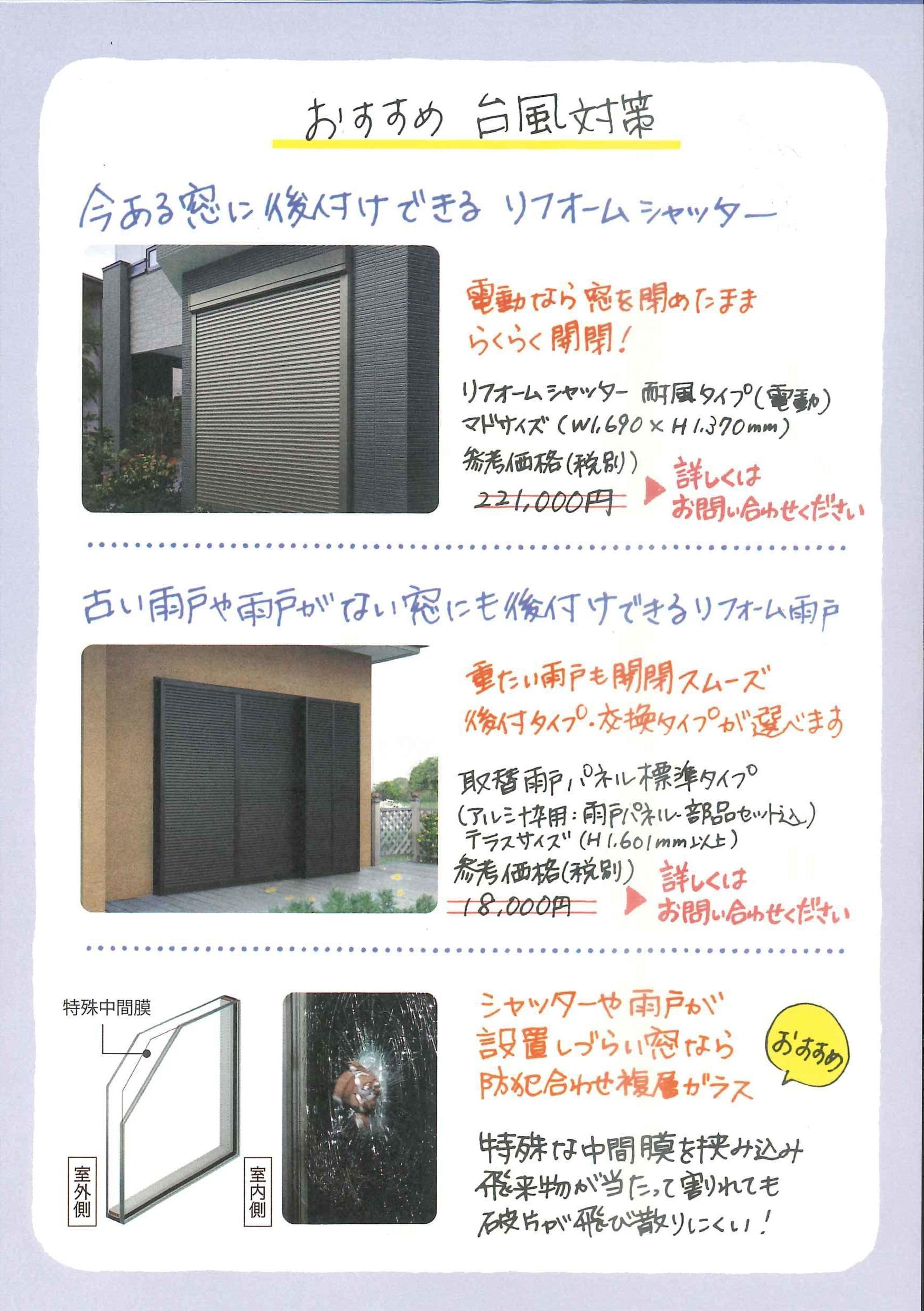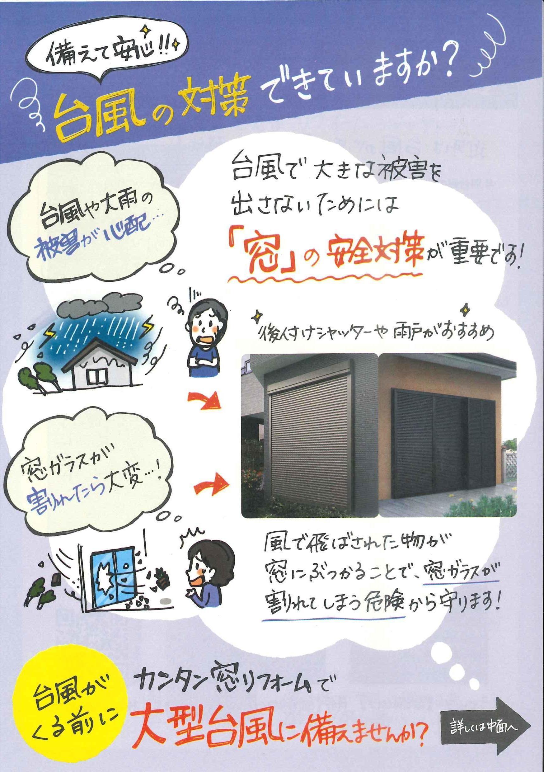 近年台風がとても増えていますね。住まいの台風対策としてシャッターや雨戸を付けるのげ効果的です。これから来る台風に備えませんか?