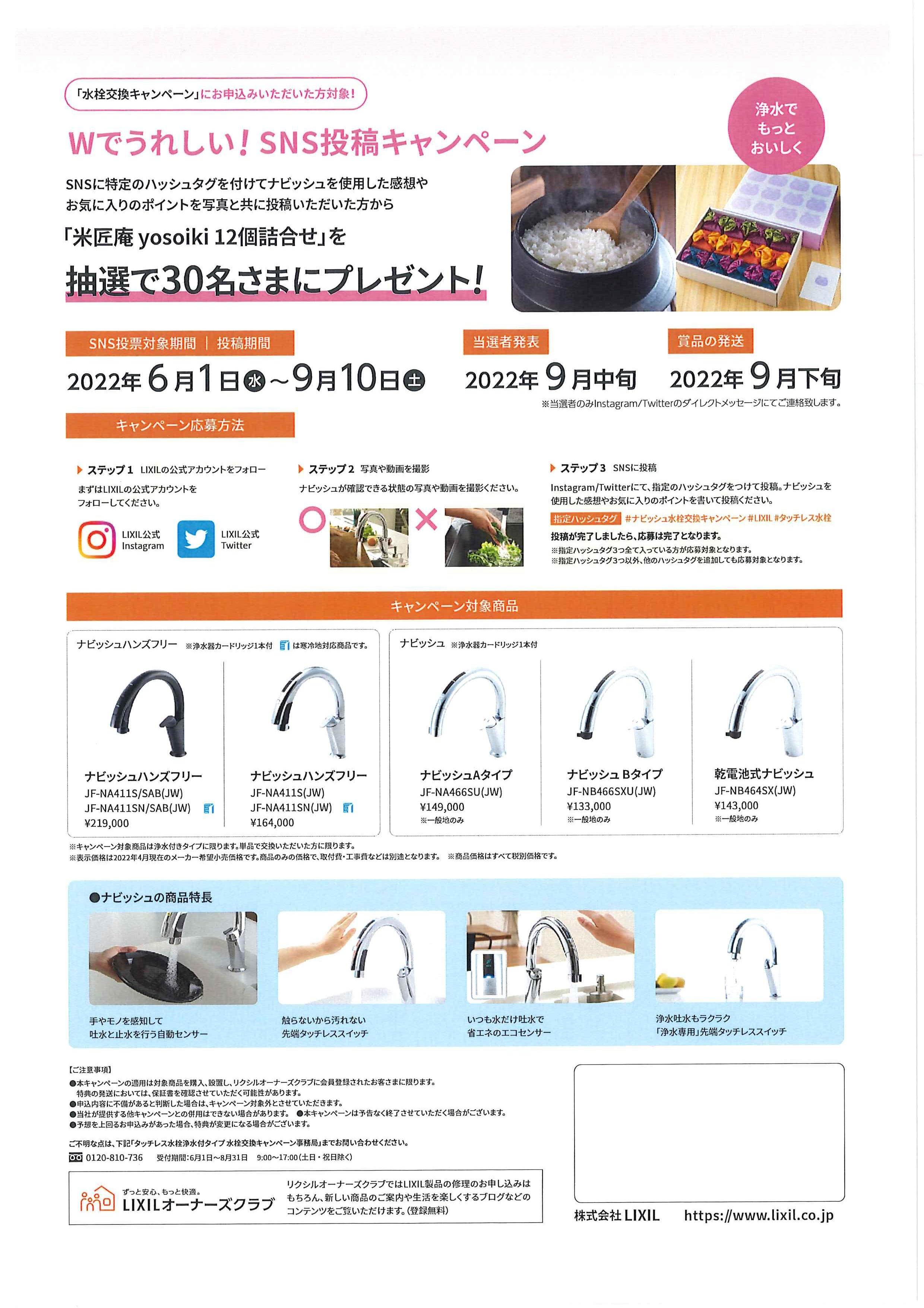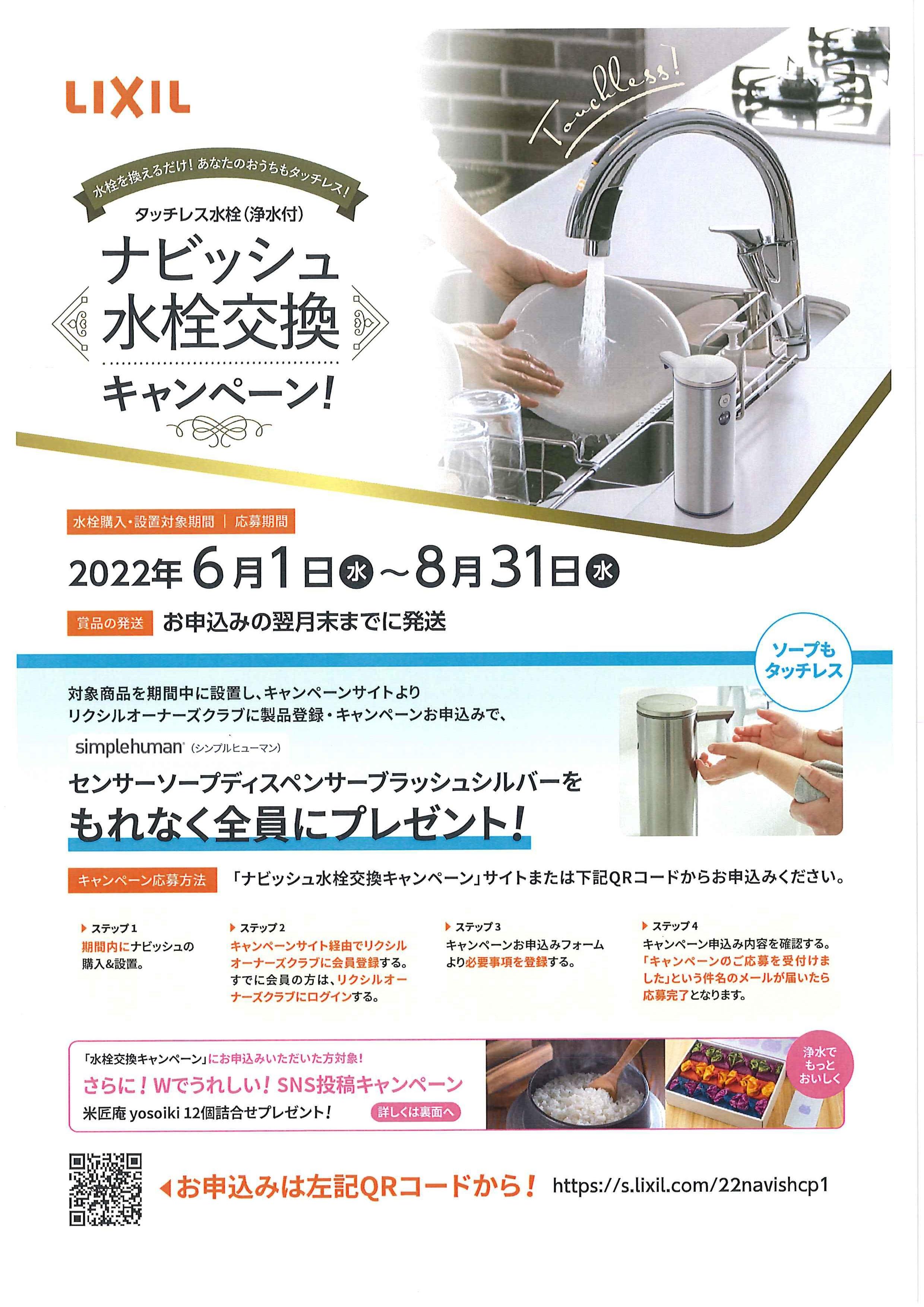 6/1~8/31まで、LIXILタッチレス水栓 『ナビッシュ水栓交換』キャンペーンを行っています。ぜひ、この機会にご検討ください。