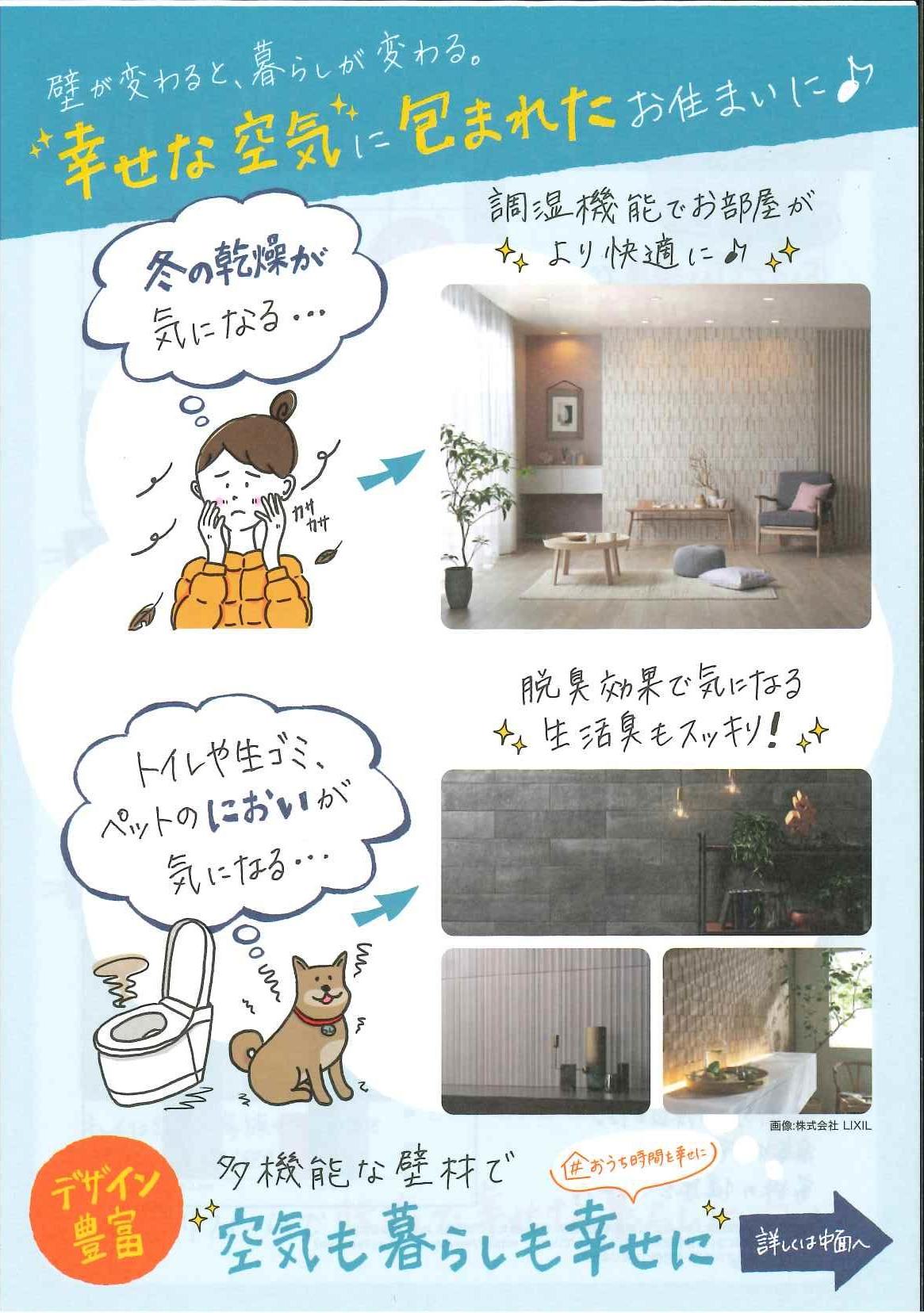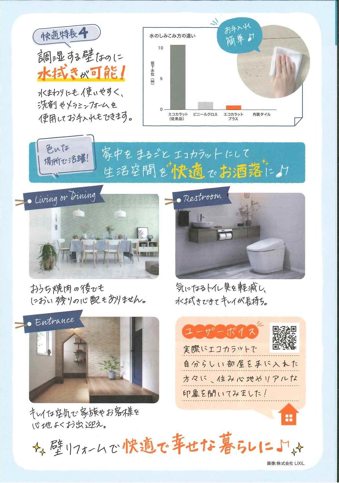 壁材『エコカラット』は、自然と心地いい湿度に調湿、気になるにおいをすっきり脱臭、住まいの有害物質を低減、さらにお手入れも簡単です。