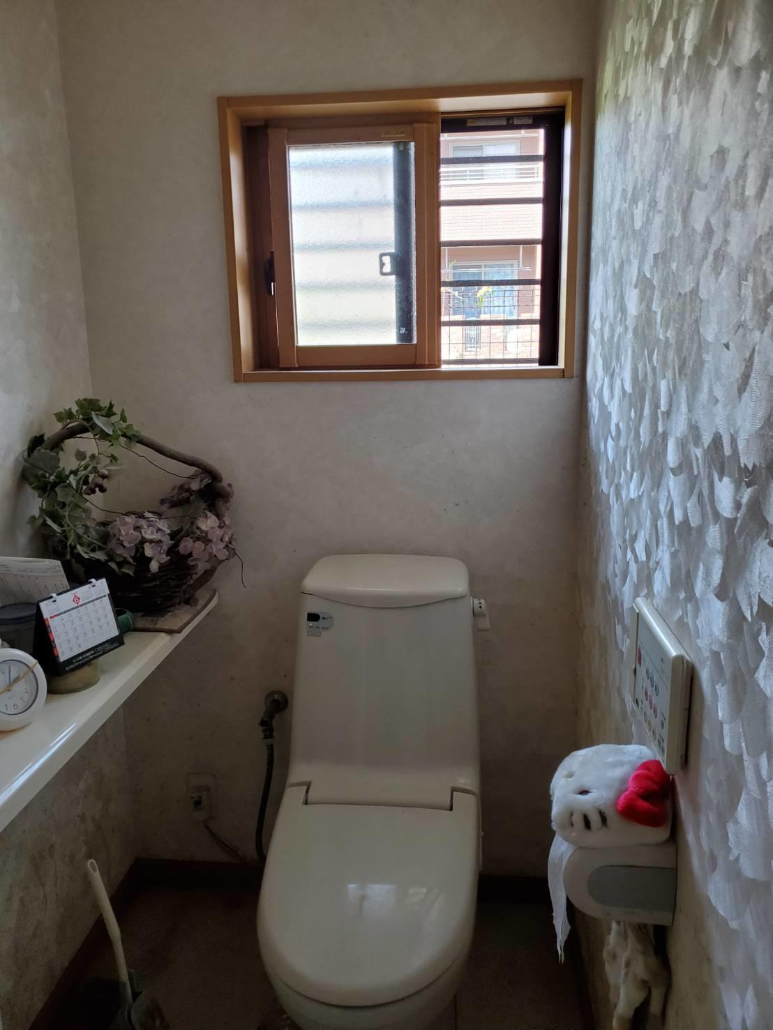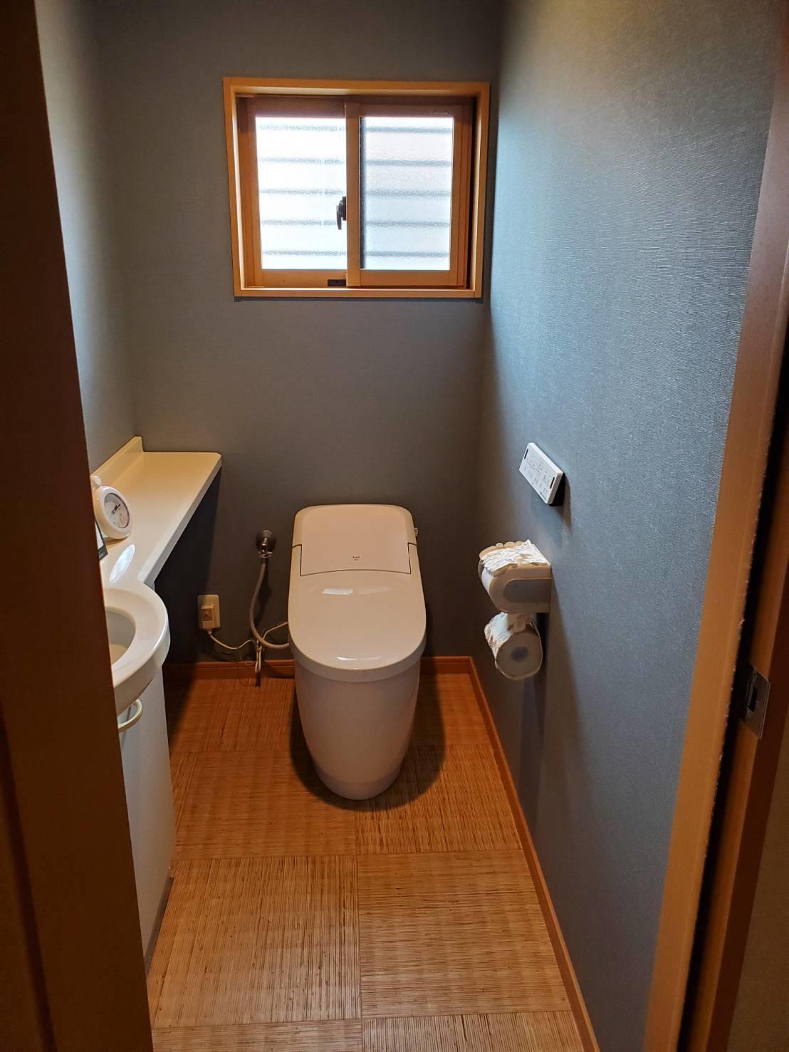 今回施工したプレアスLSタイプは、コンパクトなタイプでタンクレスのようなデザイン、しかもリーズナブルでお勧めです。 施工前は白を基調としたトイレでしたが、バンブー柄の床と青のクロスで和モダンにまとまりました。