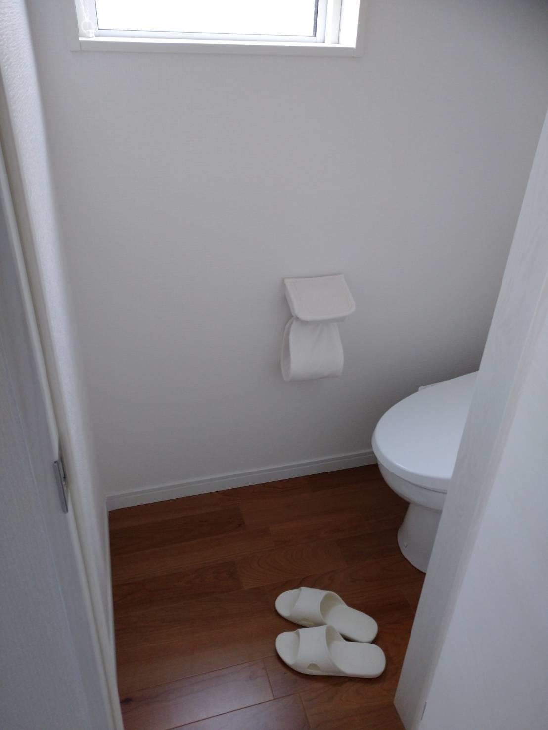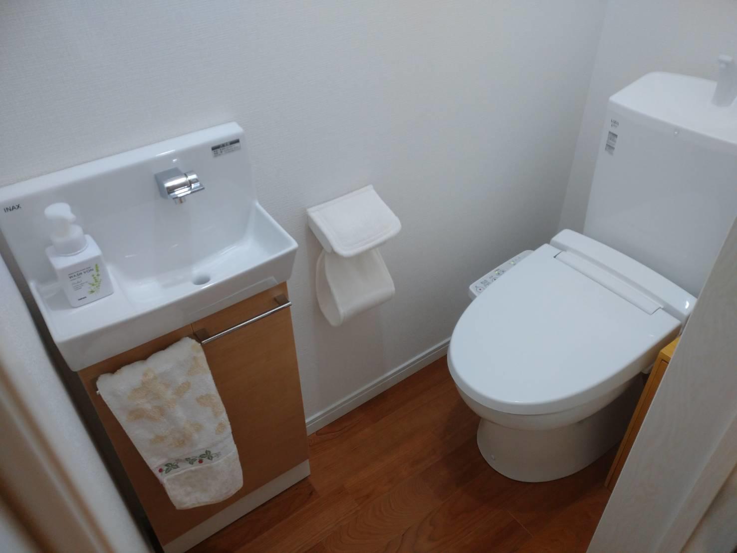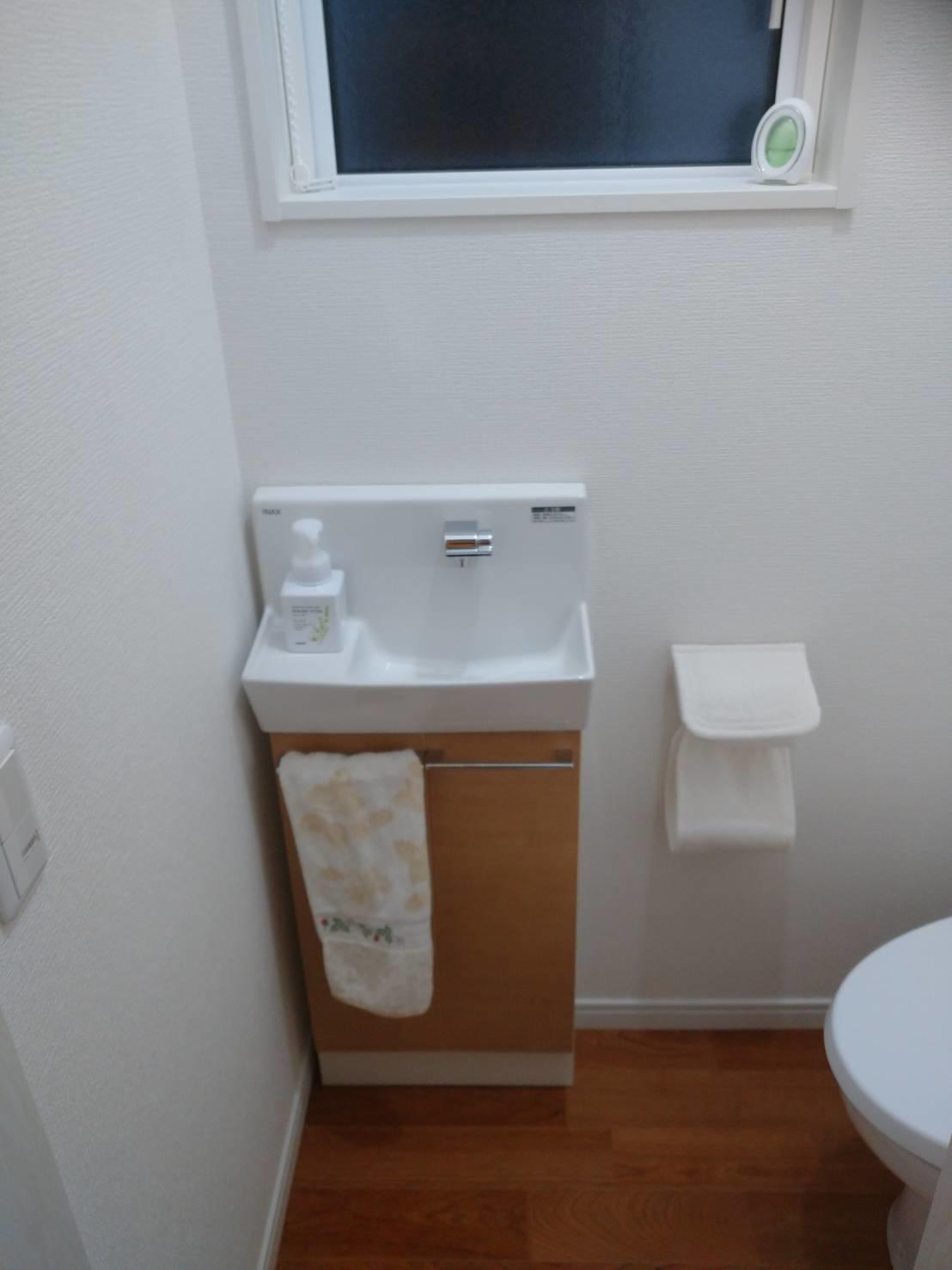 このお宅は築年数が浅くトイレもきれいでしたが、小さなお子様がいらっしゃって手洗器がなく不便だったようで、今回付けました。 ちょっとした掃除用品も収納できるようにキャビネットタイプにしました。