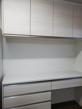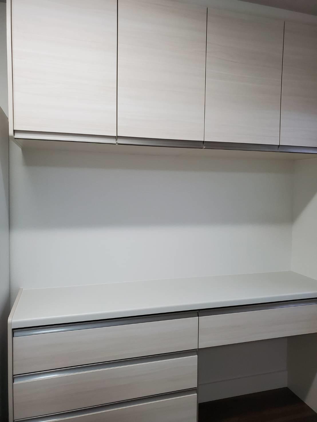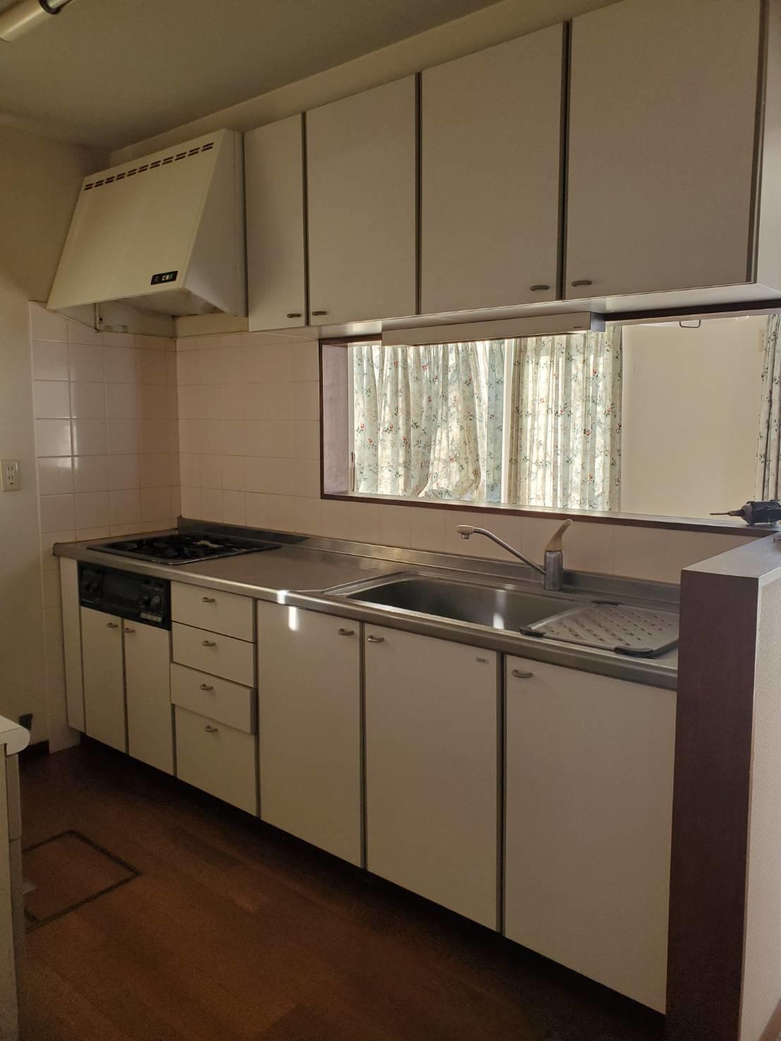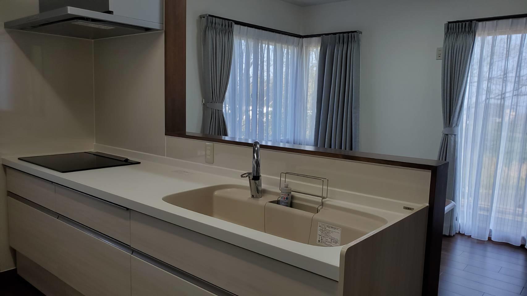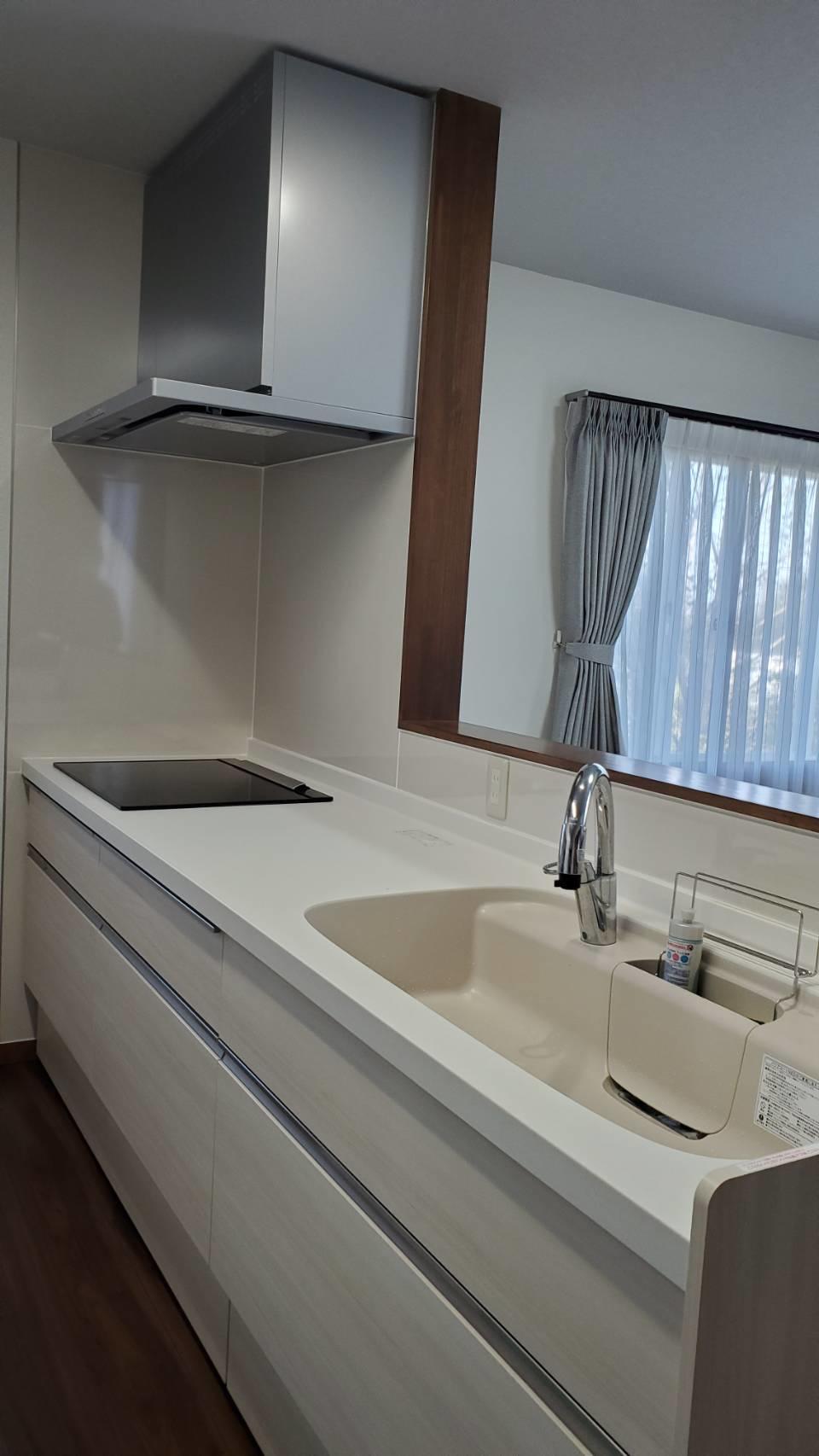 白系のシンプルデザインで統一されたキッチンになりました。主婦の嫌いなレンジフードのお手入れを簡単にした『よごれんフード』を入れました。背面収納は扉カラーを合わせた物にしスッキリしました。