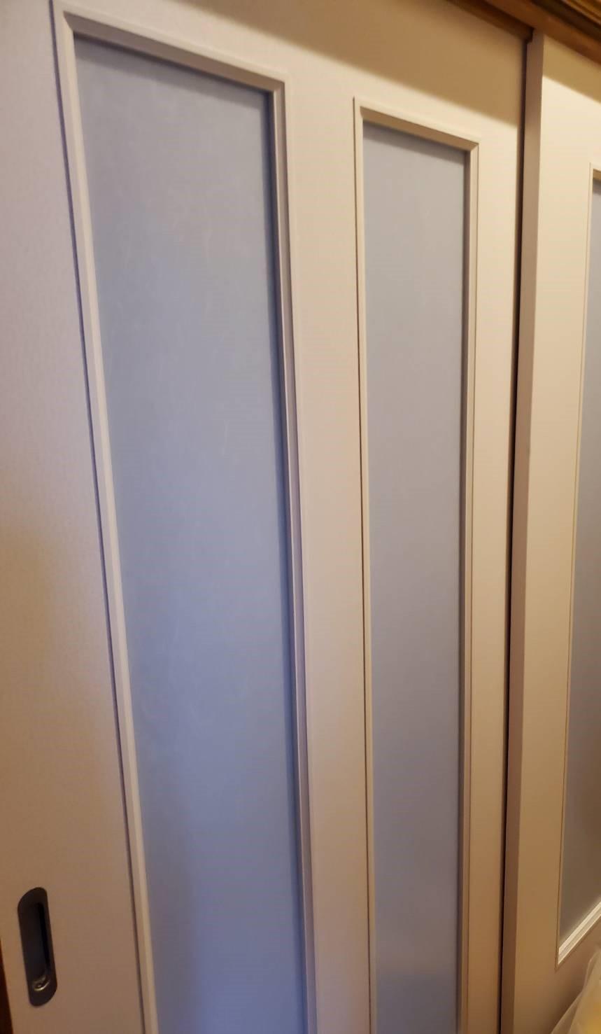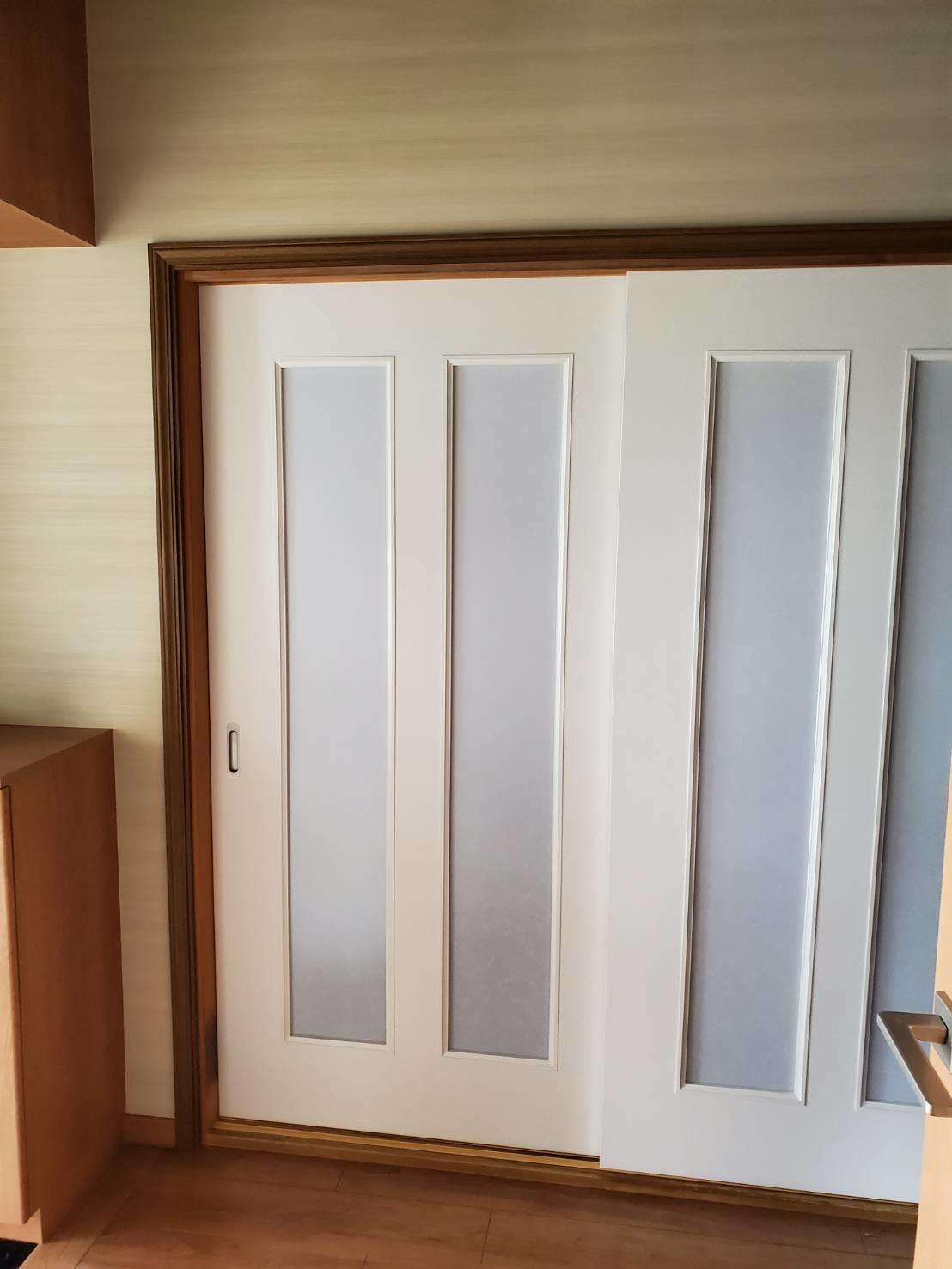 お施主様がネコを飼っていらしゃるので木製引戸にメラミン化粧板を貼り、スリット部はすりガラス風のアクリル板をはめ込み強化しました。 メラミン化粧板はデザイン豊富で、インテリアに合わせて選ぶことができます。