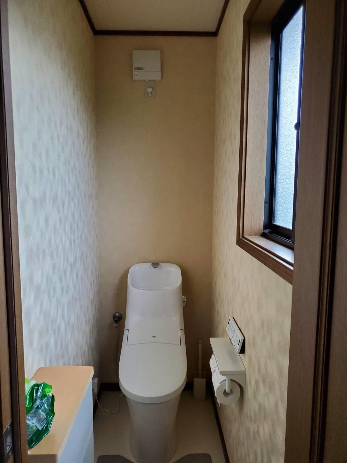 クロスにもこだわりワントーン上げたので、明るい印象のトイレになりました。今回は窓がありますが、窓のないトイレにも明るい色のクロスは効果的だと思います。