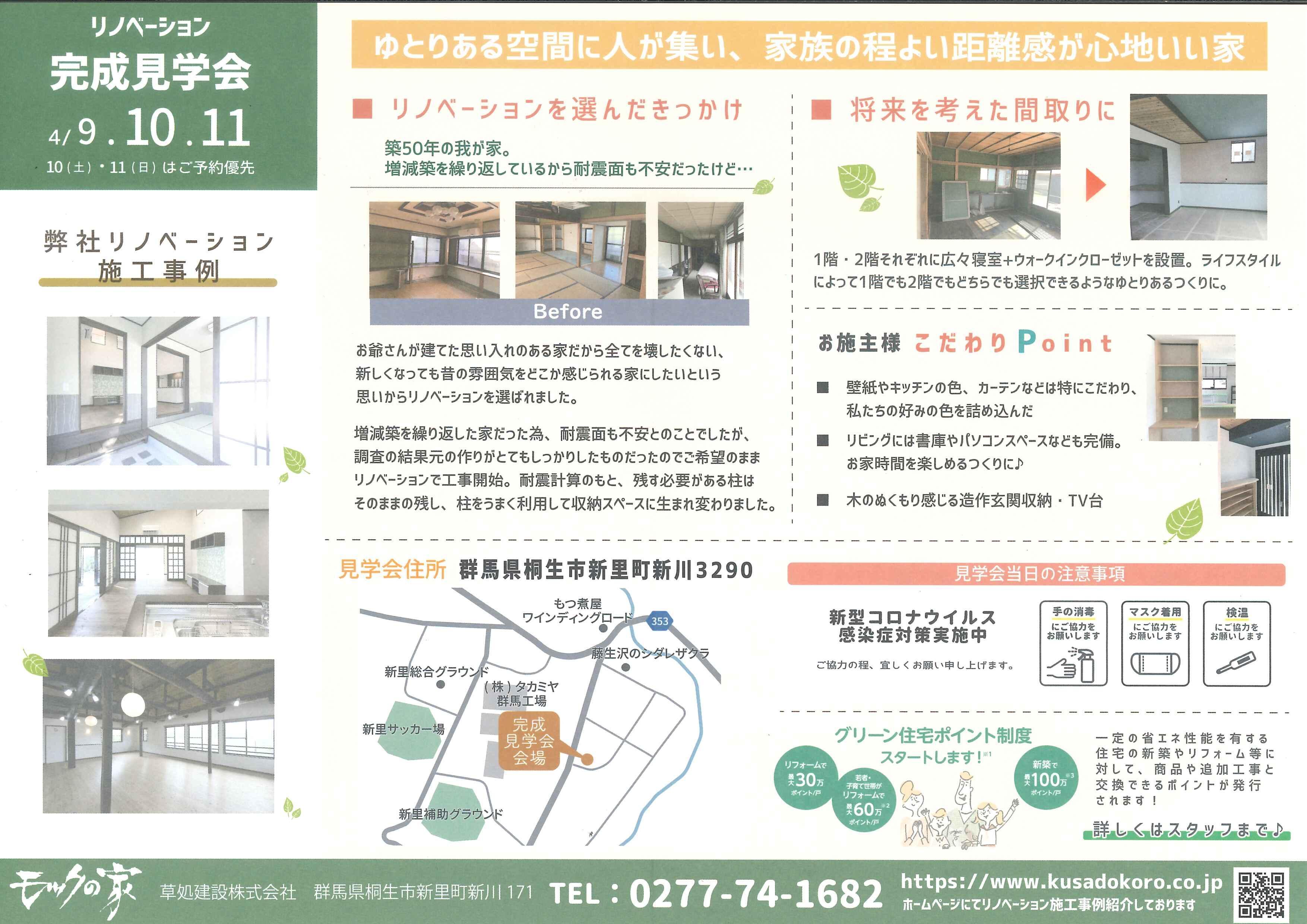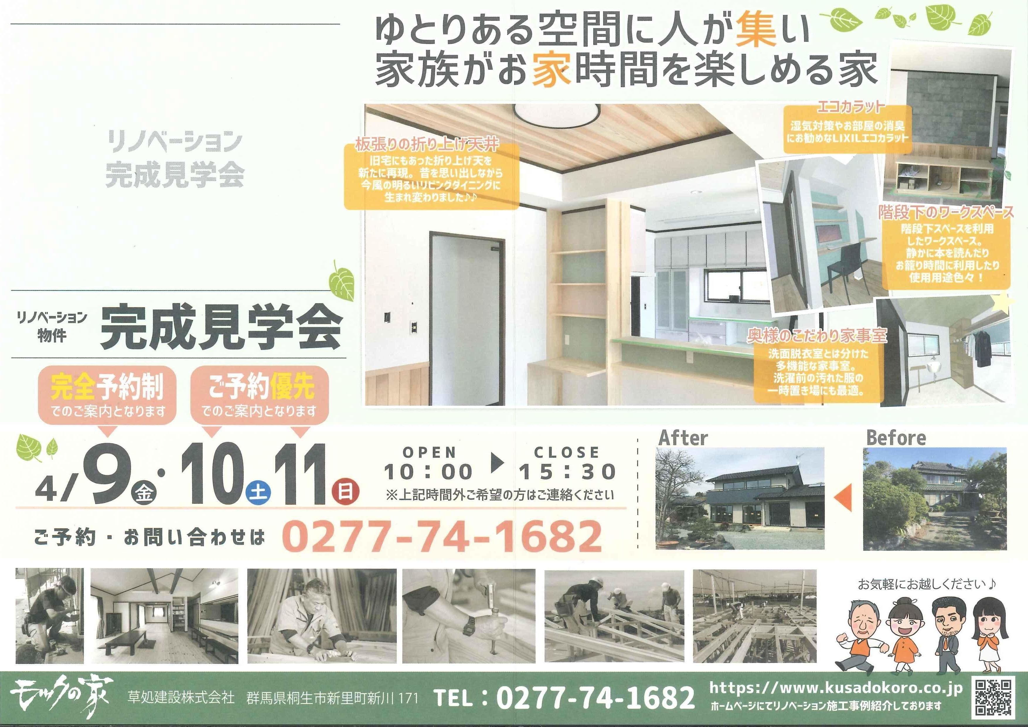 4/9(金)~4/11(日)に桐生市新里町で築50年の家をリノベーションした完成見学会を行います。4/9は完全予約制で、4/10、11