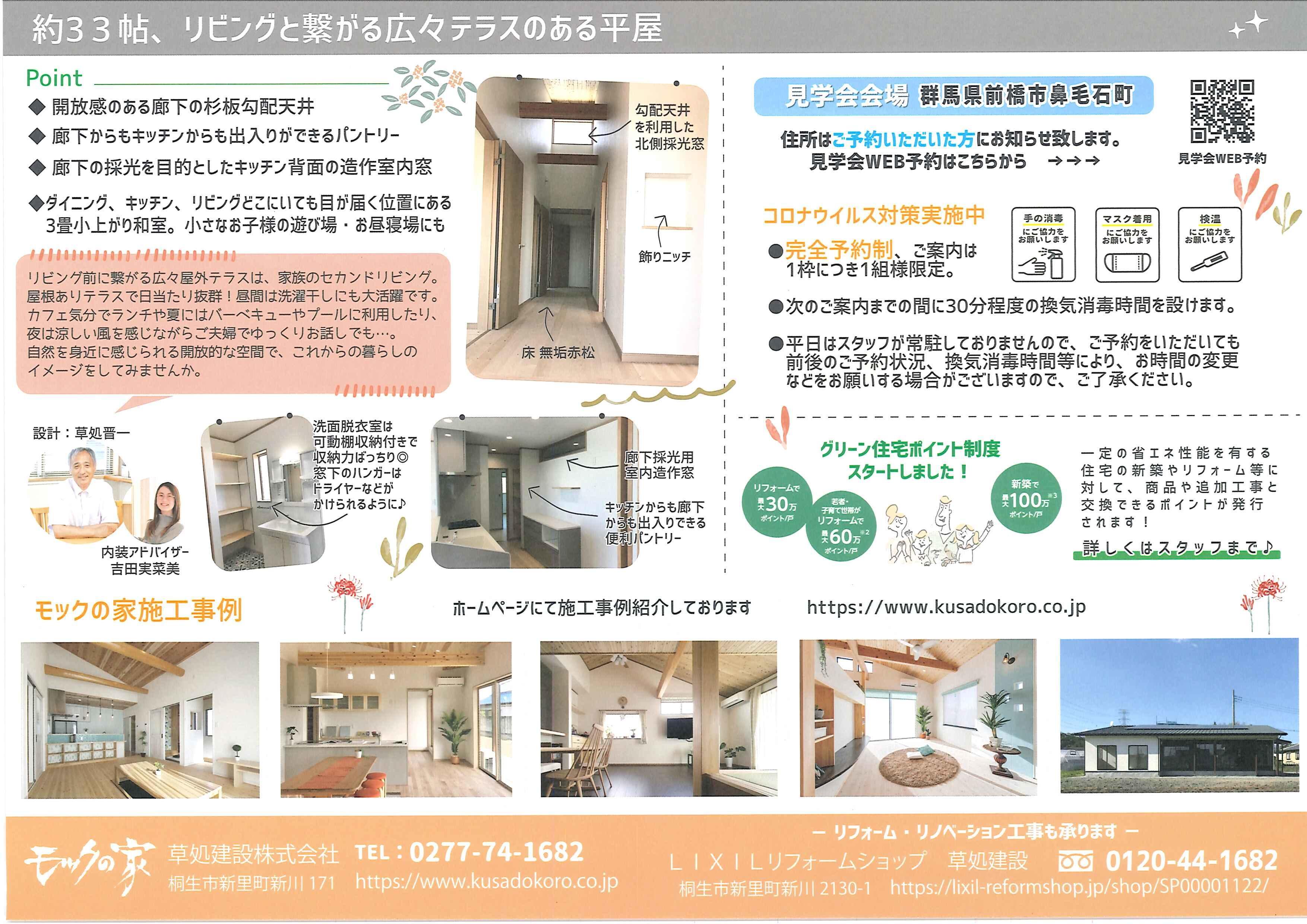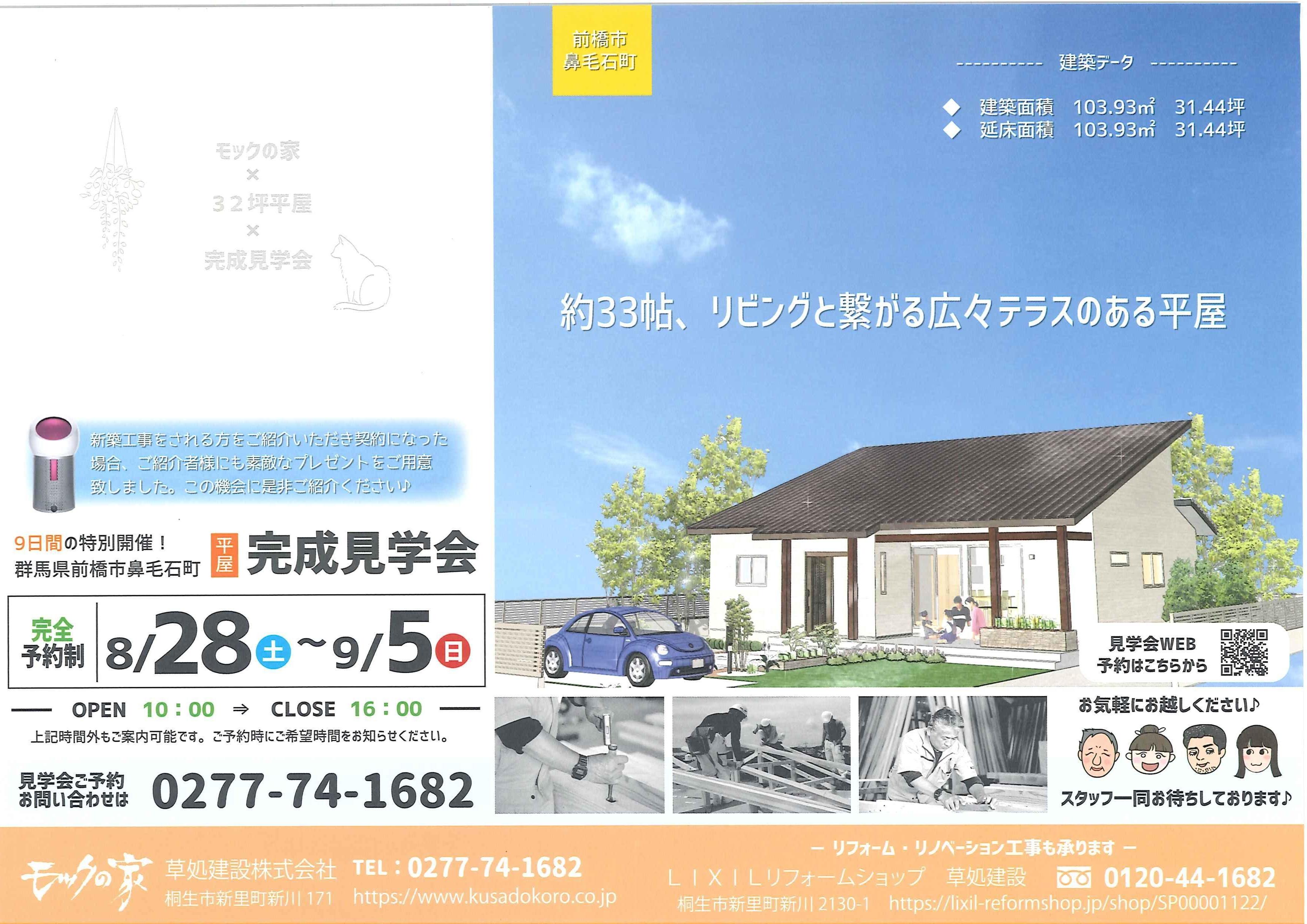 8/28㈯~9/5㈰、前橋市鼻毛石町で『リビングと繋がる広々テラスのある平屋』の完成見学会を行います。