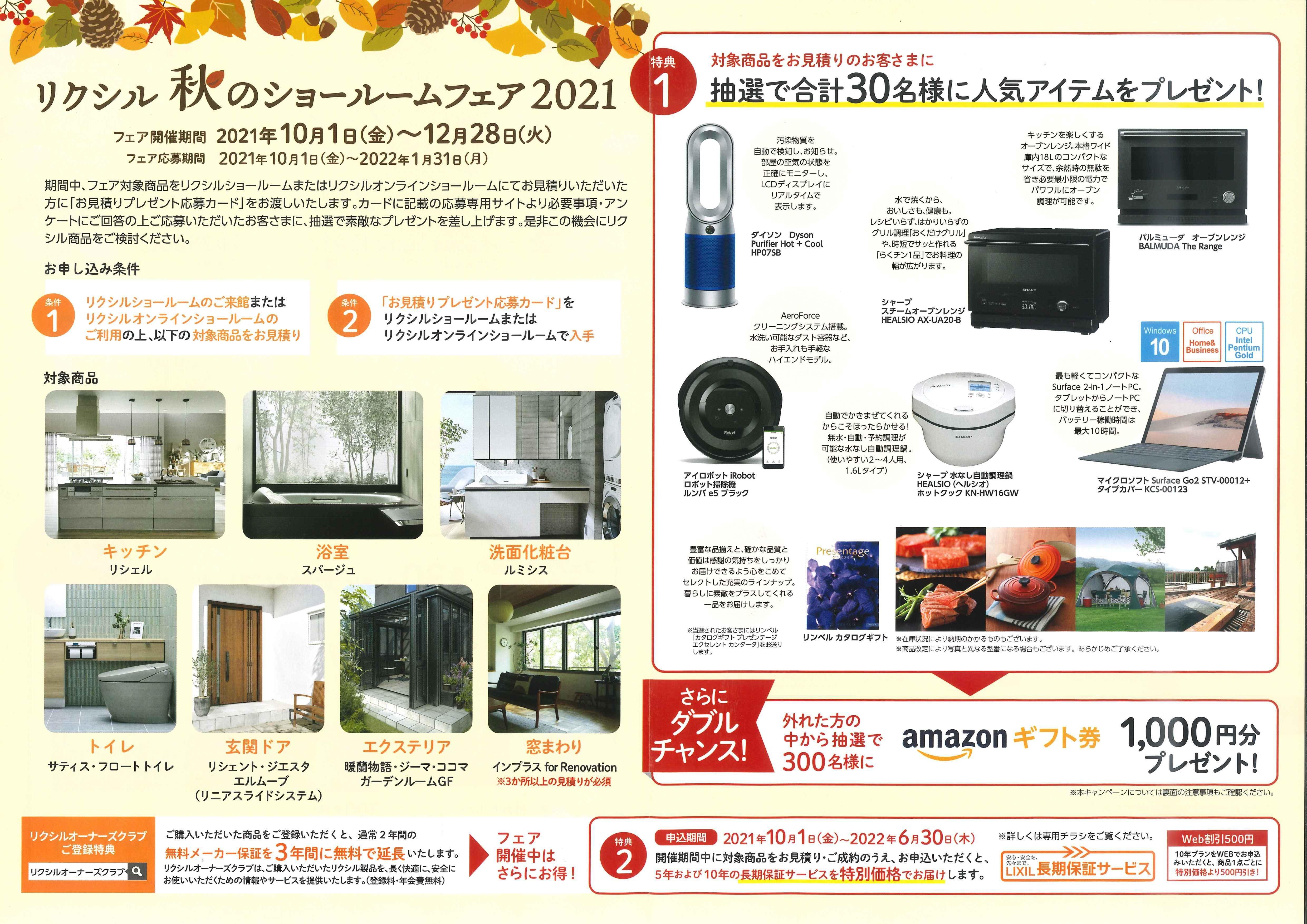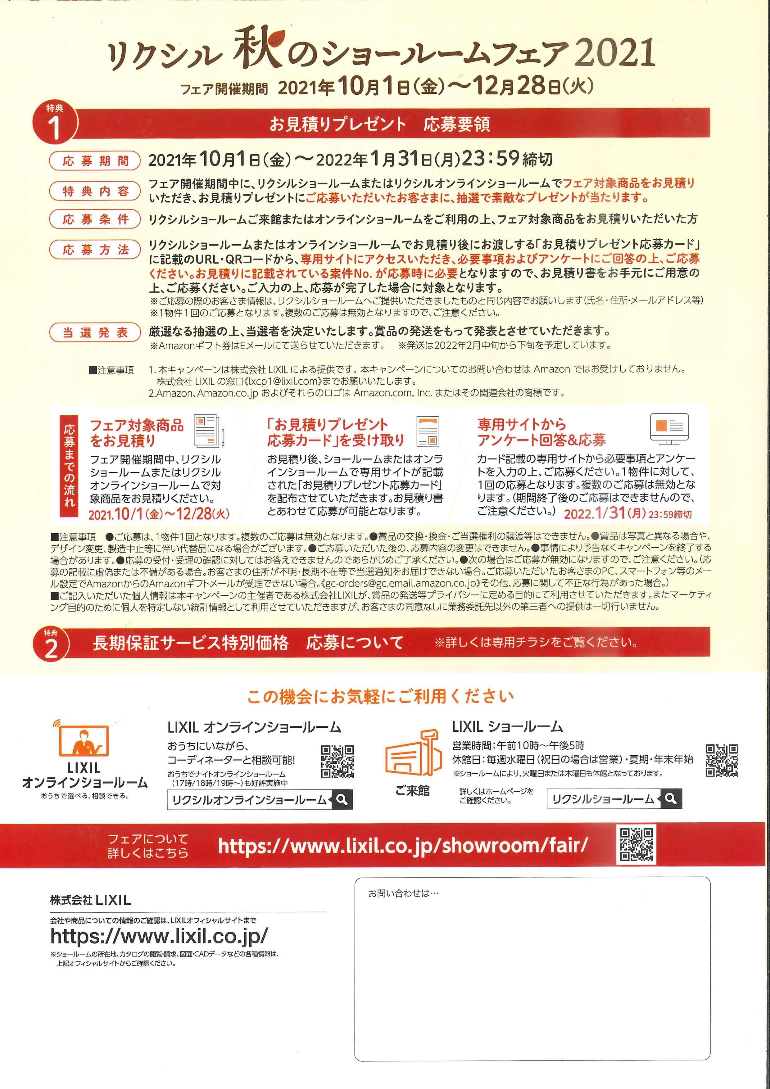 10/1~12/28の期間中、リクシルショールーム又はオンラインショールームにおいてお見積り頂いたお客様に、抽選で素敵なプレゼントを差し上げます。ぜひこの機会にリクシル商品をご検討下さい。