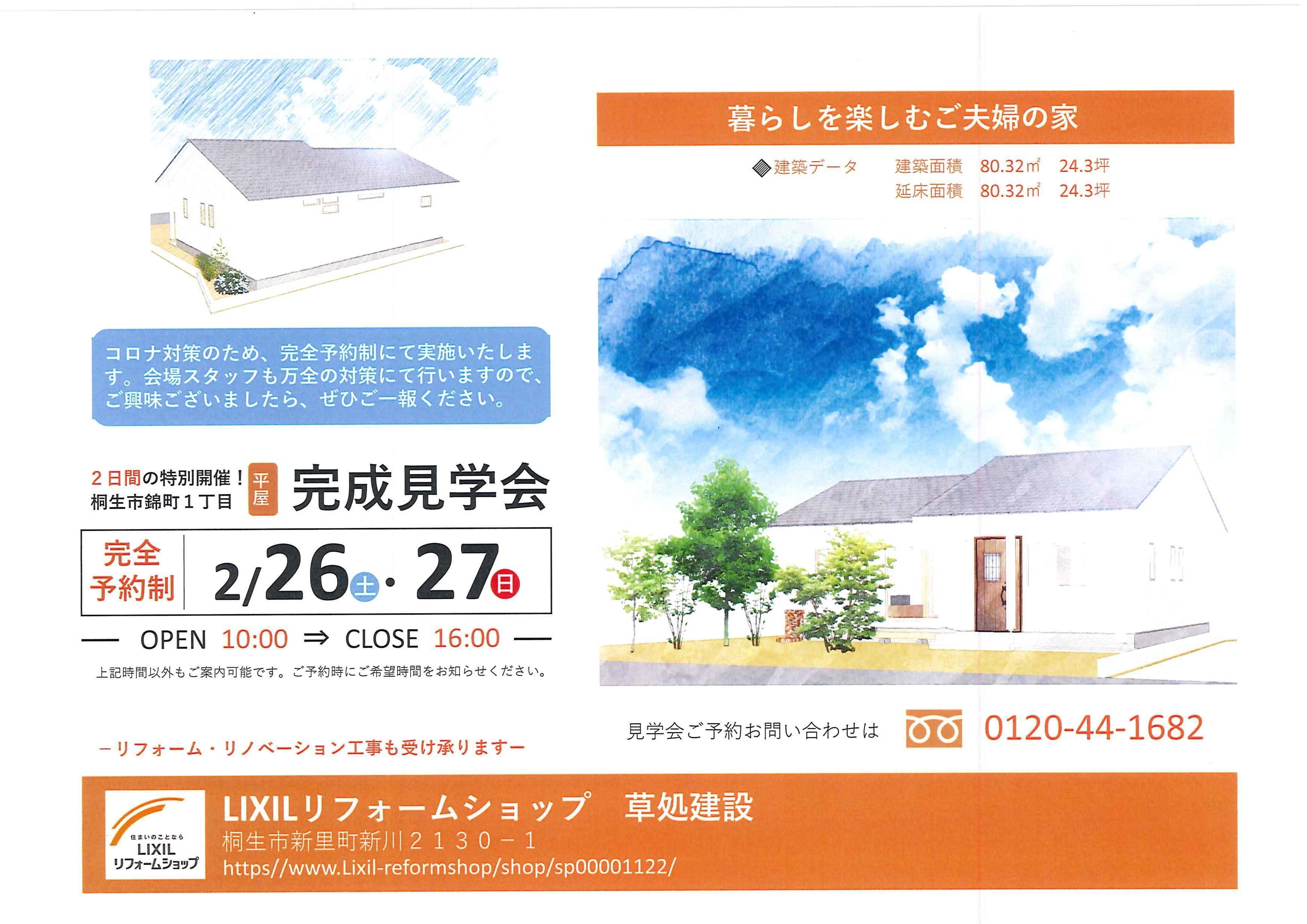 2/26(土),27(日)桐生市錦町1丁目で完成見学会を開催します。
