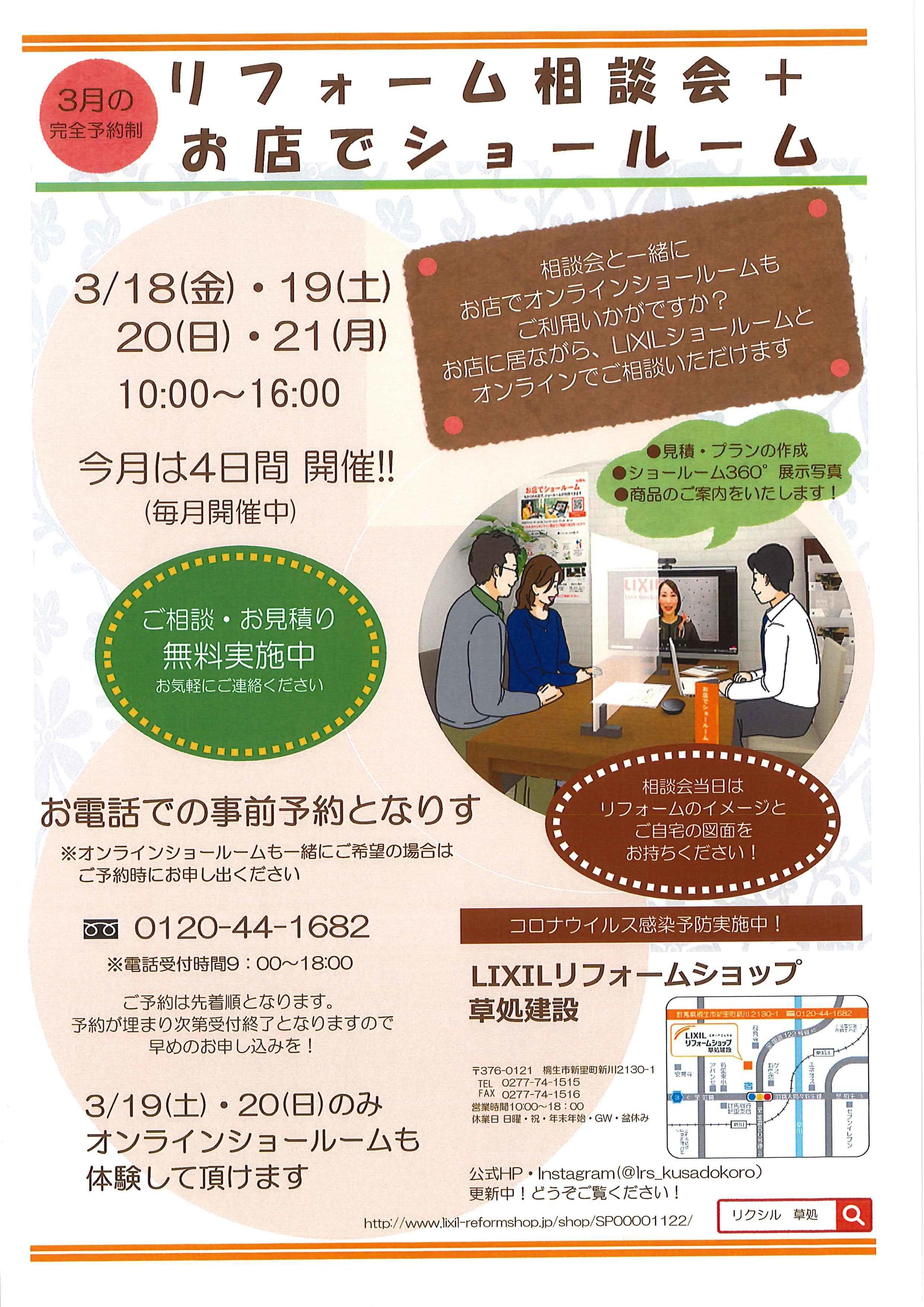3/18㈮~21㈪の4日間リフォーム相談会+お店でショールームを開催します