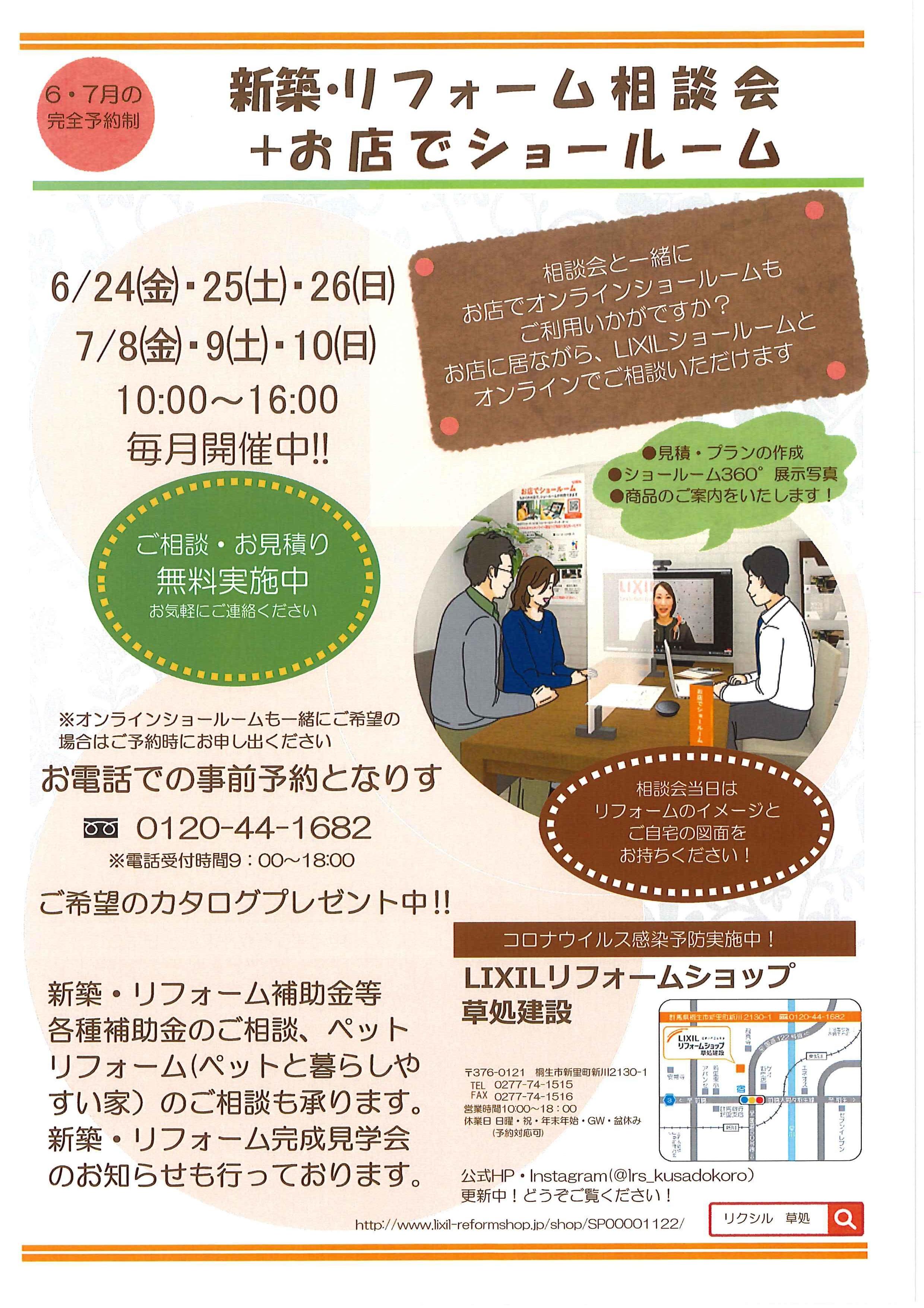 6/24㈮~26㈰、7/8㈮~10㈰に新築・リフォーム相談会+お店でショールームを開催いたします。