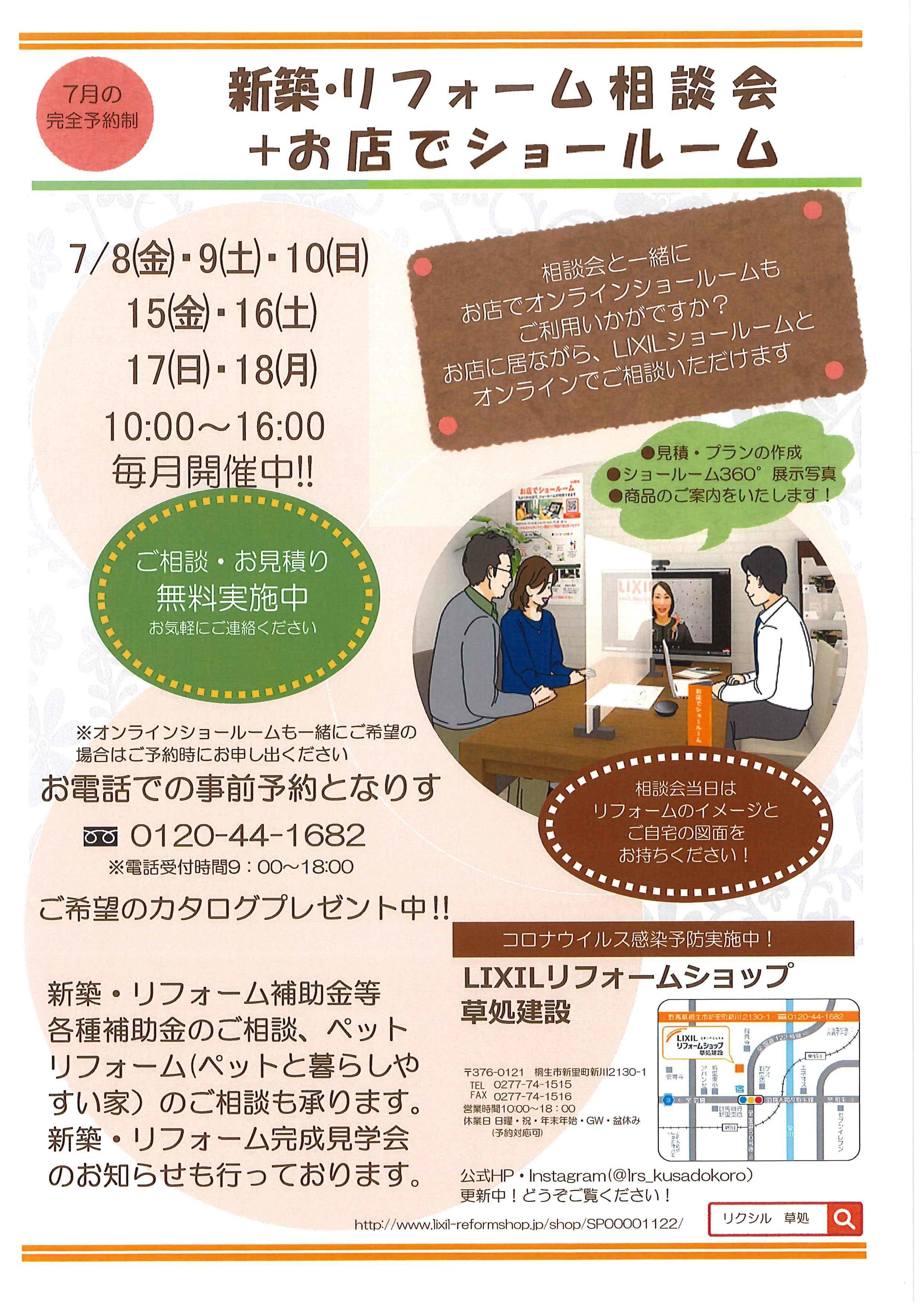 7/8㈮~10㈰、7/15㈮~18㈪に新築・リフォーム相談会+お店でショールームを開催します。