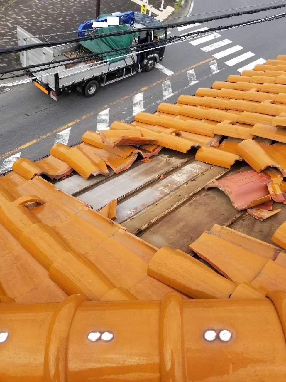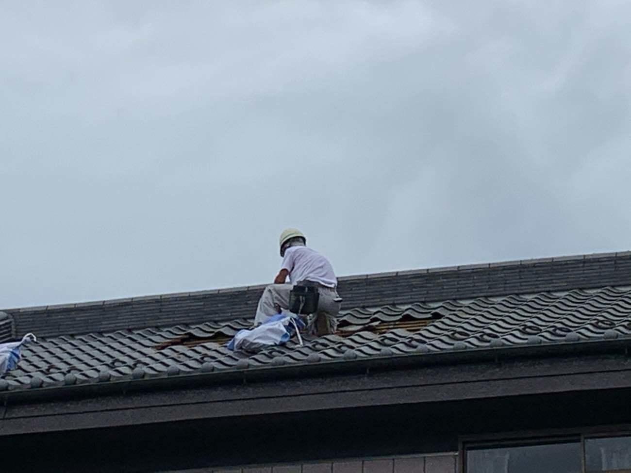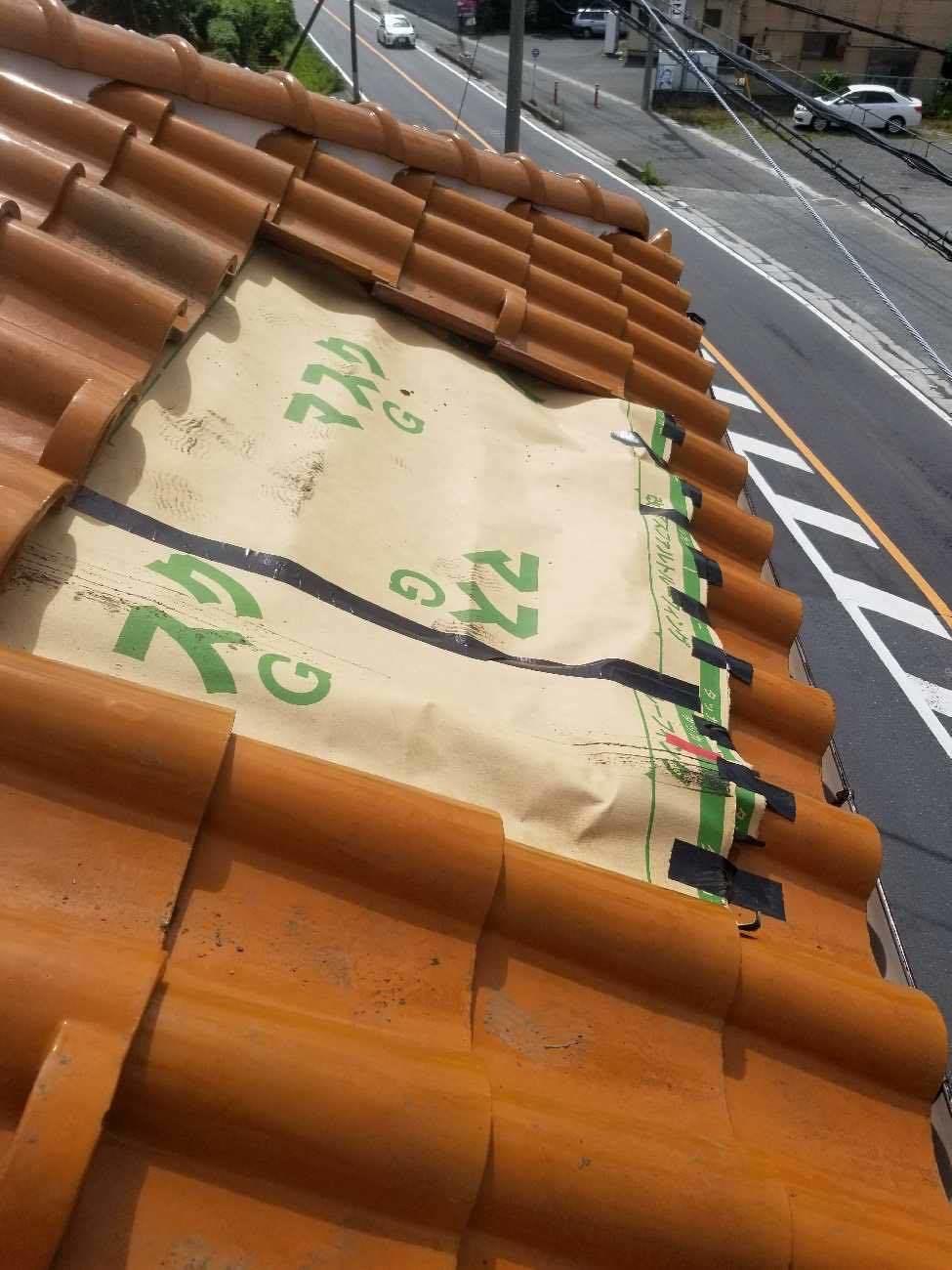 長い梅雨ということもあり、まずは屋根の養生です。雨が続くかもしれないのはスピードで対処します。被害を受けてますが瓦として用途を満たすものは私用させていただき、後ほど交換、瓦として用途を満たさないものは外して養生を行いました。