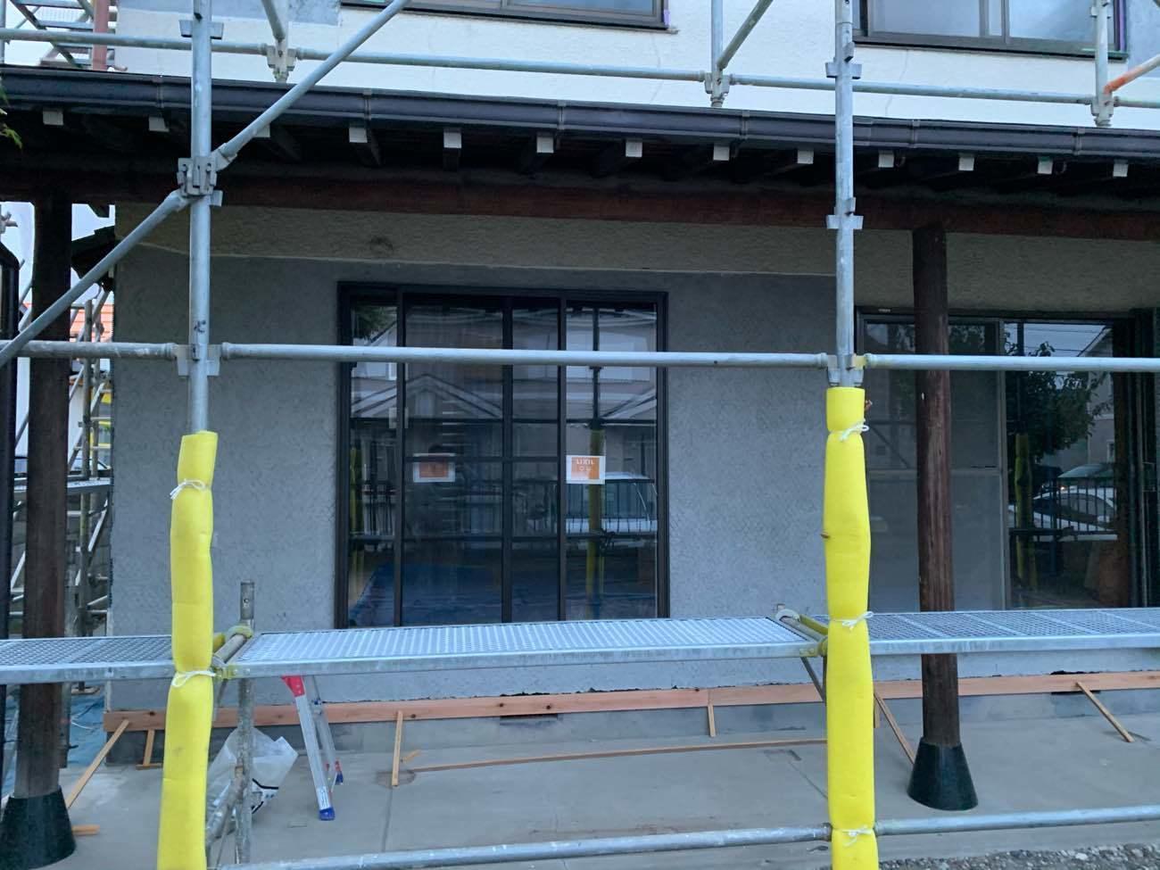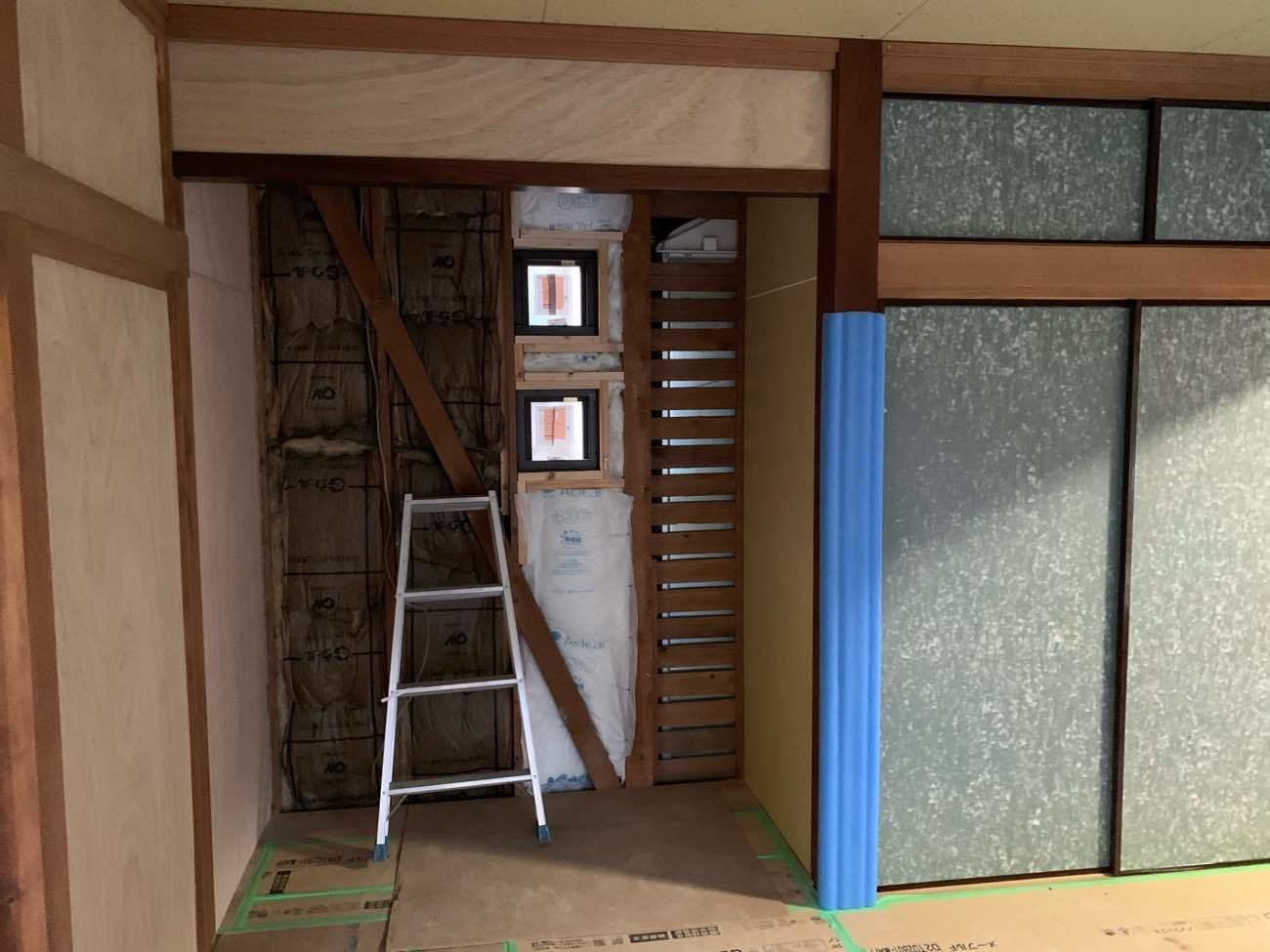 2階はクロス張りを行いました。クロスまで貼ると一気にお部屋らしくなりますね。1階は小窓が取りつき、外装工事は戸袋を外してモルタル施工をしました。