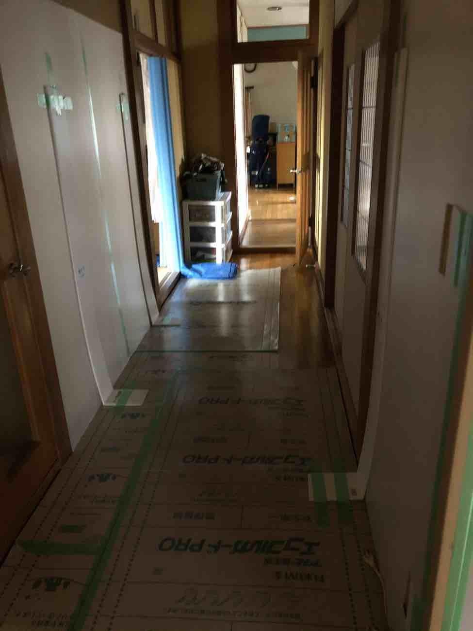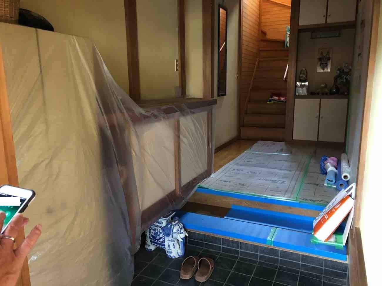 工事前の養生を行いました。お客様の大事なお家を傷つけないようしっかりと養生をします。