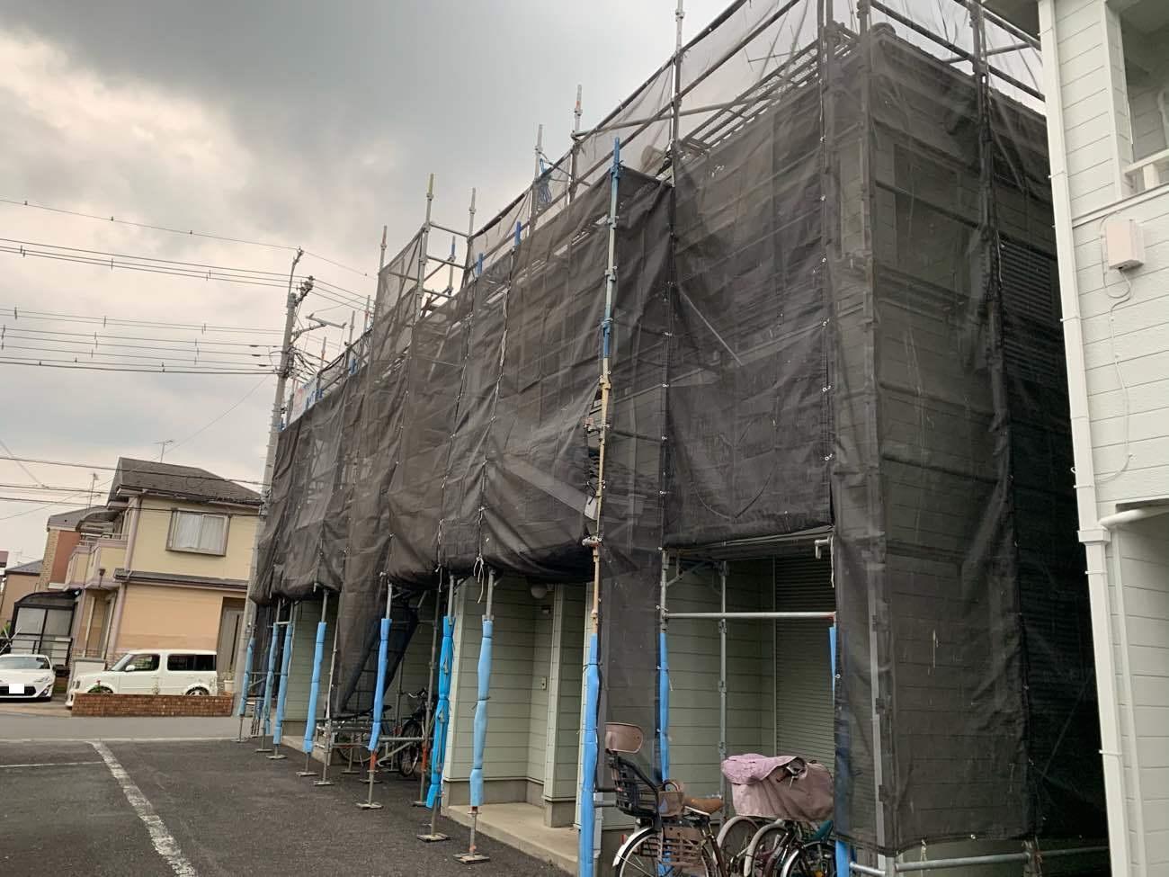 足場を組み、シートをつけて、看板シートを設置しました。工事に取り掛かります。