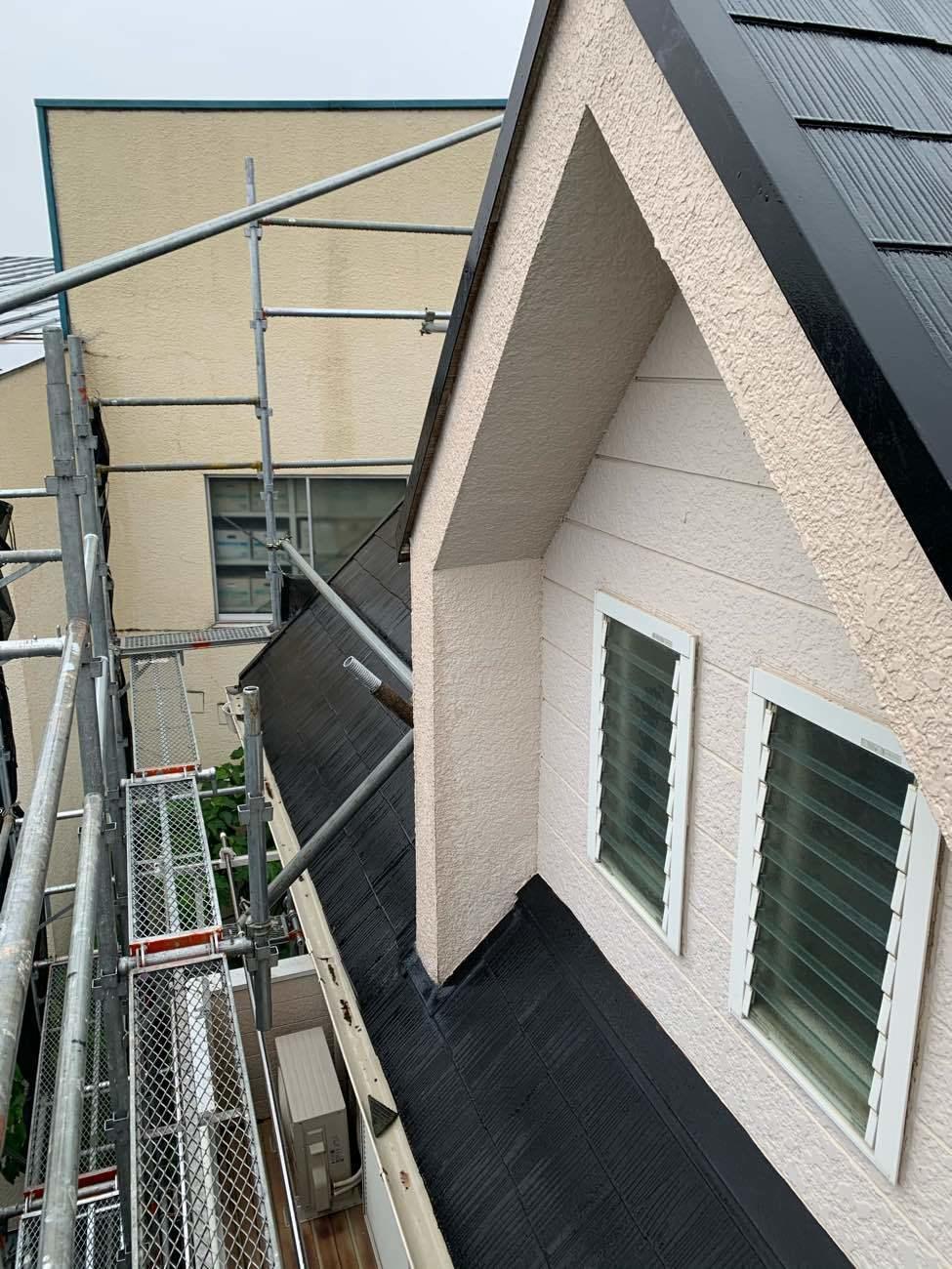 足場を組みました。台風が接近する予報でしたので台風養生で上部と四方は台風養生をしました。屋根の勾配があるので台風養生も行いました。