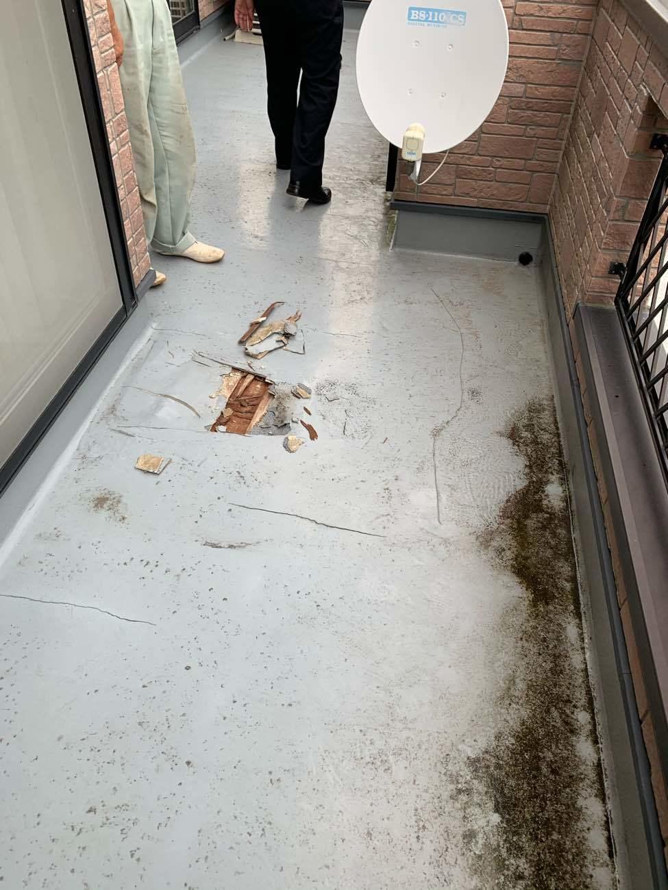 以前に他社様にてトップコートを行ったとのこと。バルコニーに水が入りプクプクと浮いていたり下地まで水が到達して下地が腐食していたりという状態でした。