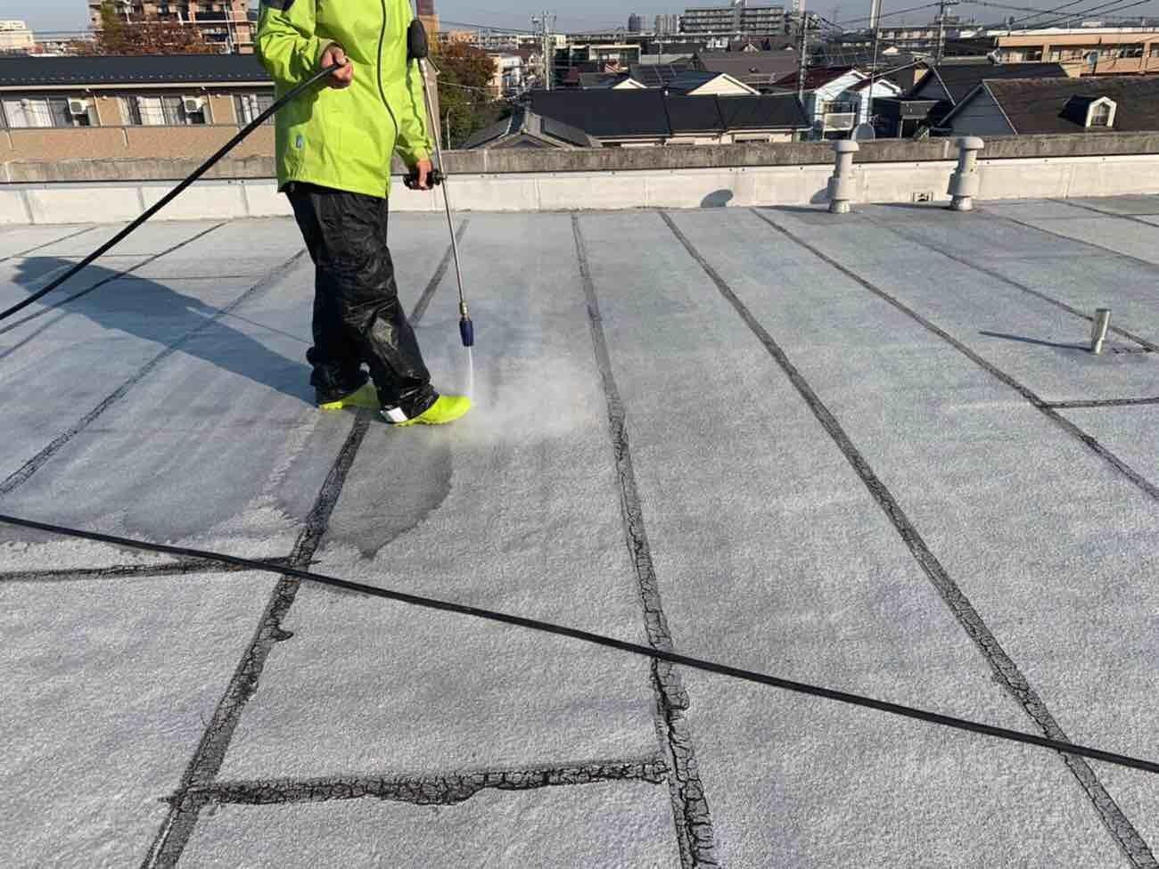 まずは屋上の洗浄を行っています。安全第一で工事をします。