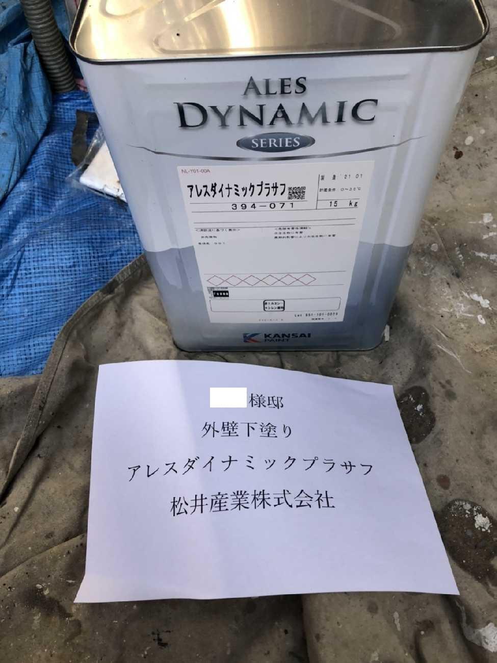 埼玉県北葛飾郡松伏町M様邸外壁塗装工事は下塗りです。アレスダイナミックプラサフを使用します。