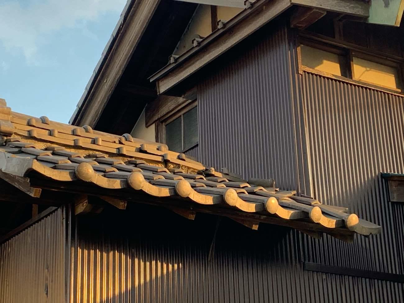 納屋のトイレを新しくし気持ちよく使用されたいというご要望です。風雨で破損している天井を修理、瓦は金属製の軽い材質のものにします。天井壁を張り替えて床は土間を打ってリンクストーンで仕上げます。床を洗えるようにしたいというご要望です。