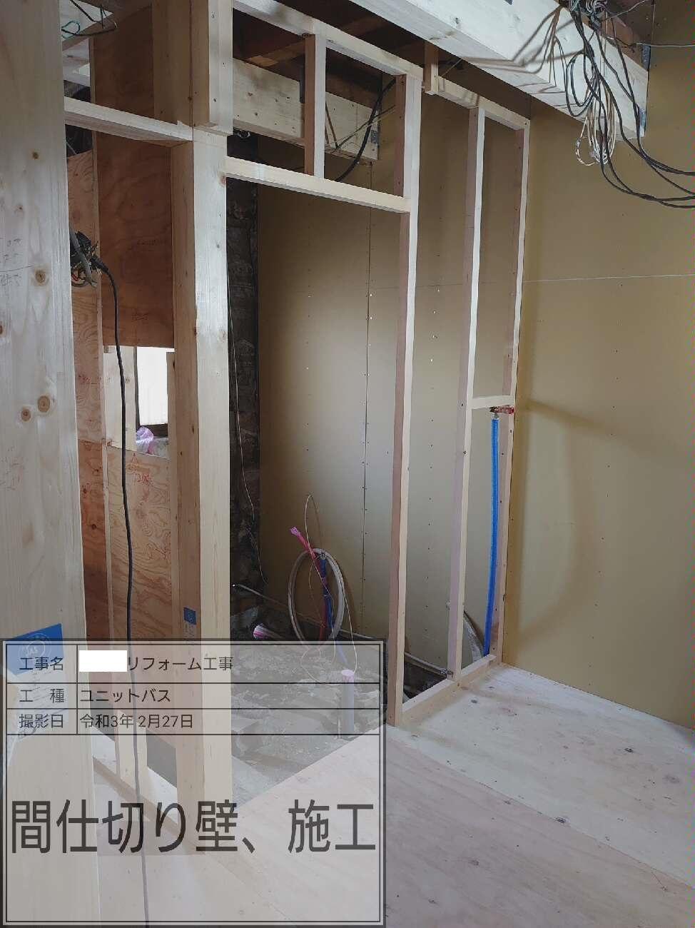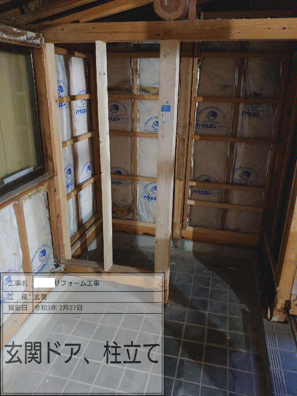 玄関の位置を移動するため柱を入れたのと、ユニットバス工事をするための間仕切りを設置しました。