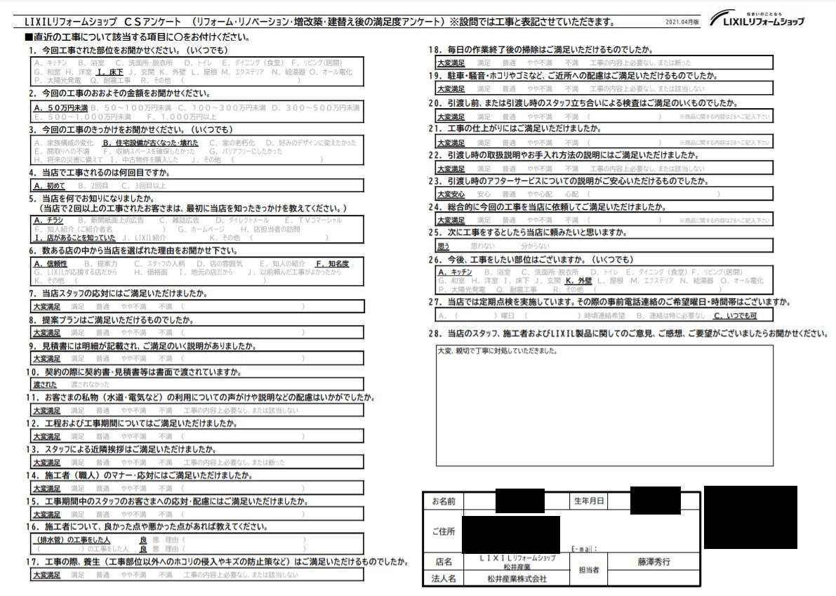 埼玉県吉川市Y様邸キッチン床配管修繕工事アンケートをいただきました。